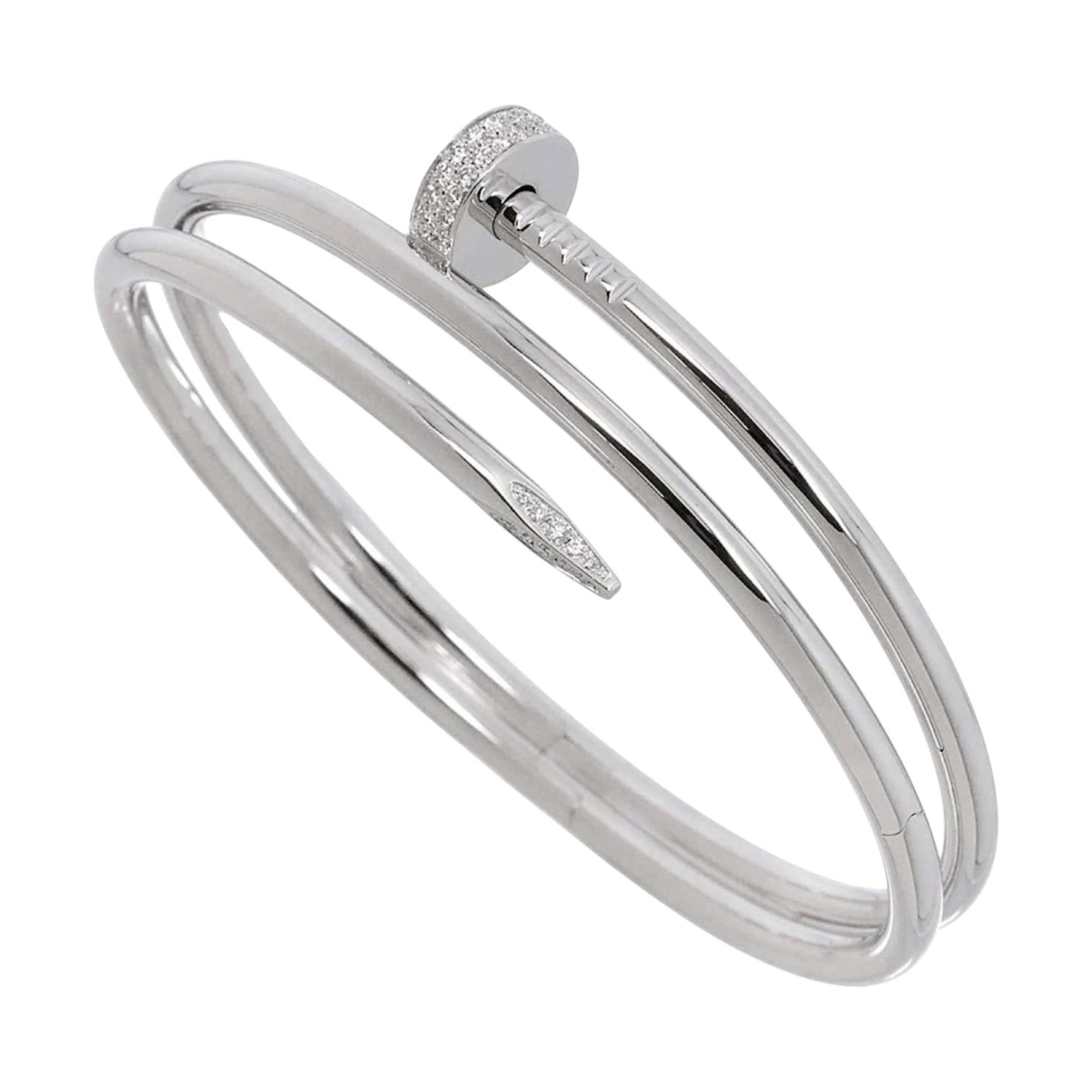 This stunning Cartier Juste Un Clou bracelet reimagines the elegance of a simple nail into a symbol of bold sophistication. Crafted in 18k white gold, the double wrap design coils gracefully around the wrist, accented with a diamond-paved head and tip for a touch of refined brilliance. A modern icon of rebellious luxury, this piece perfectly embodies Cartier’s blend of innovation and timeless craftsmanship.