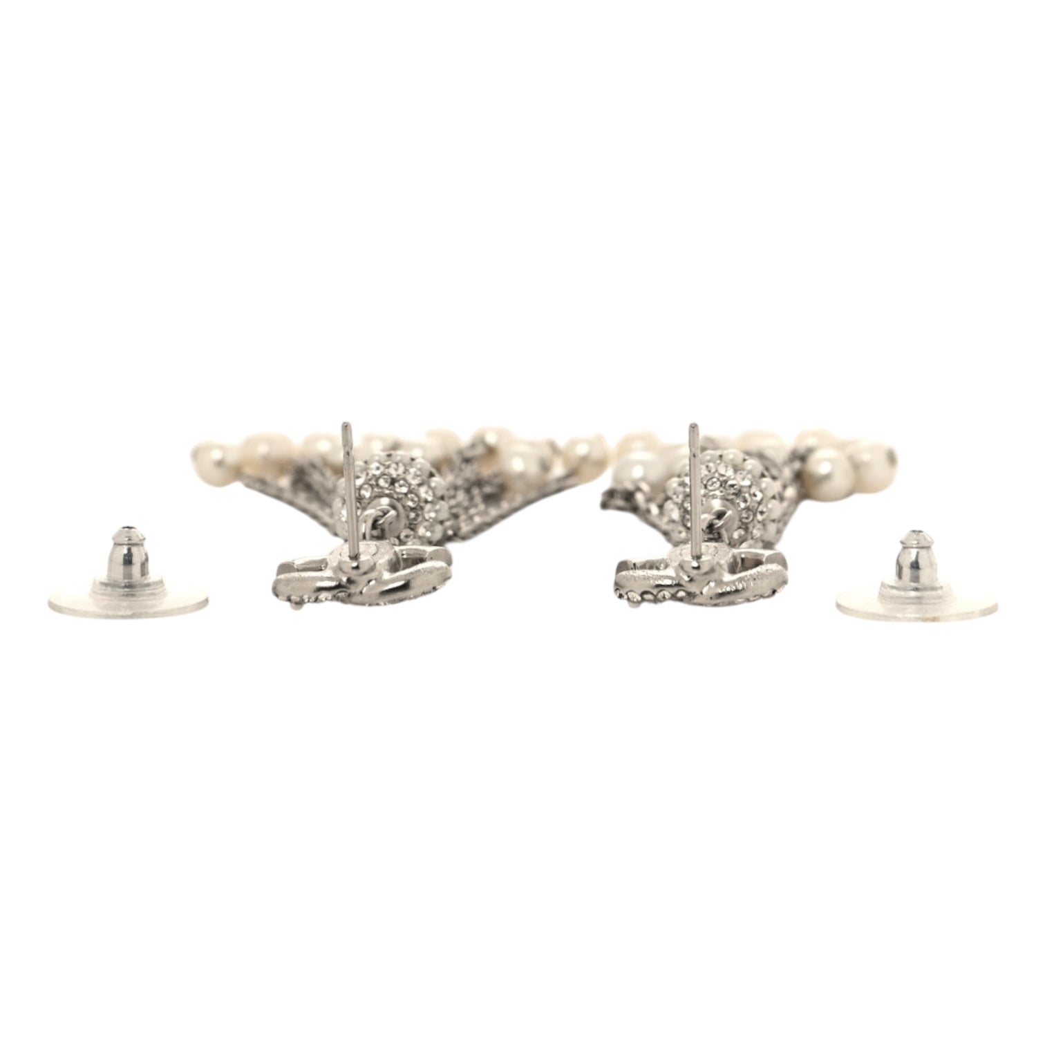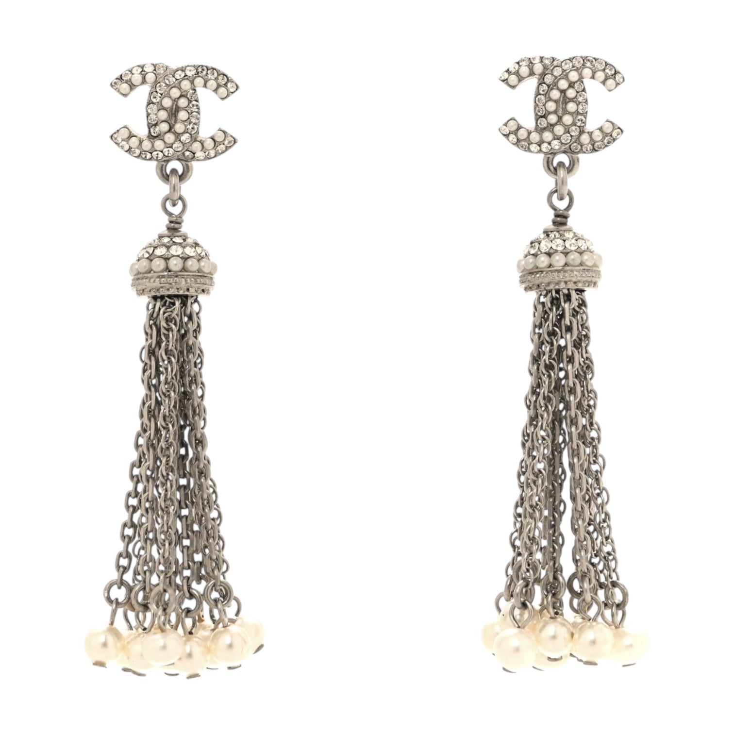 Add a touch of Chanel elegance with these stunning drop earrings from the 2018 collection. Crafted in silver-tone metal, the earrings feature the iconic crystal-embellished CC logo, leading into cascading tassels of fine chains adorned with luminous faux pearls. Chic yet dramatic, this design captures Chanel’s timeless allure — perfect for elevating both evening looks and sophisticated daywear.