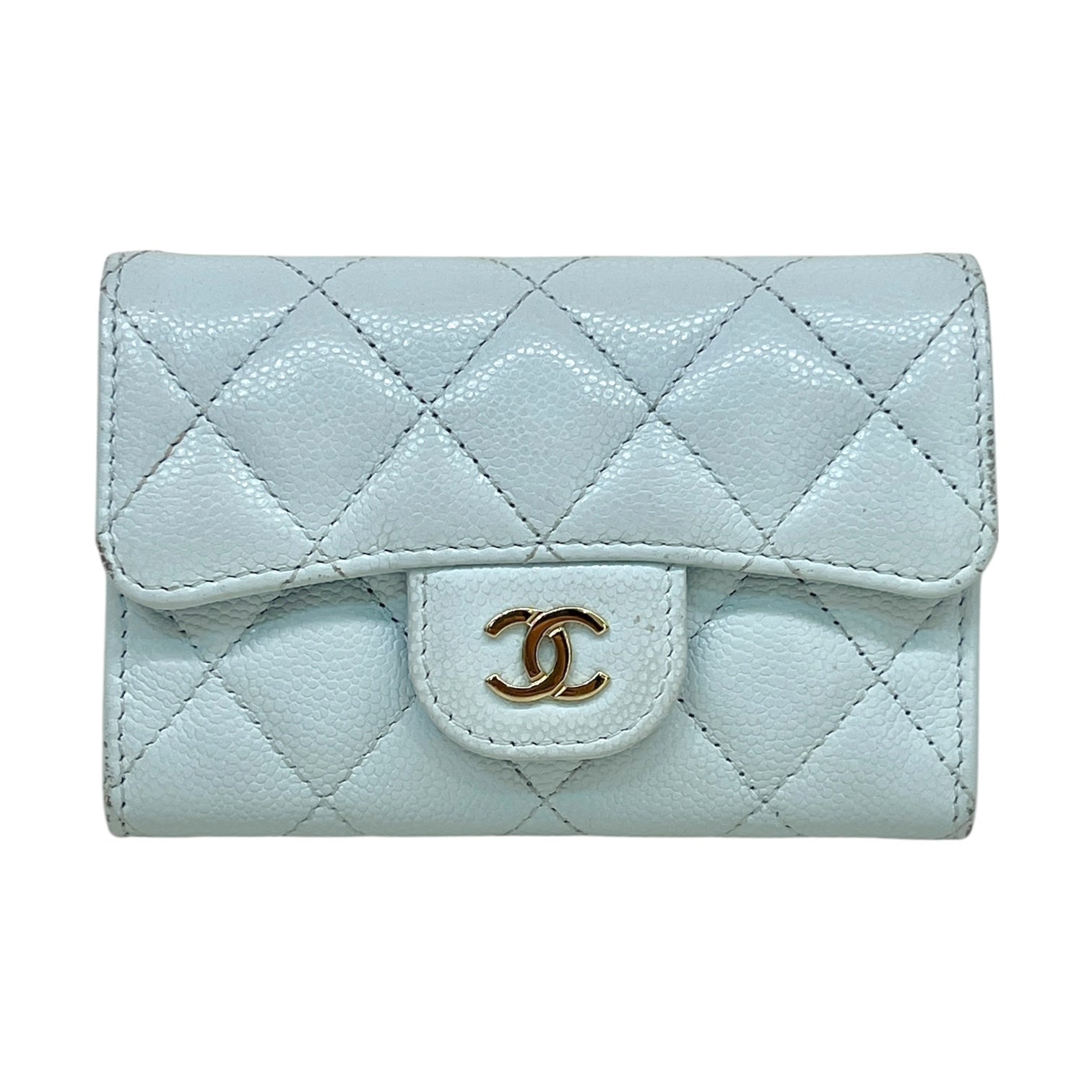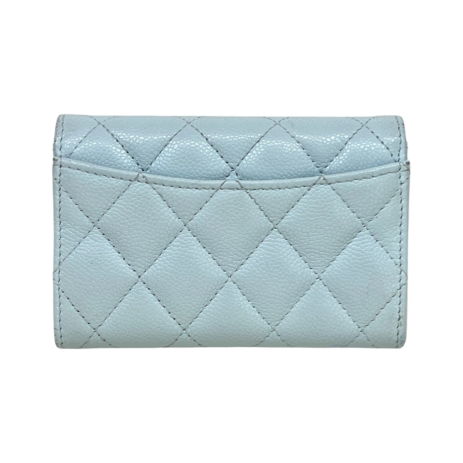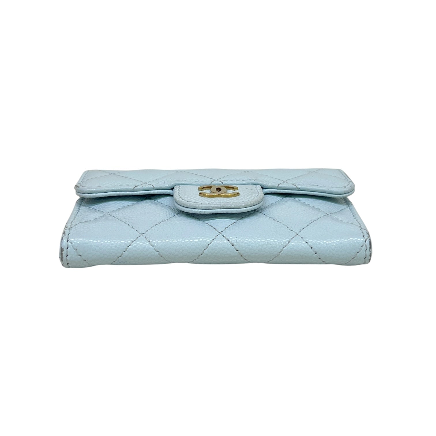 A timeless classic with a fresh twist, this Chanel Light Blue Caviar Quilted Flap Card Holder Wallet is the perfect balance of elegance and practicality. Crafted from durable caviar leather in a soft light blue hue, it features the signature diamond quilted design and a front flap closure adorned with the gold-tone CC logo.