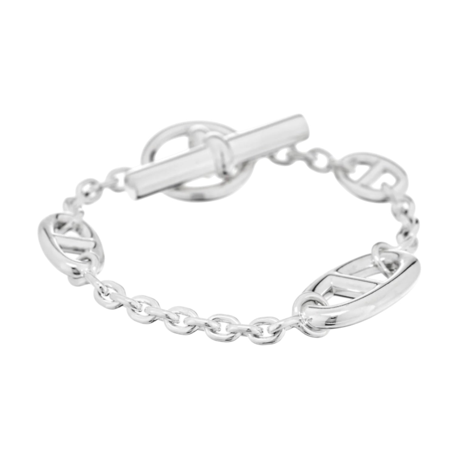 Crafted in gleaming sterling silver, the Hermès Farandole Bracelet captures the house’s timeless elegance and equestrian heritage. This refined piece features signature Chaîne d’Ancre links and a sleek toggle clasp, balancing strength with sophistication. A true Hermès icon, it’s perfect for layering or wearing alone as an effortlessly chic statement of luxury.