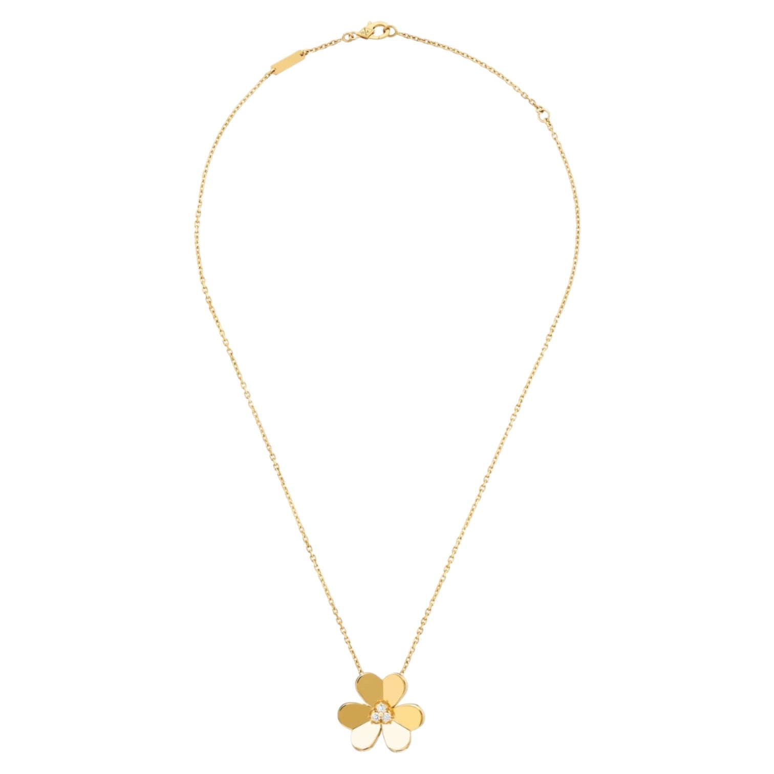 A radiant creation from Van Cleef & Arpels’ iconic Frivole collection, this Large Model pendant is beautifully crafted in 18K yellow gold. The delicate heart-shaped petals are polished to a mirror finish, reflecting light with every movement. At the center, a single brilliant-cut diamond adds a touch of sparkle, enhancing the flower’s natural elegance. Suspended from a fine gold chain, this timeless jewel embodies femininity and sophistication, perfect for everyday wear or special occasions.
