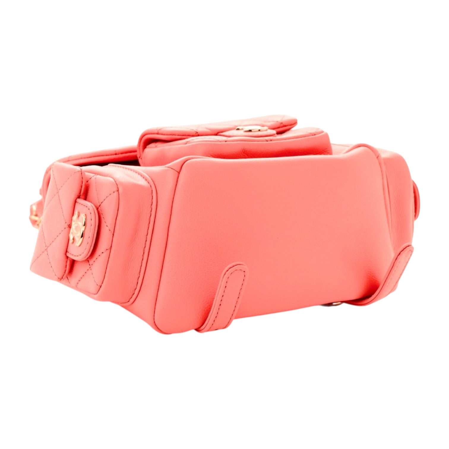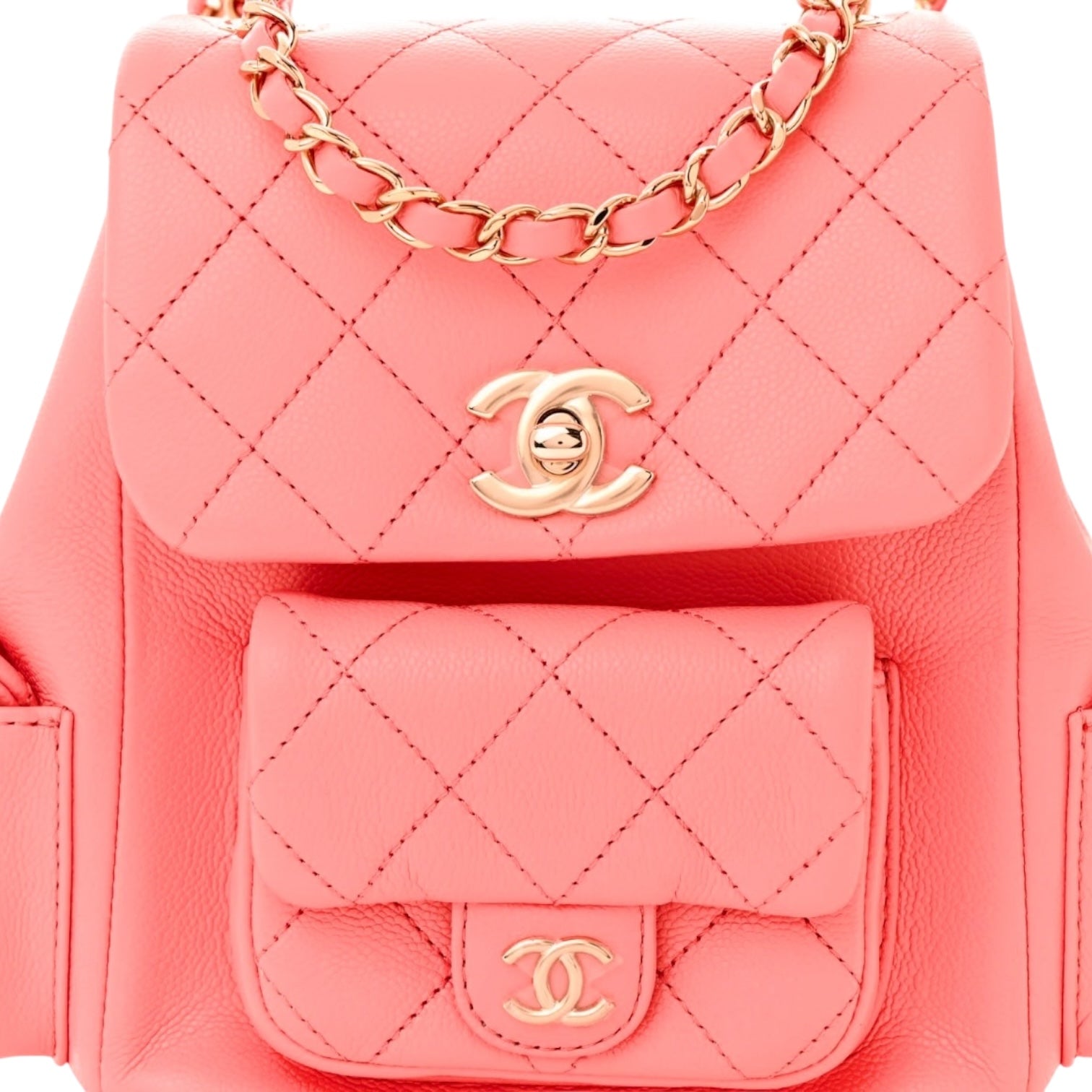 A playful yet elegant take on a house classic, this Chanel backpack is crafted from luxurious shiny pink caviar leatherwith the iconic diamond quilting. The design features a drawstring closure with a flap top, accented by the signature interlocking CC in gold-tone hardware. Multiple exterior pockets add both charm and practicality, while the adjustable leather-and-chain straps offer versatile styling. A rare and youthful piece that blends Chanel’s timeless craftsmanship with a modern, functional edge.