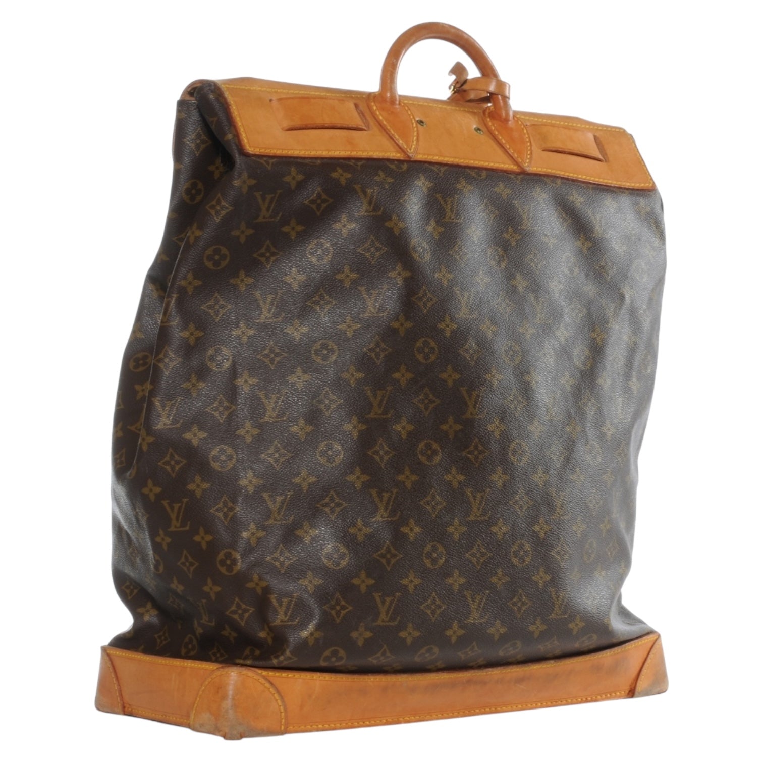 The bag features a flap top with a buckle strap and brass lock closure, ensuring both security and elegance. Its spacious interior makes it ideal for travel or as a statement piece for everyday style. Finished with reinforced leather corners and top handle, this piece carries the spirit of Louis Vuitton’s iconic travel legacy.
