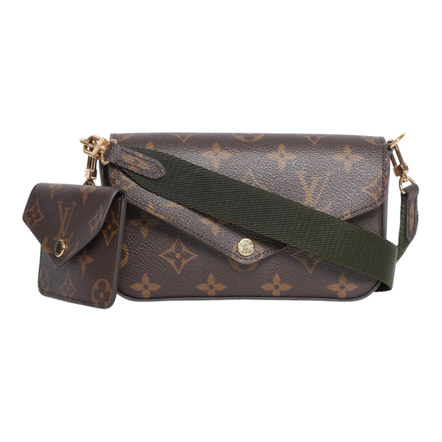 Crafted from Louis Vuitton’s iconic brown monogram canvas, this Felicie Strap & Go crossbody bag perfectly blends modern functionality with classic elegance. The bag features a structured envelope-style flap secured by a gold-tone snap button closure, revealing a spacious interior ideal for everyday essentials. Attached to the adjustable khaki canvas strap is a detachable coin pouch, adding versatility and a contemporary street-style edge. The monogram canvas is complemented by fine cowhide leather trims and gold hardware, showcasing Louis Vuitton’s expert craftsmanship. Designed for practicality and effortless sophistication, this stylish crossbody can be worn across the body, on the shoulder, or carried as a clutch for day-to-night versatility.