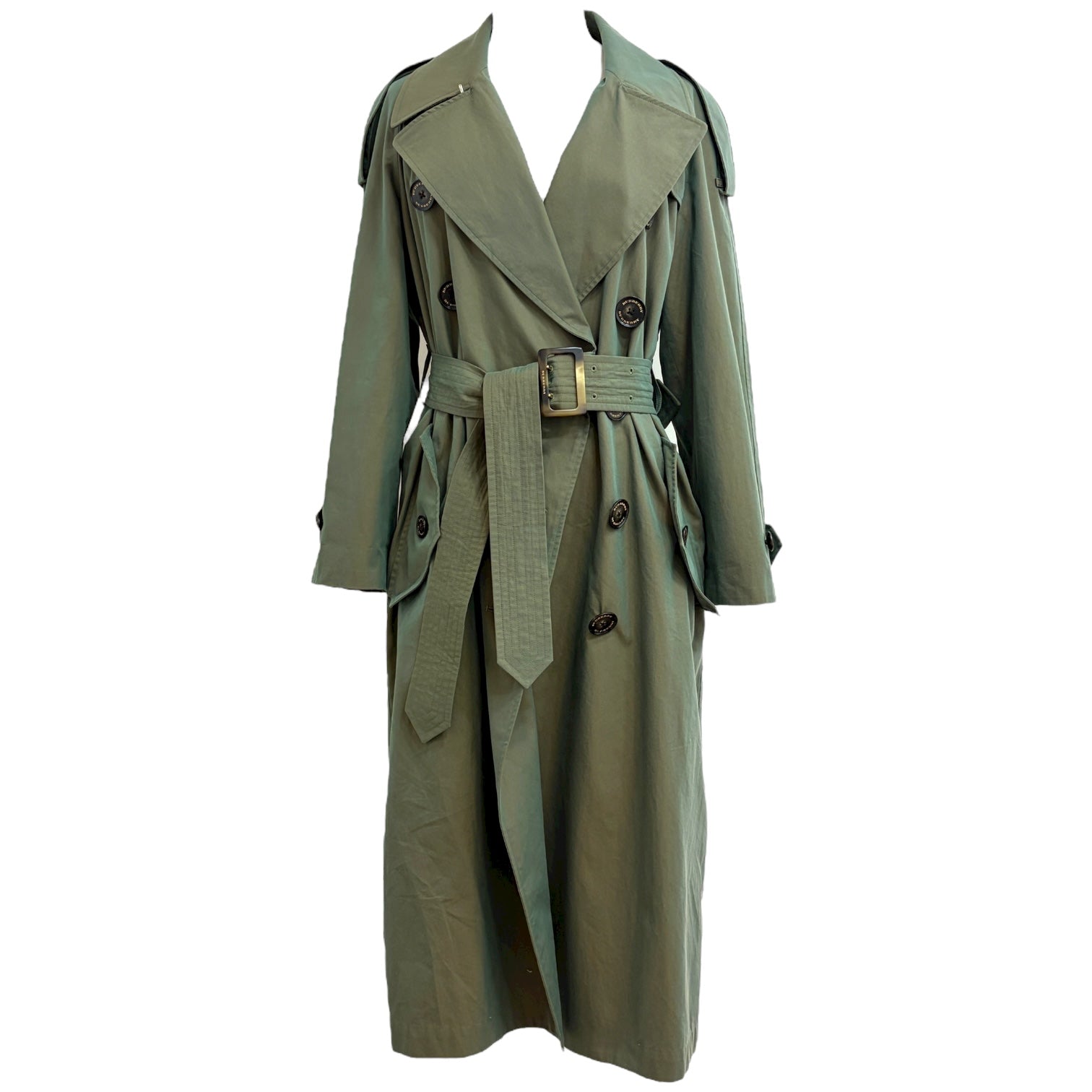 Crafted from iridescent khaki green fabric, this Burberry trench coat brings a modern twist to the house’s iconic silhouette. Featuring a double-breasted design, wide lapels, and a waist-cinching belt, it blends classic tailoring with a subtle luminous finish. Elegant, versatile, and effortlessly chic — a standout piece for any season.