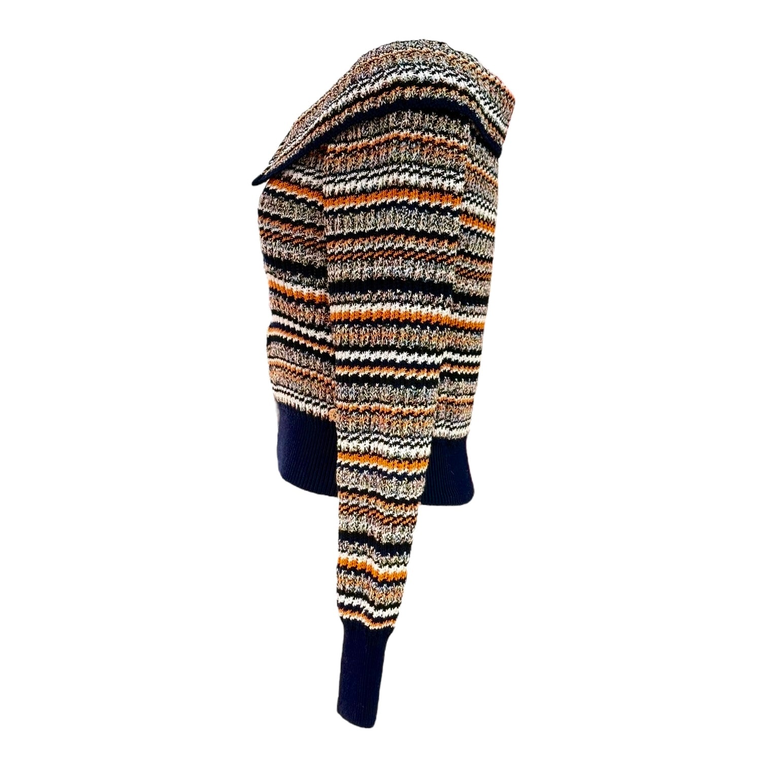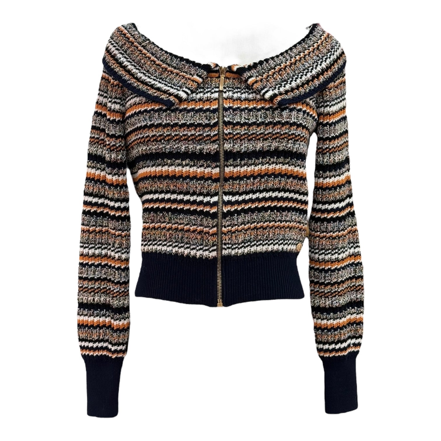 This Chanel Multicolor Striped Knit Zip Cardigan is a chic layering piece with a modern twist. Crafted in a mix of navy, orange, cream, and black hues, it features a textured striped knit, a front zip closure, and a flattering cropped fit. The wide fold-over collar adds a touch of sophistication, while the ribbed hem and cuffs ensure a polished silhouette. Perfect for pairing with high-waisted skirts or trousers, this cardigan blends casual comfort with Chanel’s timeless elegance.