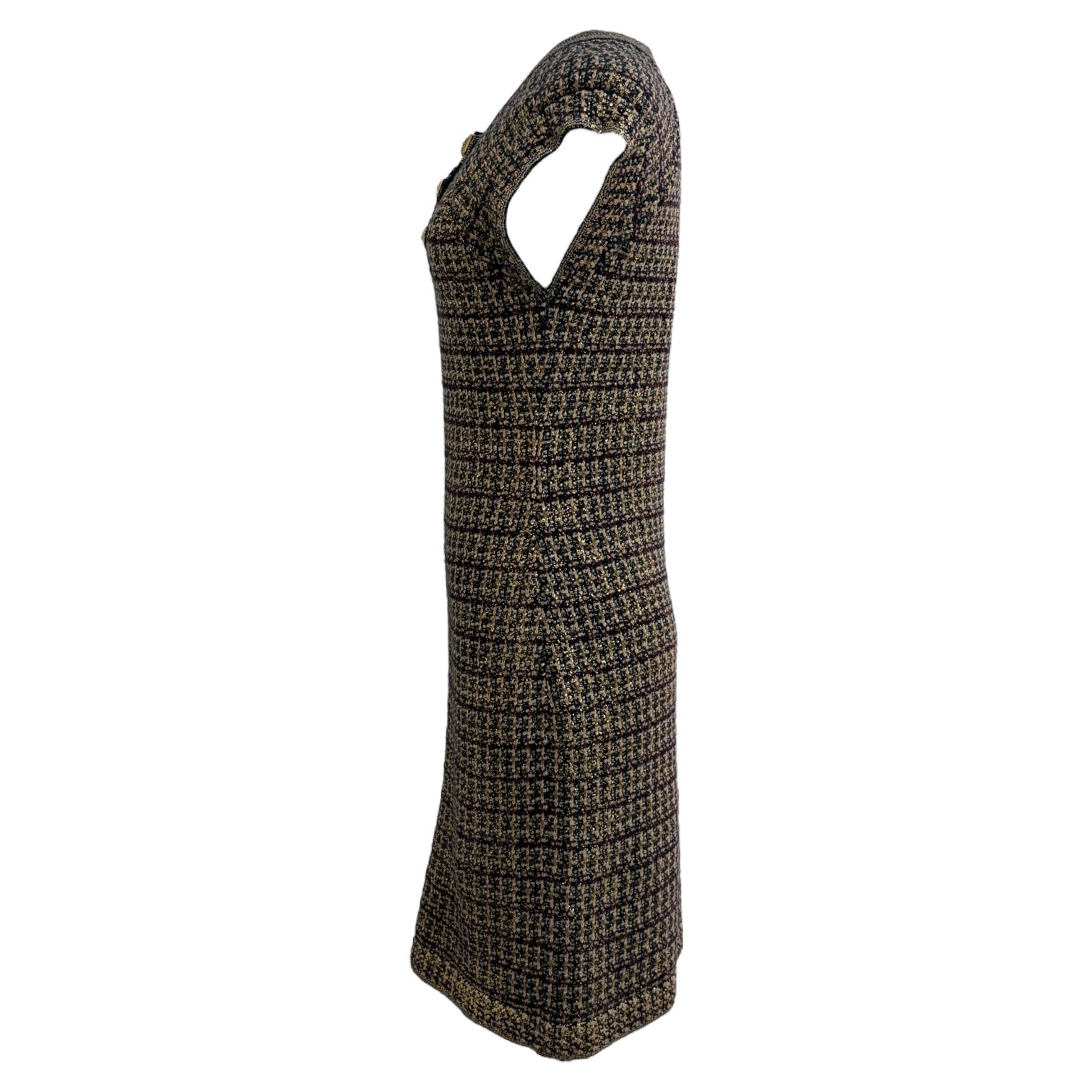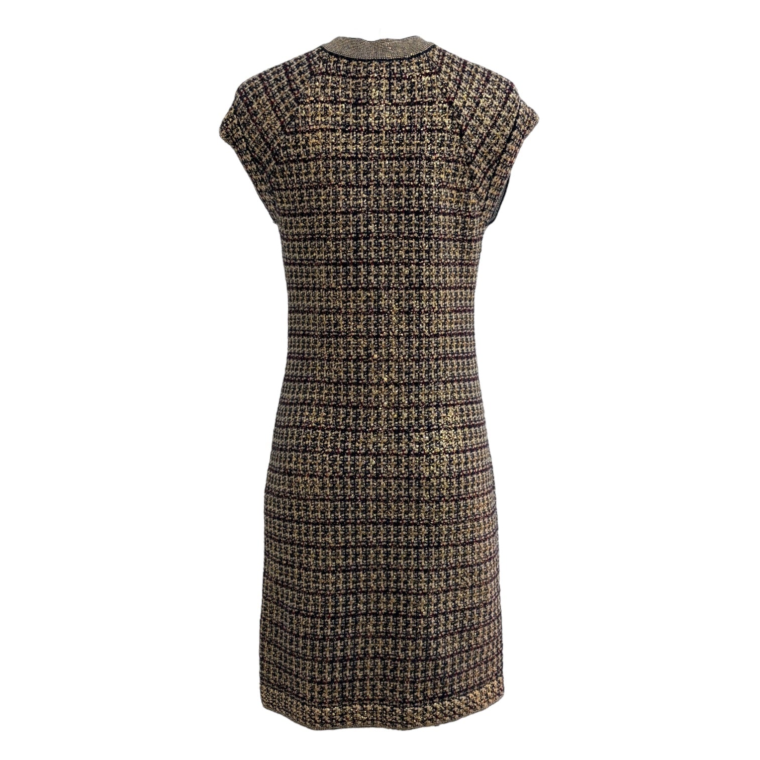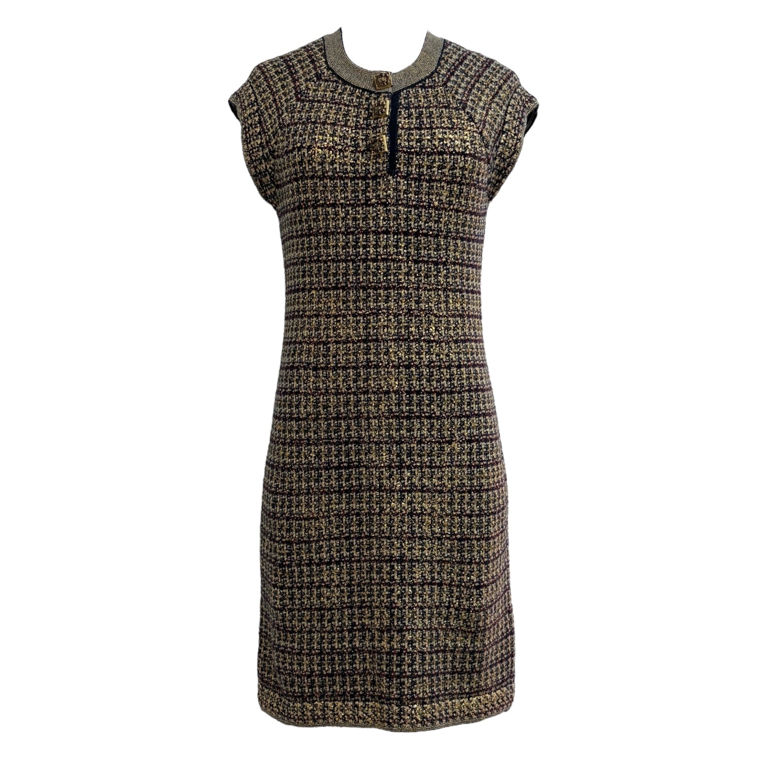 A sophisticated Chanel sleeveless tweed dress in a rich brown and black check pattern, showcasing the house’s signature craftsmanship and timeless Parisian style. The design features a contrasting round neckline, front button closure, and a subtly structured silhouette that flatters the figure while maintaining classic elegance. Perfect for both day and evening wear, this versatile piece embodies the refined femininity that defines Chanel’s heritage.