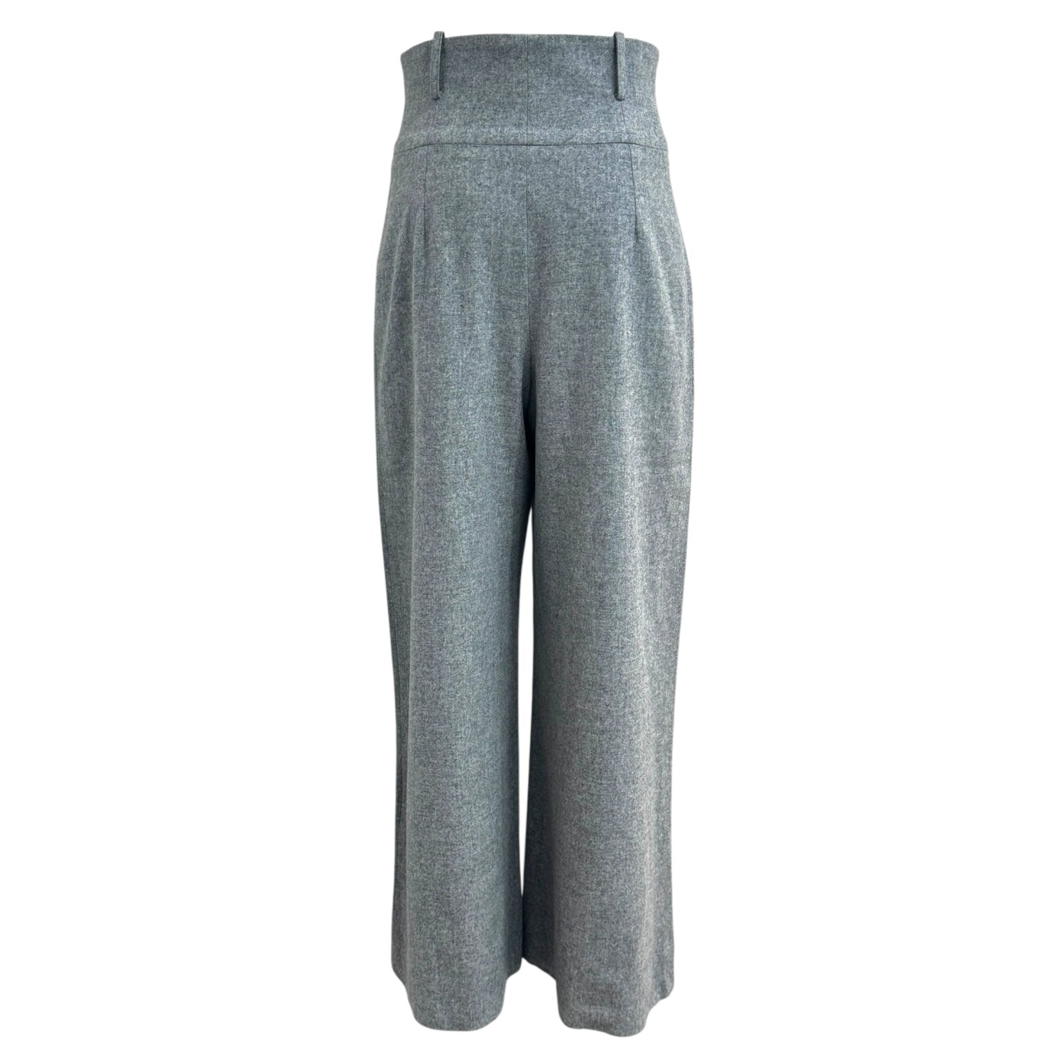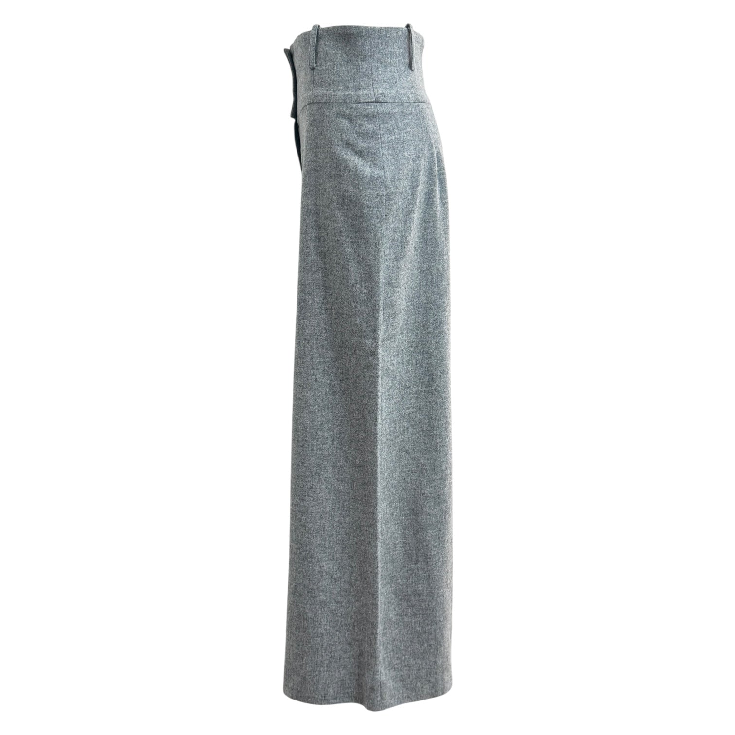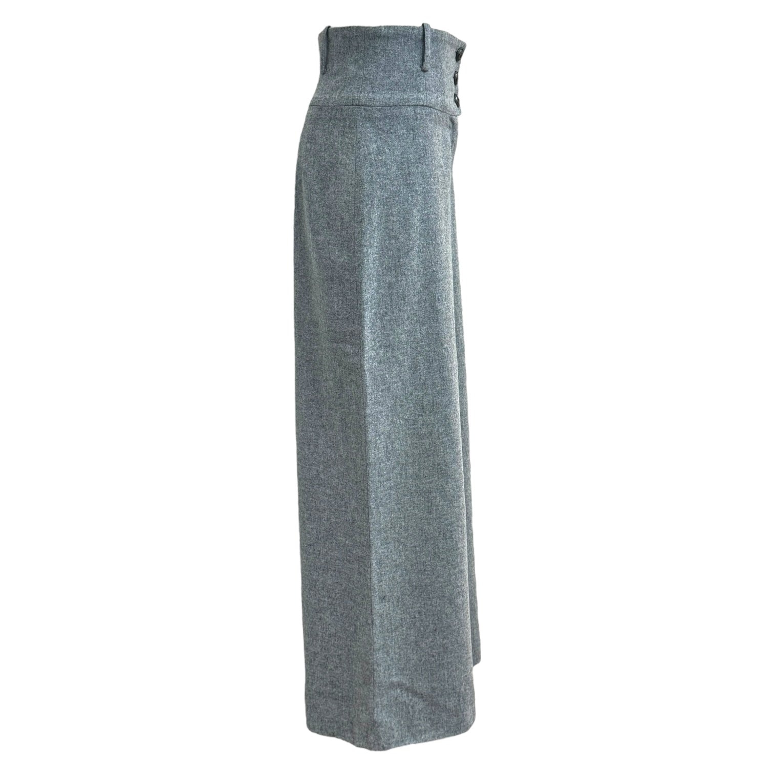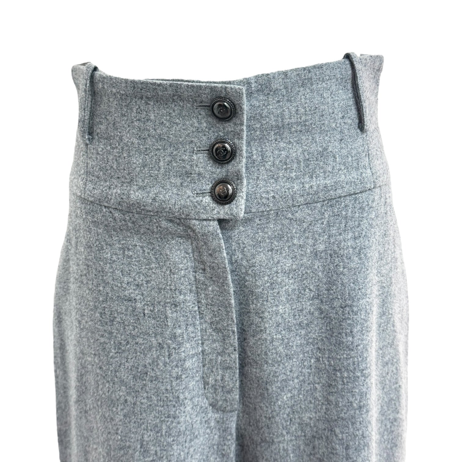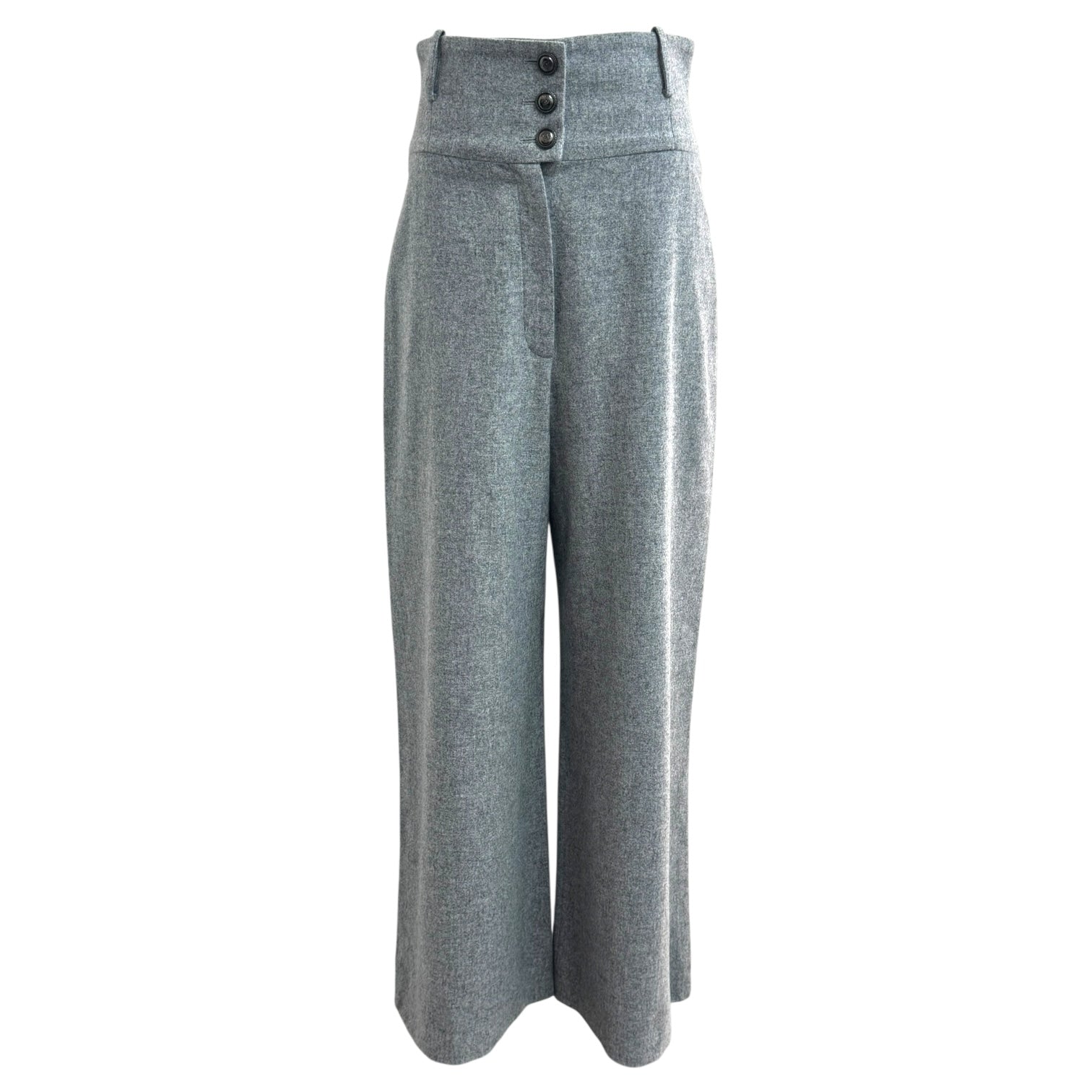 These Chanel grey wool trousers exude understated elegance with a structured high-waist design and wide-leg silhouette. Tailored from premium wool, they feature a flattering elongated fit with a button-accented waistband for a refined finish. The versatile grey hue makes them a timeless wardrobe essential, perfect for pairing with blazers, blouses, or knitwear for a sophisticated day-to-night look.