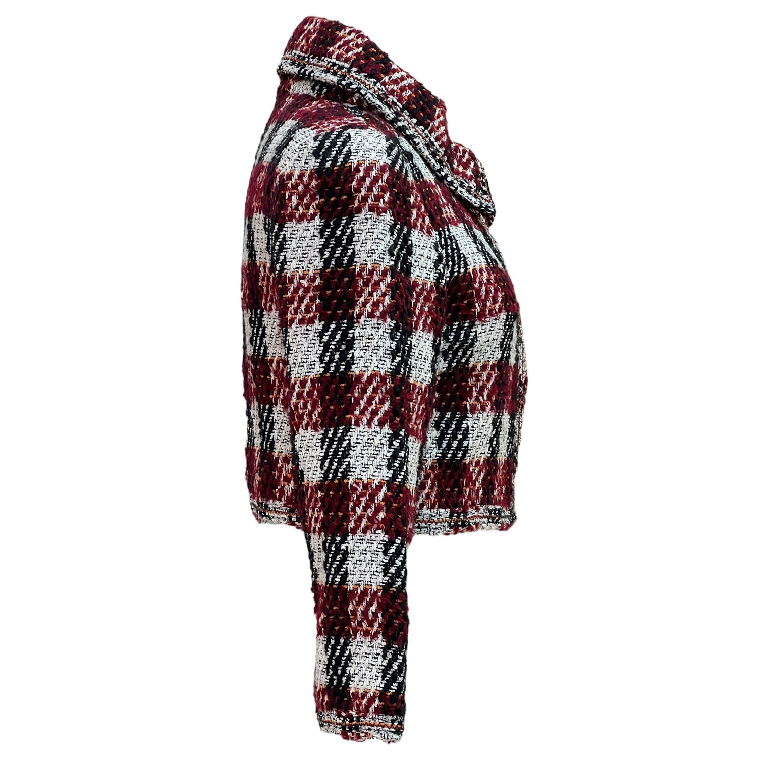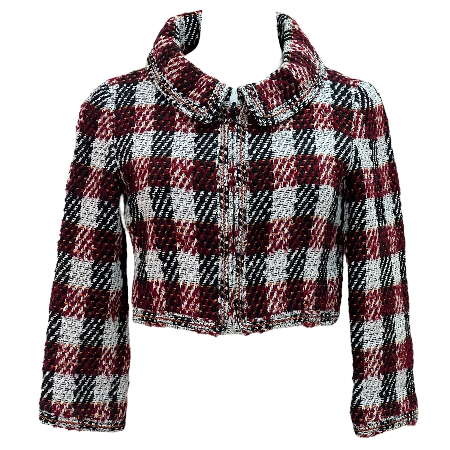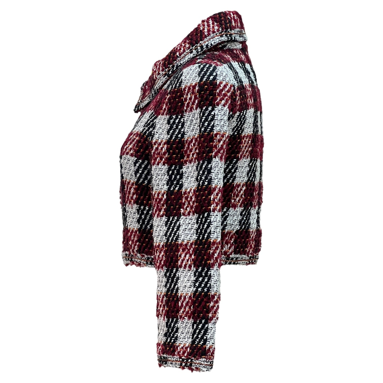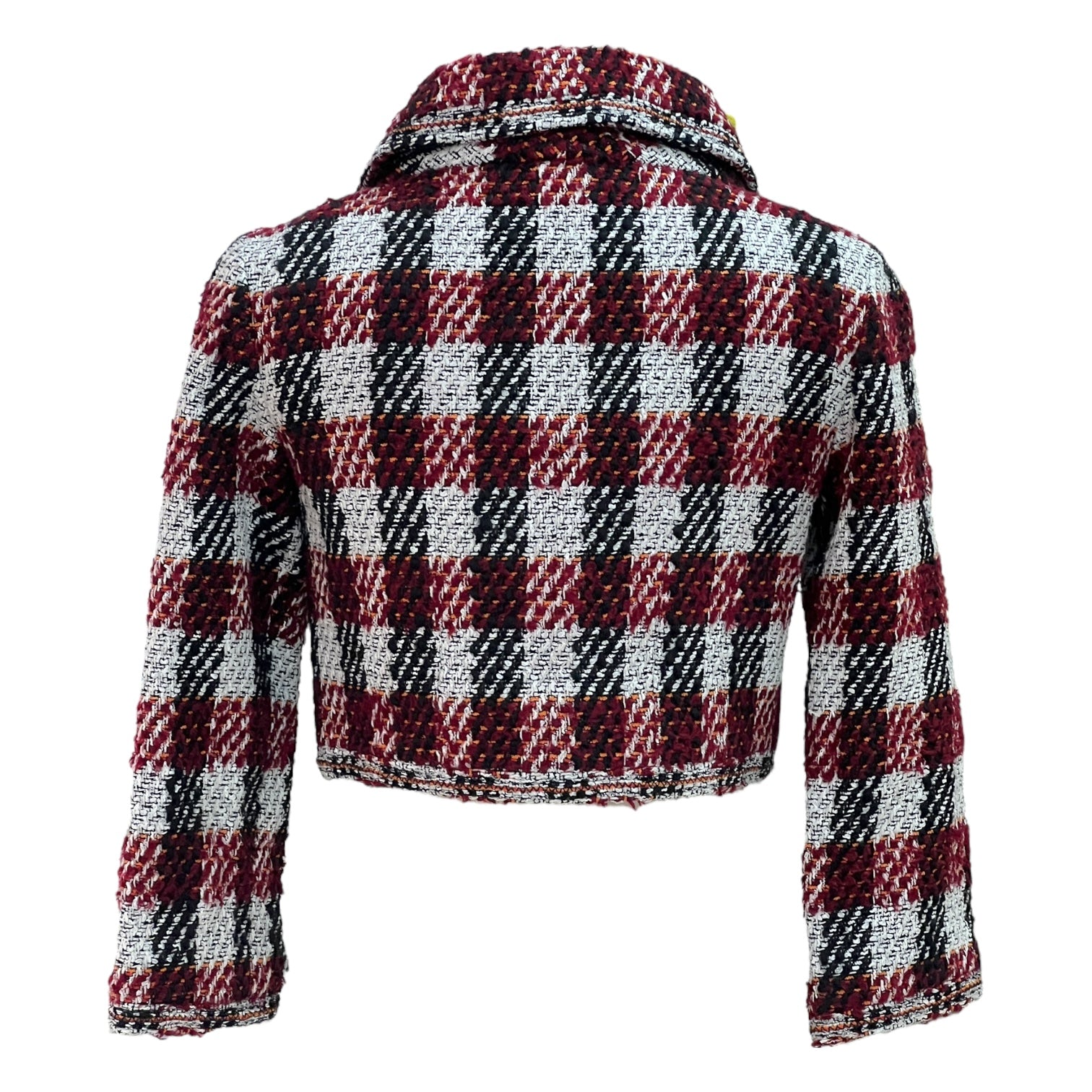 This elegant Chanel jacket is crafted from signature wool tweed in a red, white, and black check pattern. Featuring a cropped silhouette, rounded collar, and subtle shoulder structure, it embodies timeless Parisian chic. The textured weave and meticulous detailing highlight Chanel’s classic craftsmanship — perfect for pairing with high-waisted trousers or a sleek skirt for a refined yet modern look.