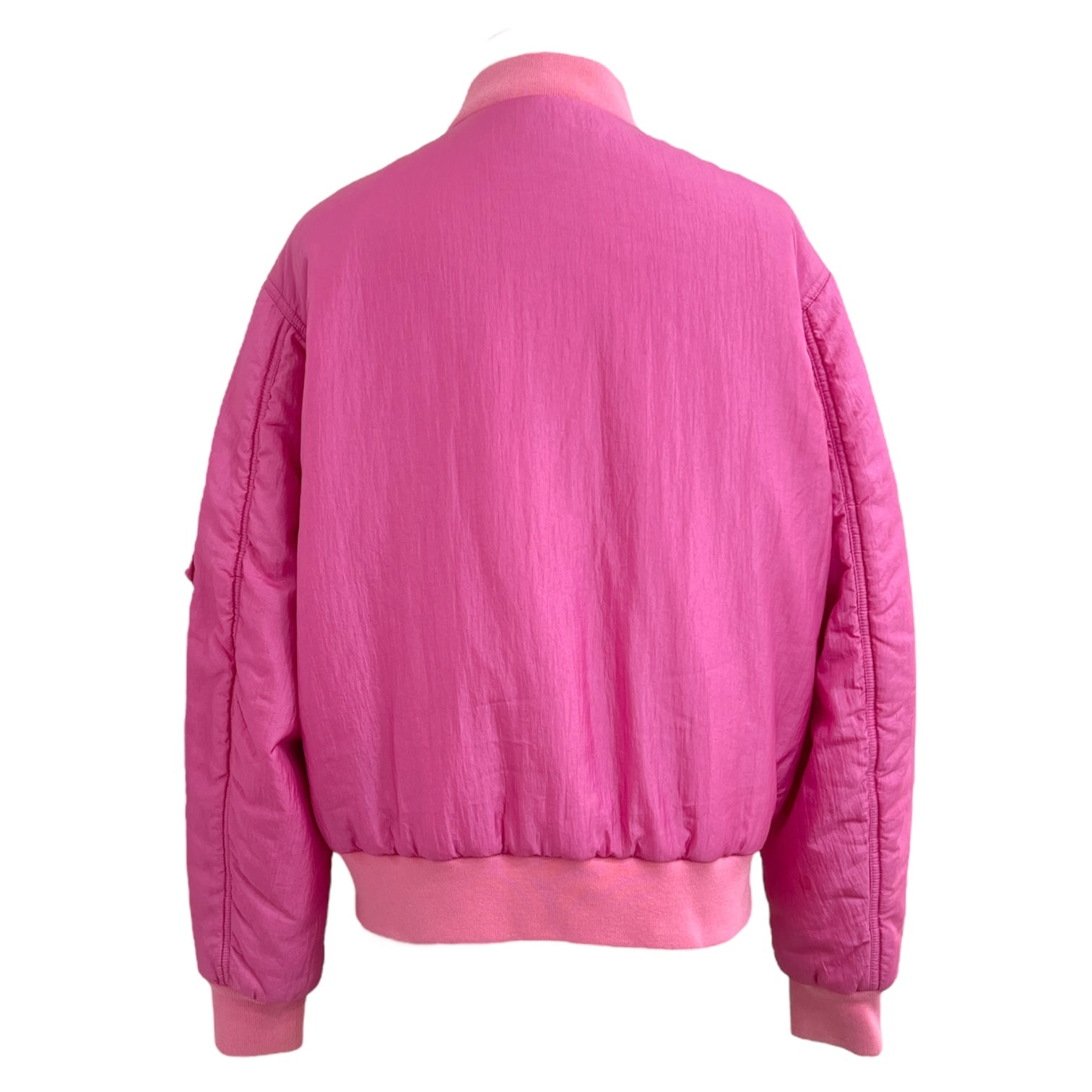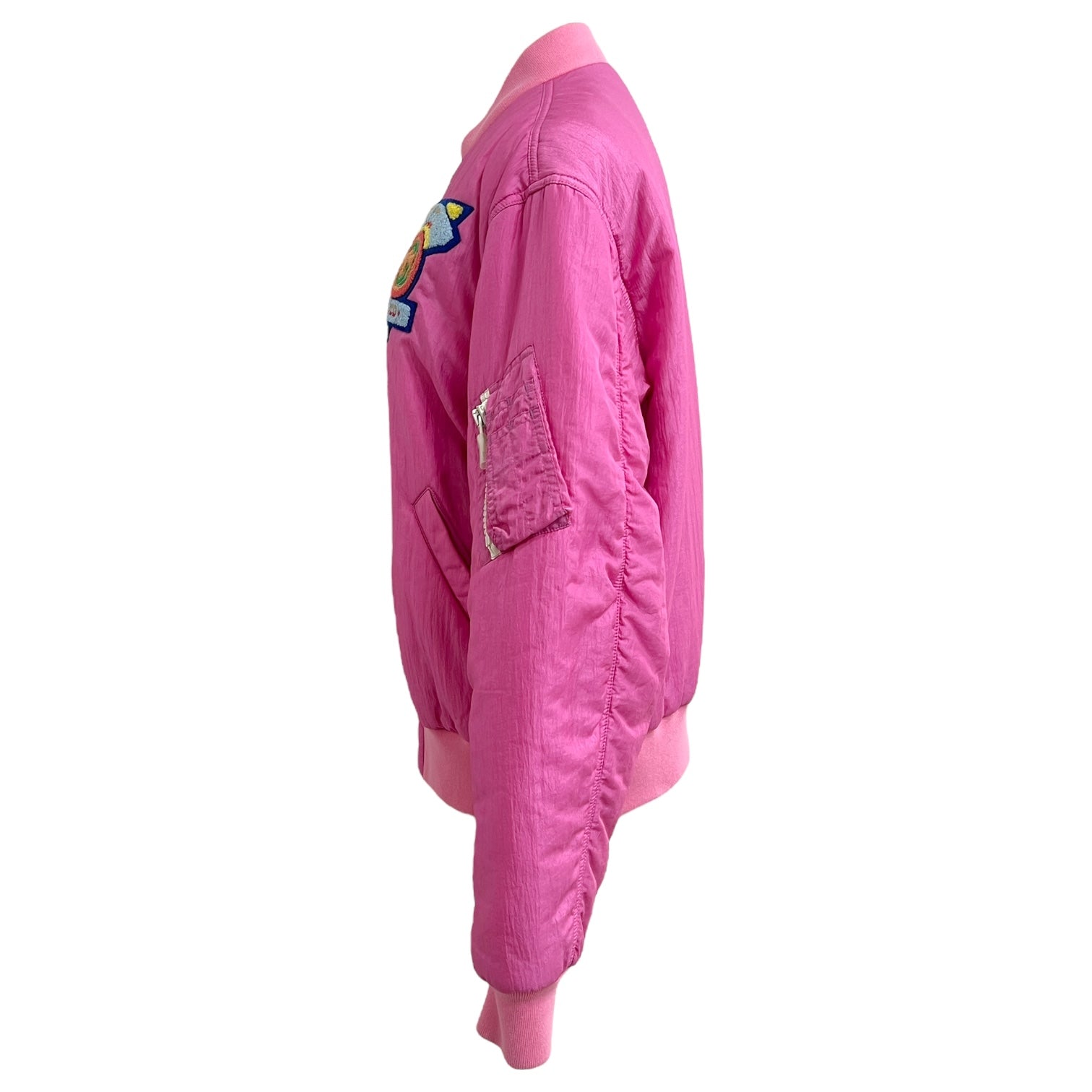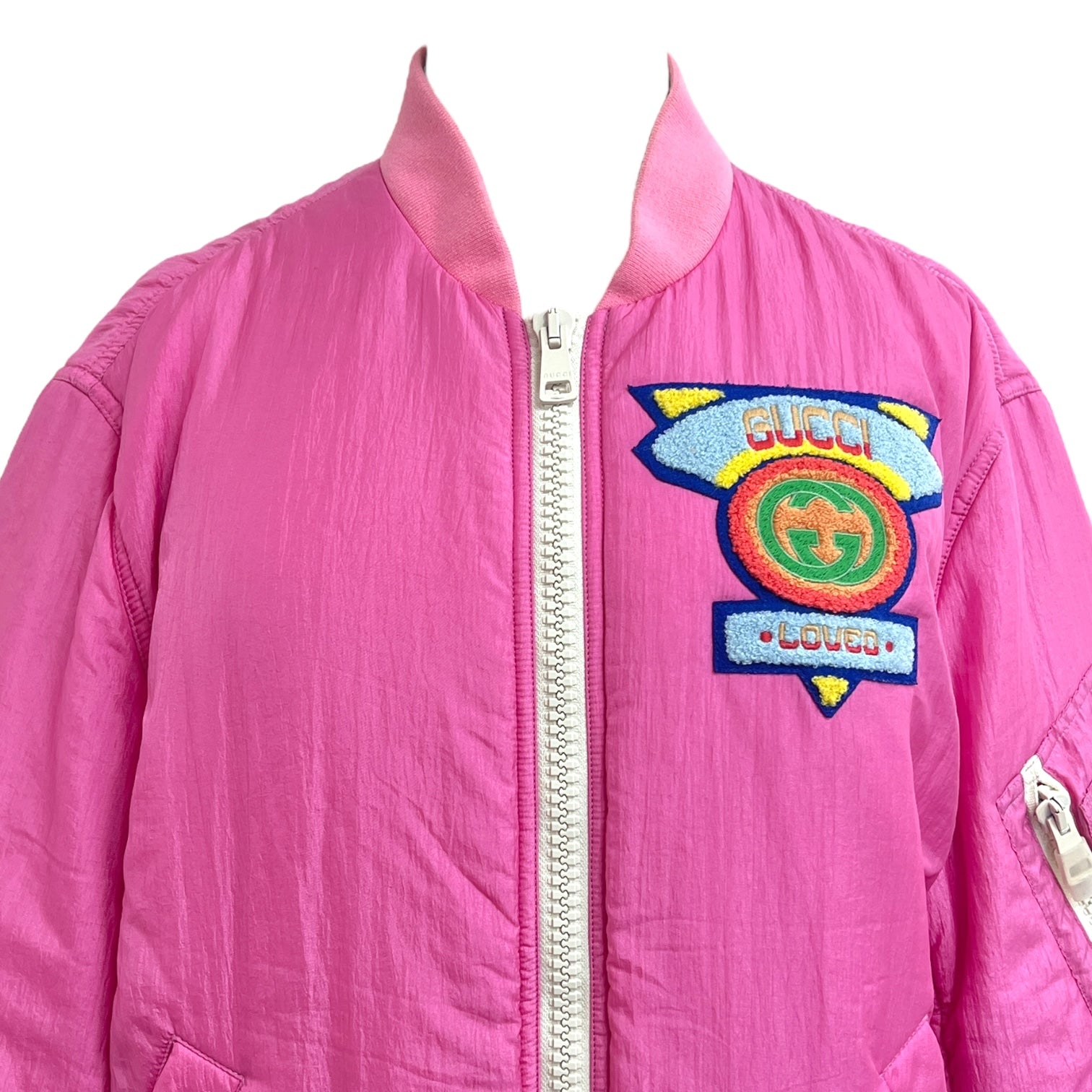 This Gucci Pink Bomber Jacket delivers a playful yet bold take on a streetwear classic. Crafted in a vibrant pink nylon with ribbed trims, the jacket features the brand’s signature embroidered patchwork detail on the chest, showcasing Gucci’s eclectic spirit. The front zip closure, side pockets, and an additional zip pocket on the sleeve add both style and functionality. With its oversized silhouette and eye-catching color, this jacket makes a statement piece for layering, blending luxury craftsmanship with contemporary street style.