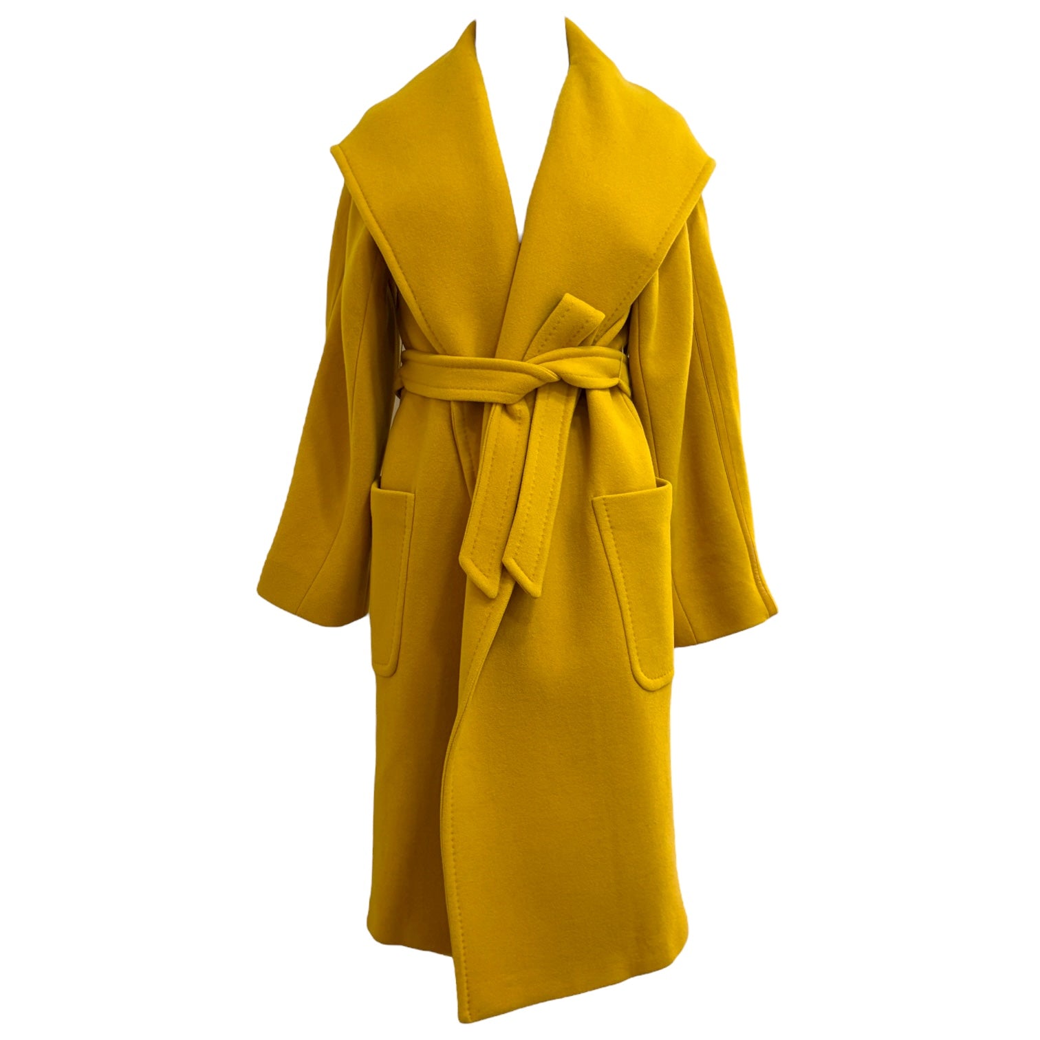 This exquisite Max Mara wrap coat is crafted from a luxurious blend of 71% virgin wool, 19% angora, and 10% cashmere, offering supreme softness and warmth. The striking mustard yellow hue brings a vibrant, modern touch to this timeless silhouette. Featuring an elegant oversized hood that drapes beautifully across the shoulders, a self-tie belt to accentuate the waist, and large patch pockets for functionality, this coat embodies the effortless sophistication Max Mara is known for. A perfect balance of comfort, structure, and refined style—ideal for both casual and polished looks.