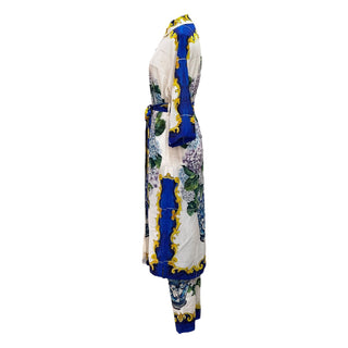 Dolce & Gabbana White Bouquet Printed Silk Button Down Belted Dress and Trousers Set