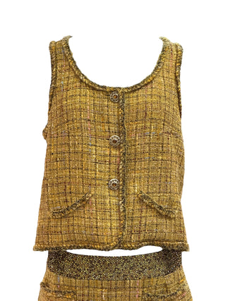 Chanel Golden Tweed Two-Piece Set With Sleeveless Button-Up Top And Mini Skirt