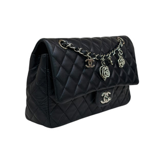 Chanel Black Quilted Lambskin Valentine Crystal Charms Medium Flap Bag With Silver Hardware
