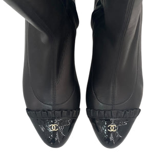 Chanel Black Lambskin Leather Jacket With Tonal Heart Logo Embroidery And Patch Pockets