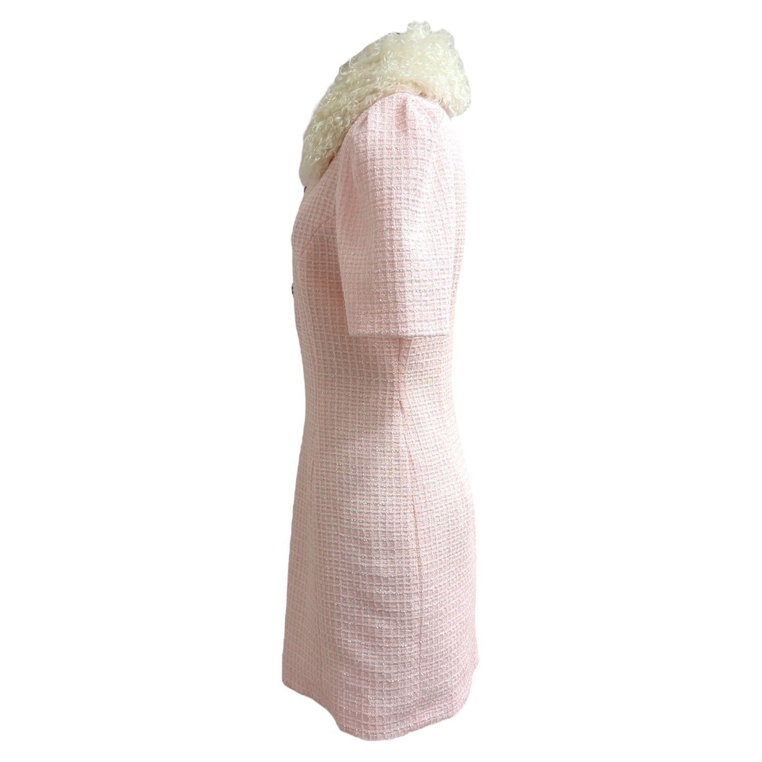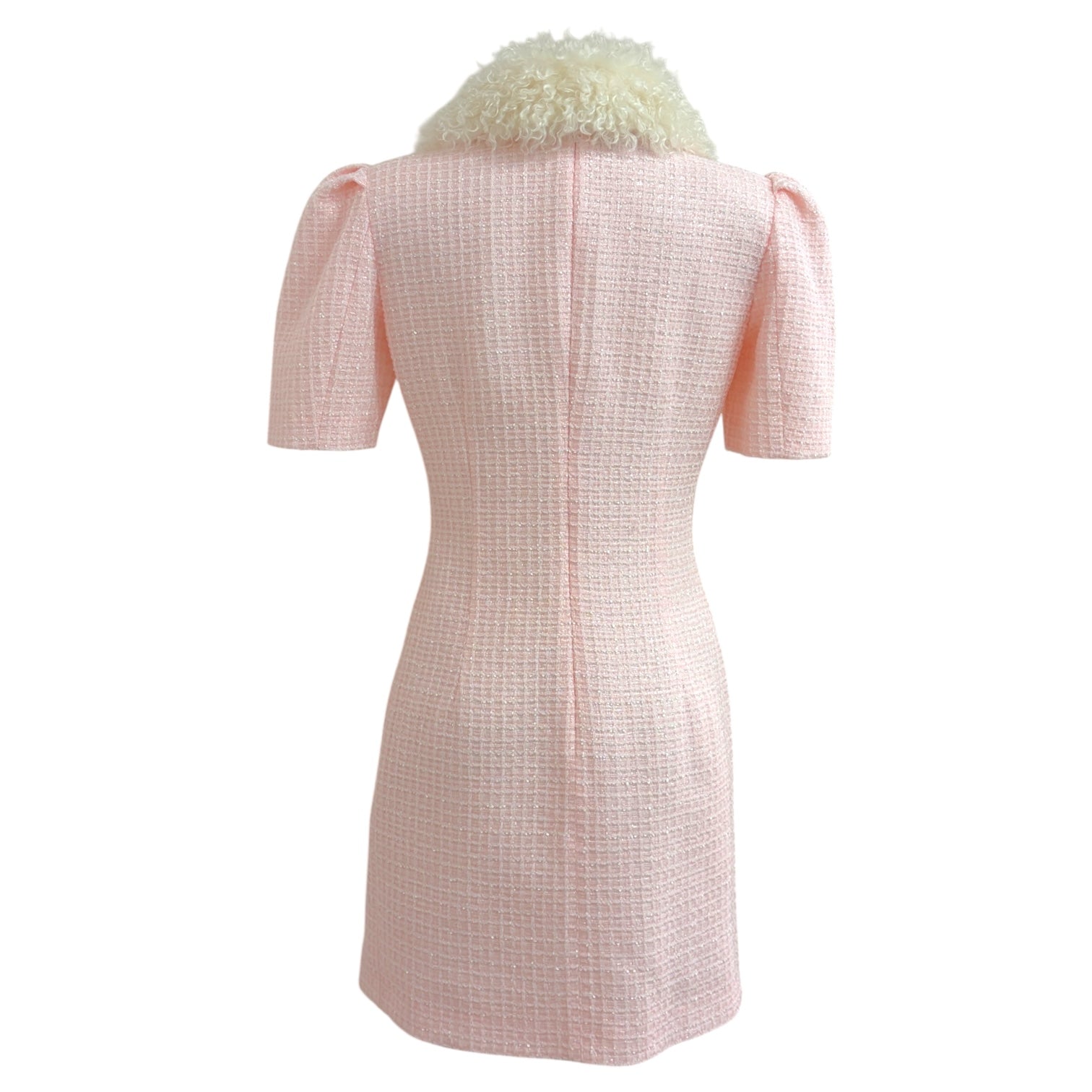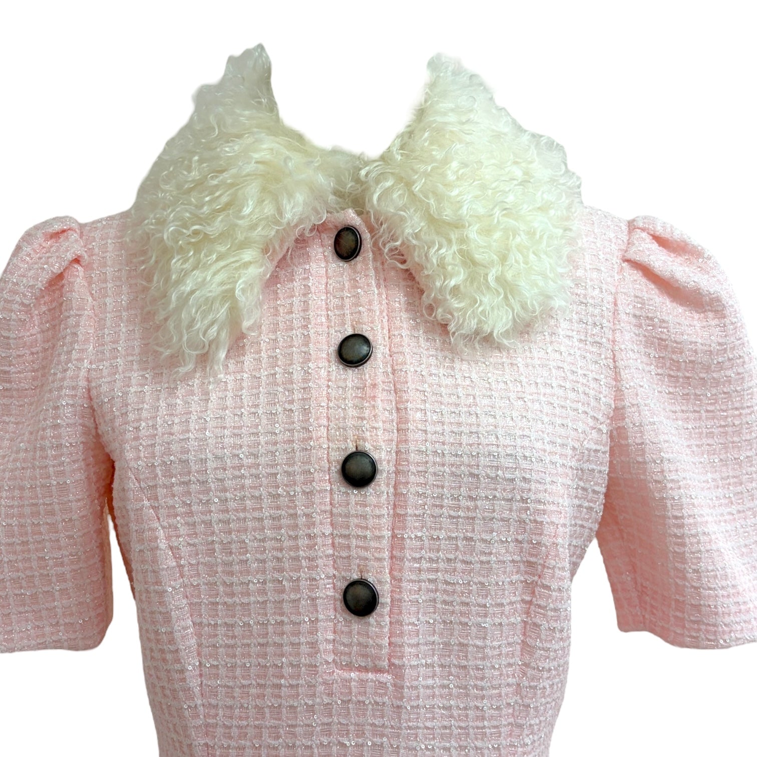 A signature statement of feminine sophistication by Alessandra Rich, this pastel pink tweed mini dress radiates vintage-inspired elegance. Crafted from soft, structured tweed with a subtle shimmer, the design is elevated by a plush curly shearling collar and bold front button detailing. Its tailored silhouette and puff sleeves create a refined yet playful charm — a perfect fusion of modern glamour and timeless grace.