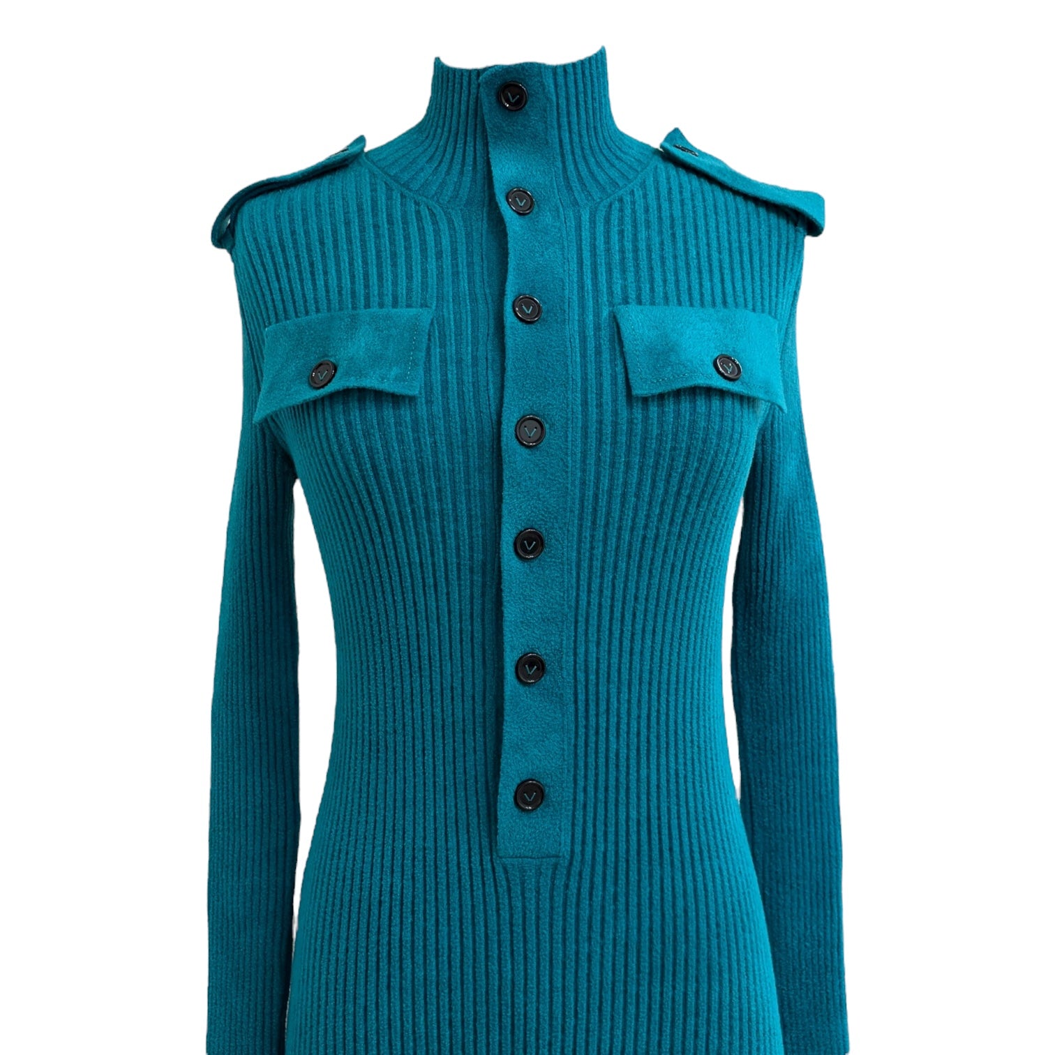 This Bottega Veneta dress showcases a body-contouring silhouette in a luxurious ribbed knit with a refined military-inspired edge. Designed in an elegant teal hue, it features button detailing down the front, structured shoulder tabs, and flap chest pockets that enhance its sculptural appeal. A perfect blend of sophistication and modern craftsmanship, this piece embodies Bottega Veneta’s understated yet powerful aesthetic.