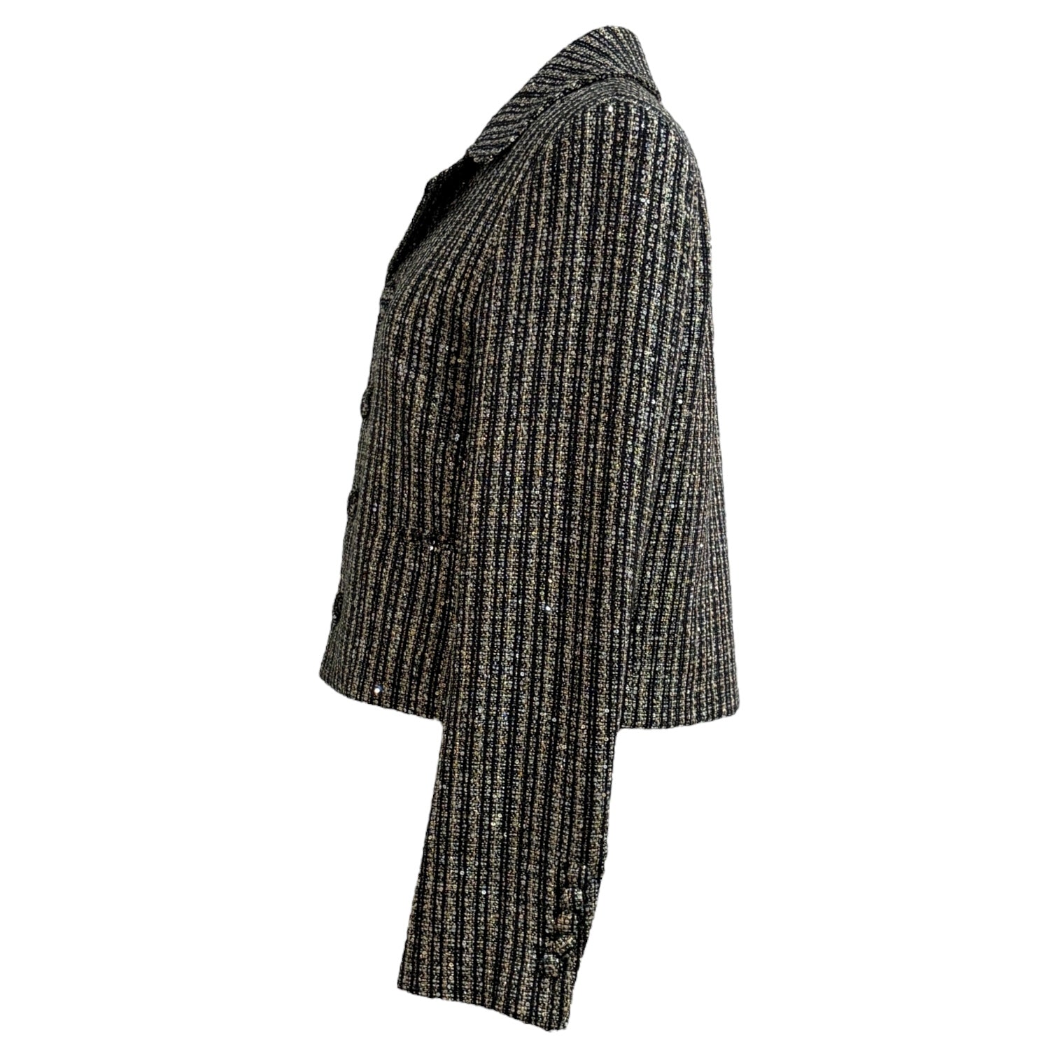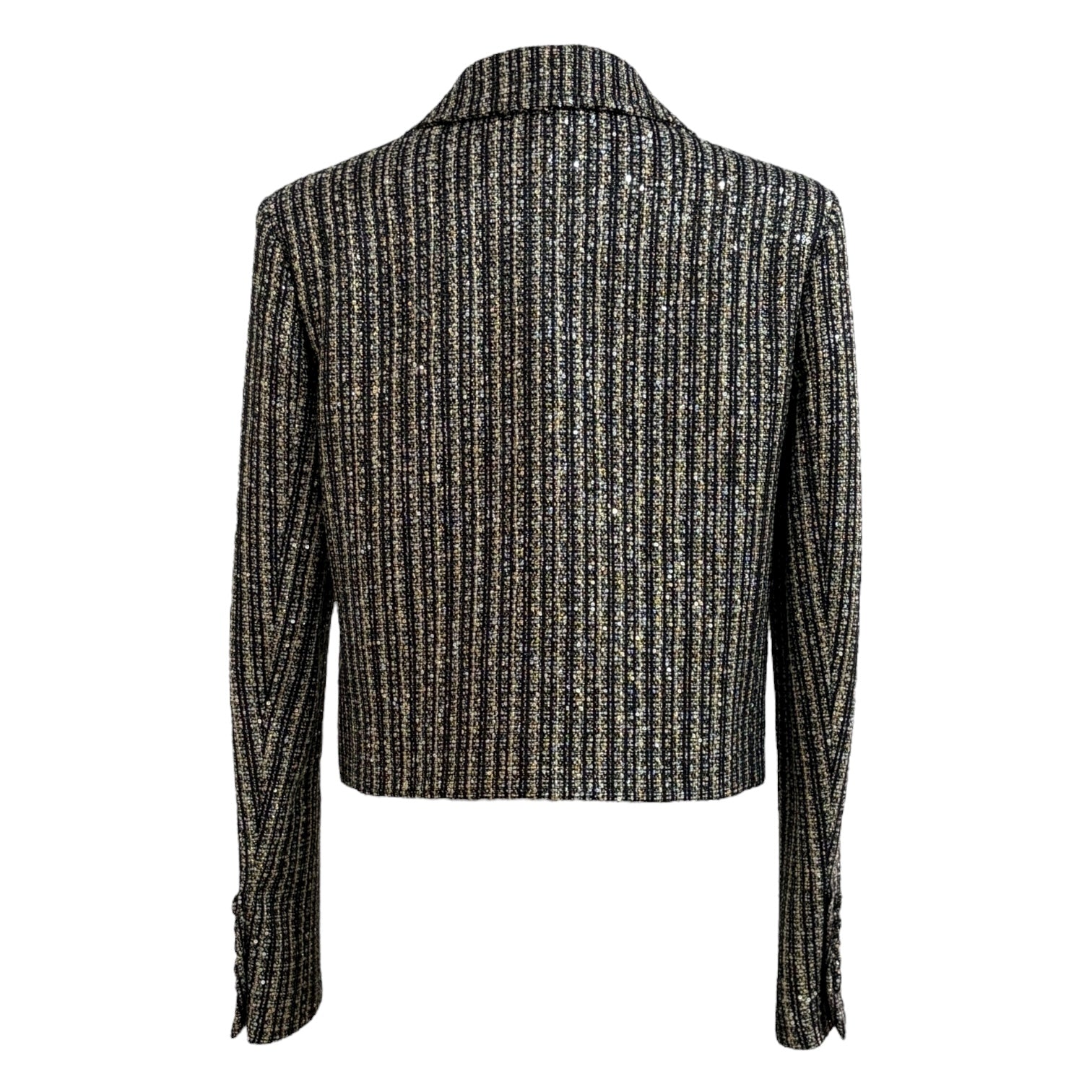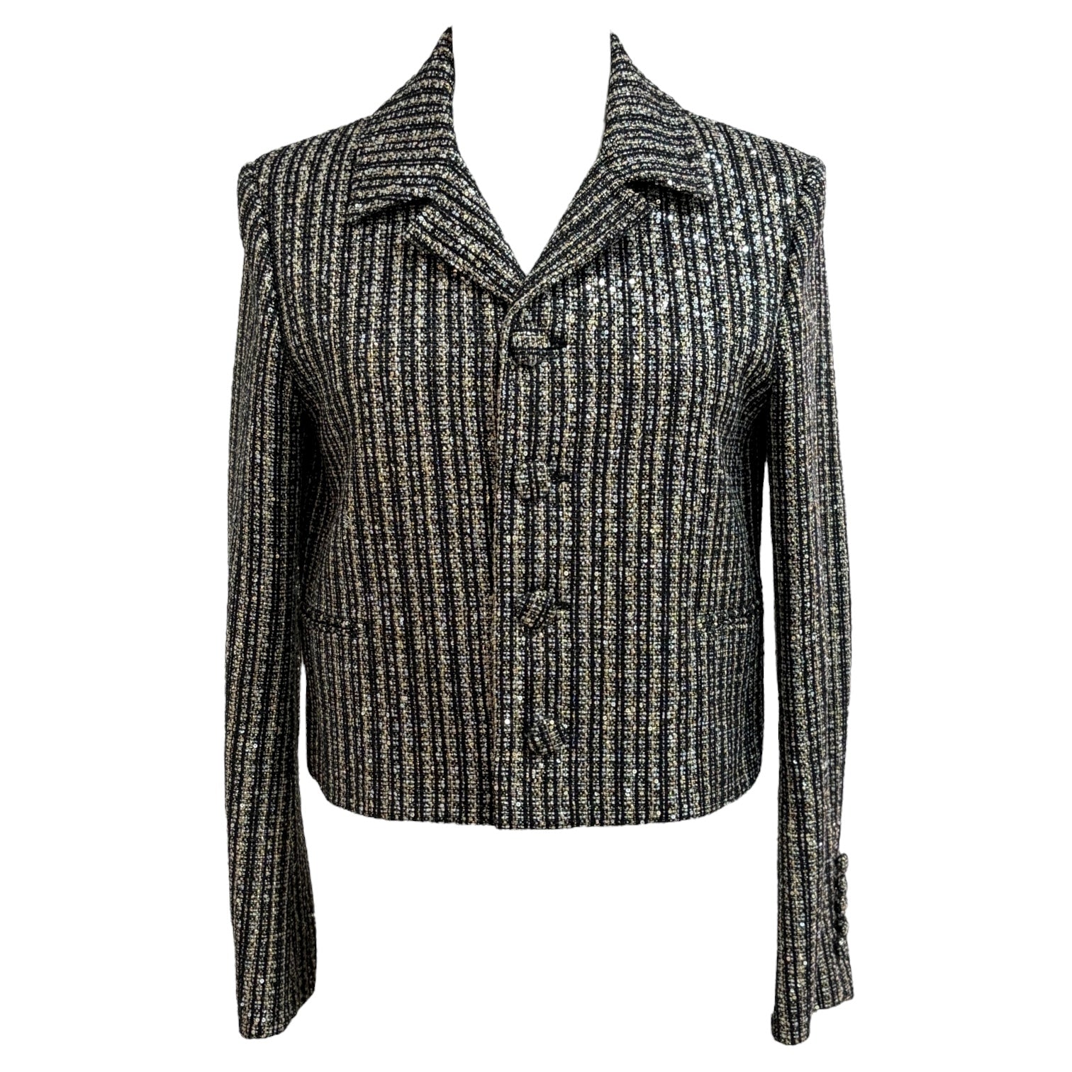 This Saint Laurent jacket exudes sophisticated Parisian edge with its shimmering black and silver metallic striped tweed. Tailored in a structured silhouette, it features sharp lapels, covered button closures, and subtle front pockets for a sleek, refined finish. The lustrous metallic threading adds a glamorous touch, making it a perfect statement piece for evening occasions or elevating daywear with Saint Laurent’s signature rock-chic elegance.