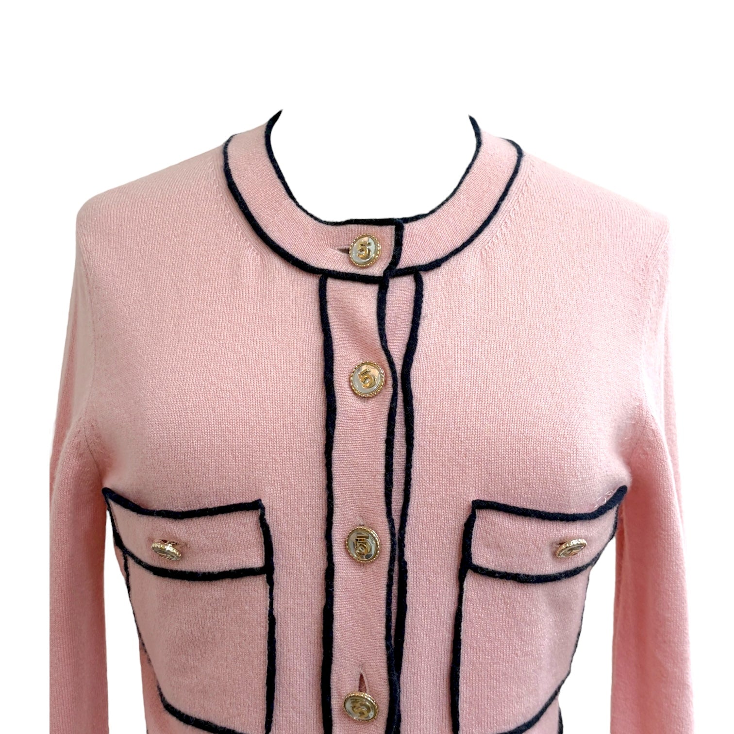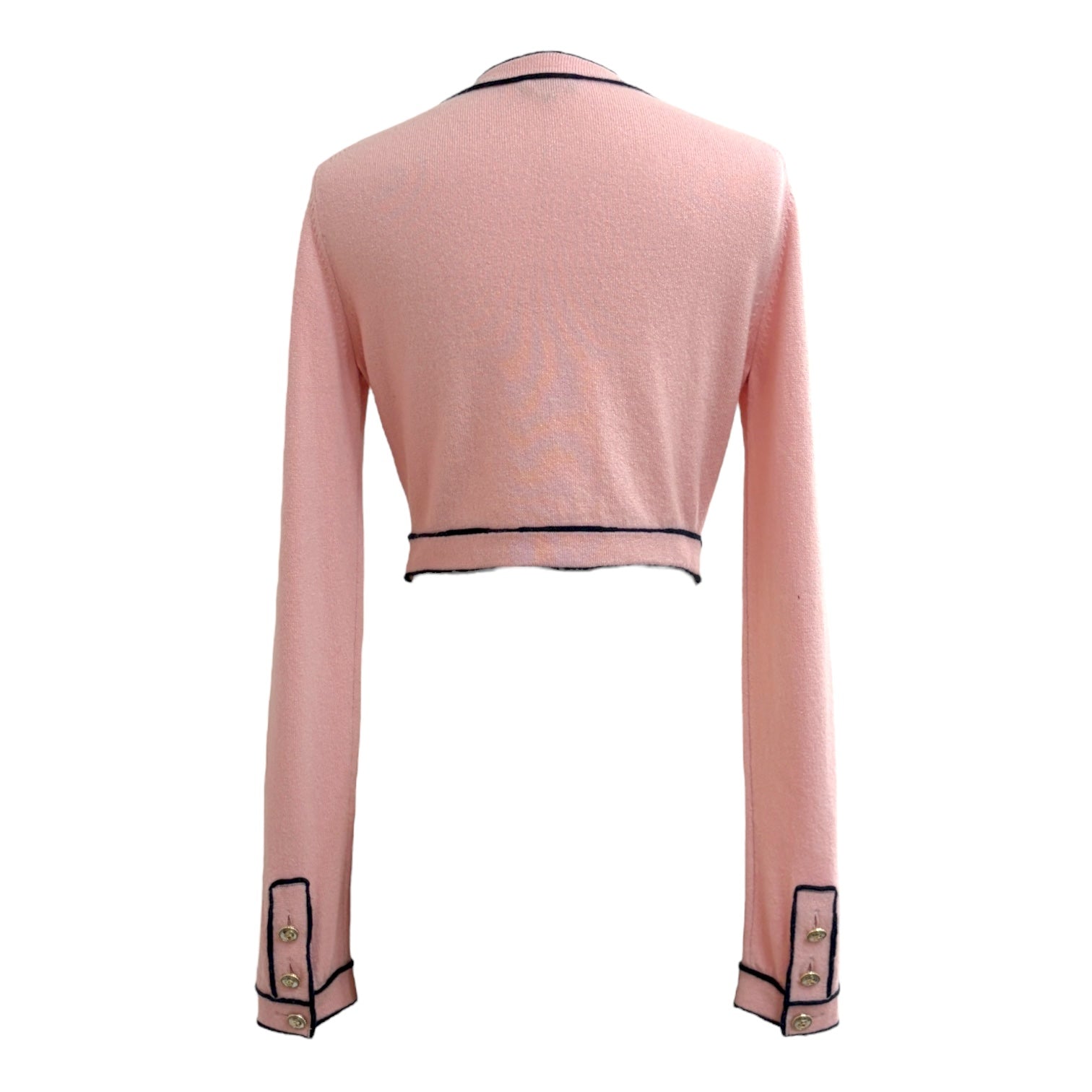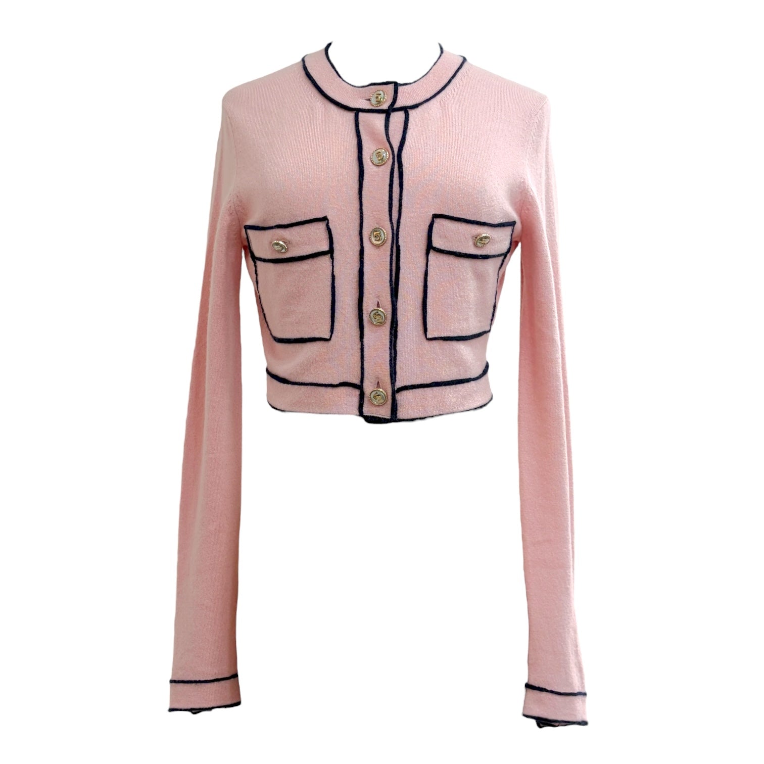 This elegant Chanel cropped cardigan is crafted from soft pink cashmere and defined by bold navy contrast piping that highlights its classic structure. Featuring gold-tone CC logo buttons and two front patch pockets, it captures the Maison’s signature blend of femininity and precision tailoring. The fitted silhouette and cropped length make it a chic layering piece, perfect for pairing with high-waisted skirts or trousers for a timeless, polished Chanel look.