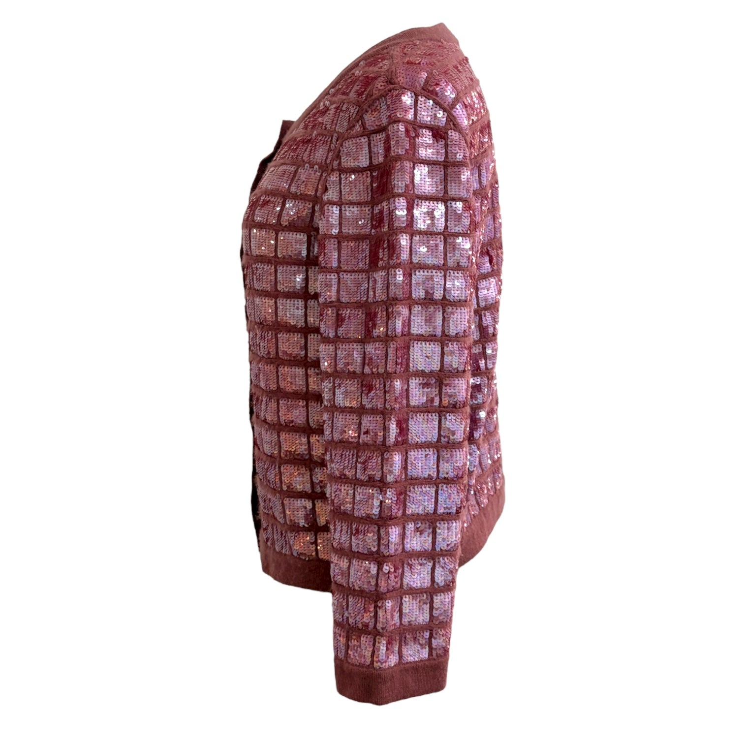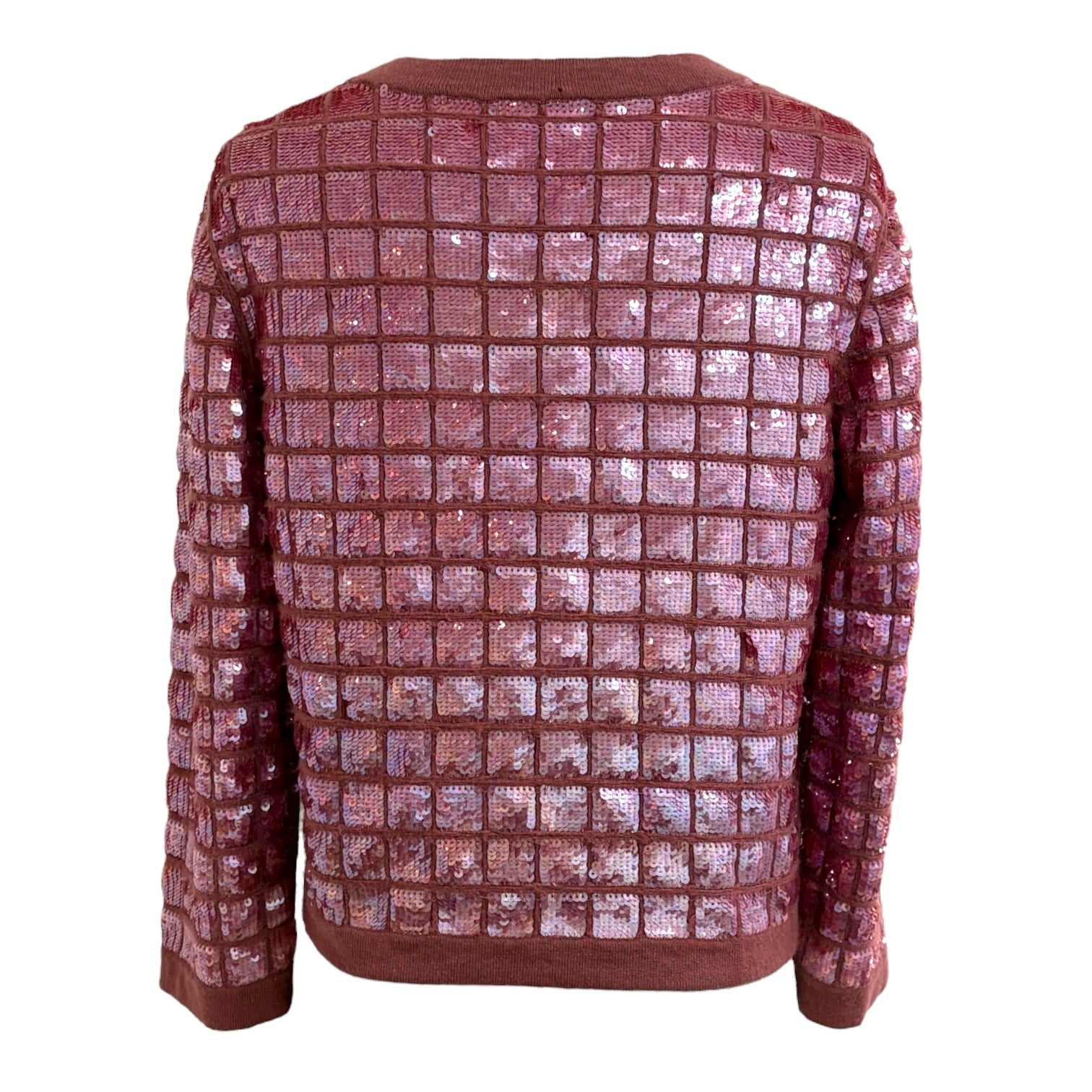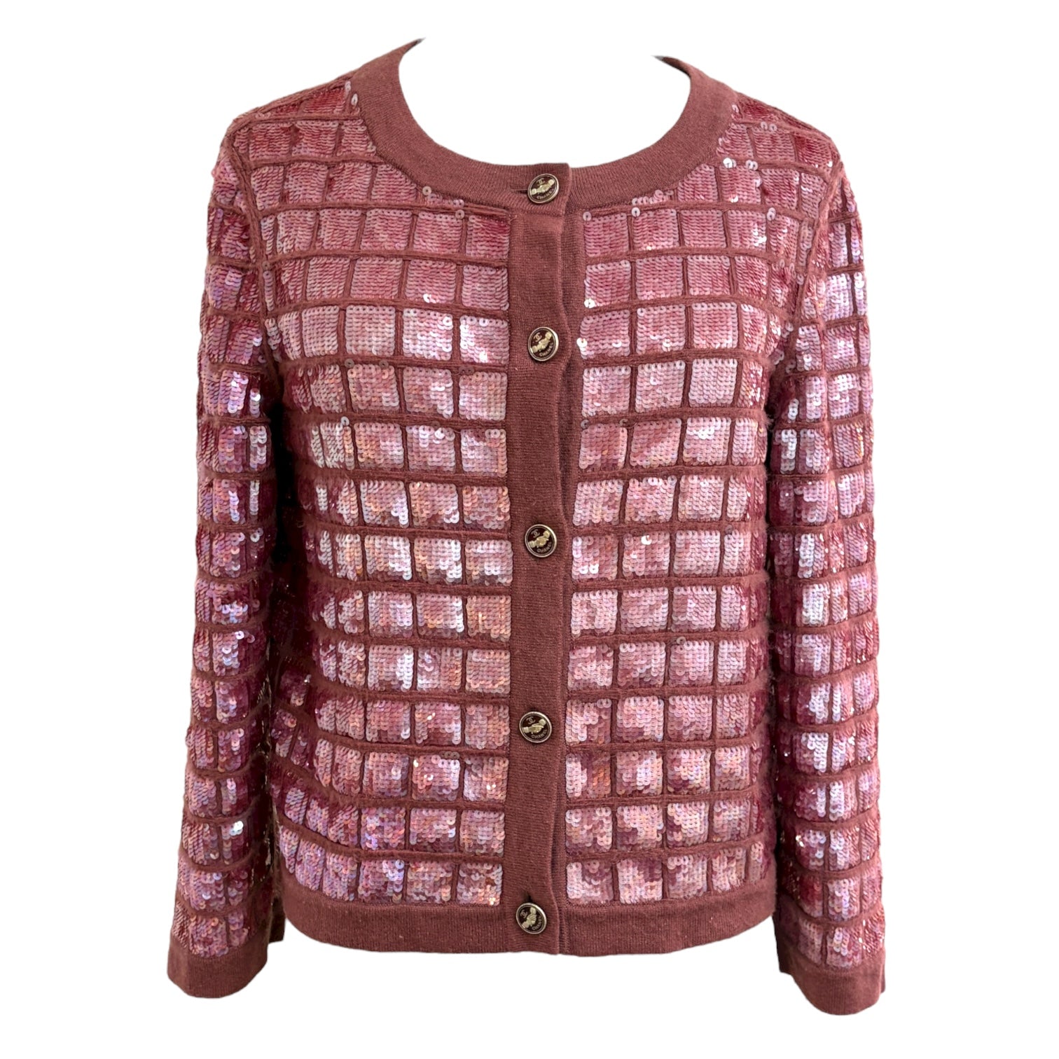 This stunning Chanel cardigan exudes timeless femininity with a touch of modern glamour. Crafted in a warm rose hue, it features a grid-pattern sequin overlay that shimmers beautifully under the light, adding dimension and texture to the soft knit base. The front is detailed with signature Chanel CC logo buttons, while the classic round neckline and tailored fit offer a refined silhouette. A perfect statement piece that transitions effortlessly from day to evening, showcasing the house’s signature blend of elegance and sophistication.