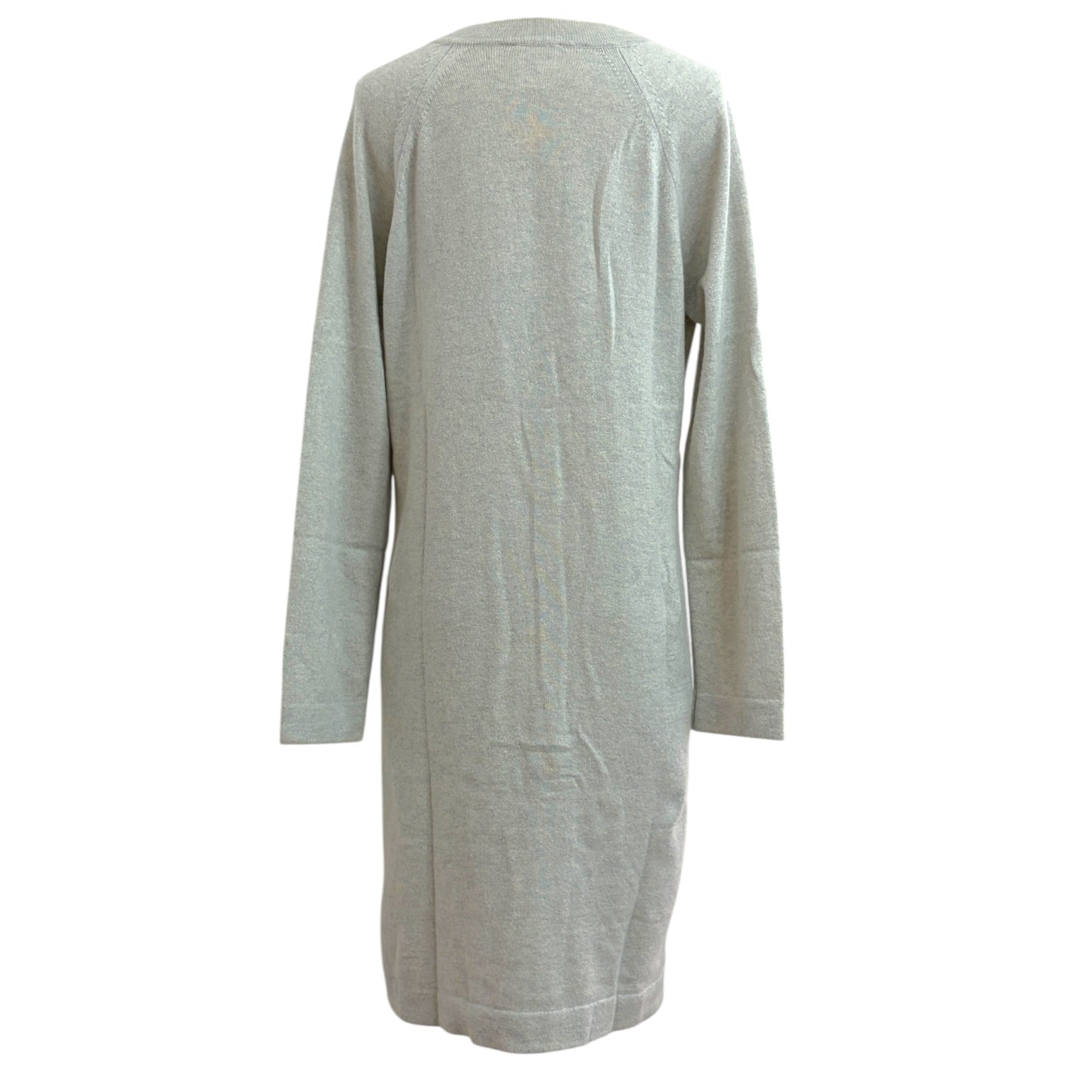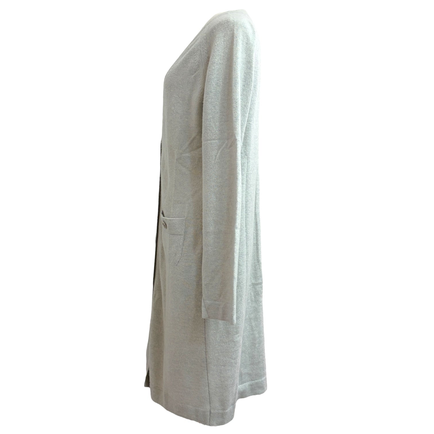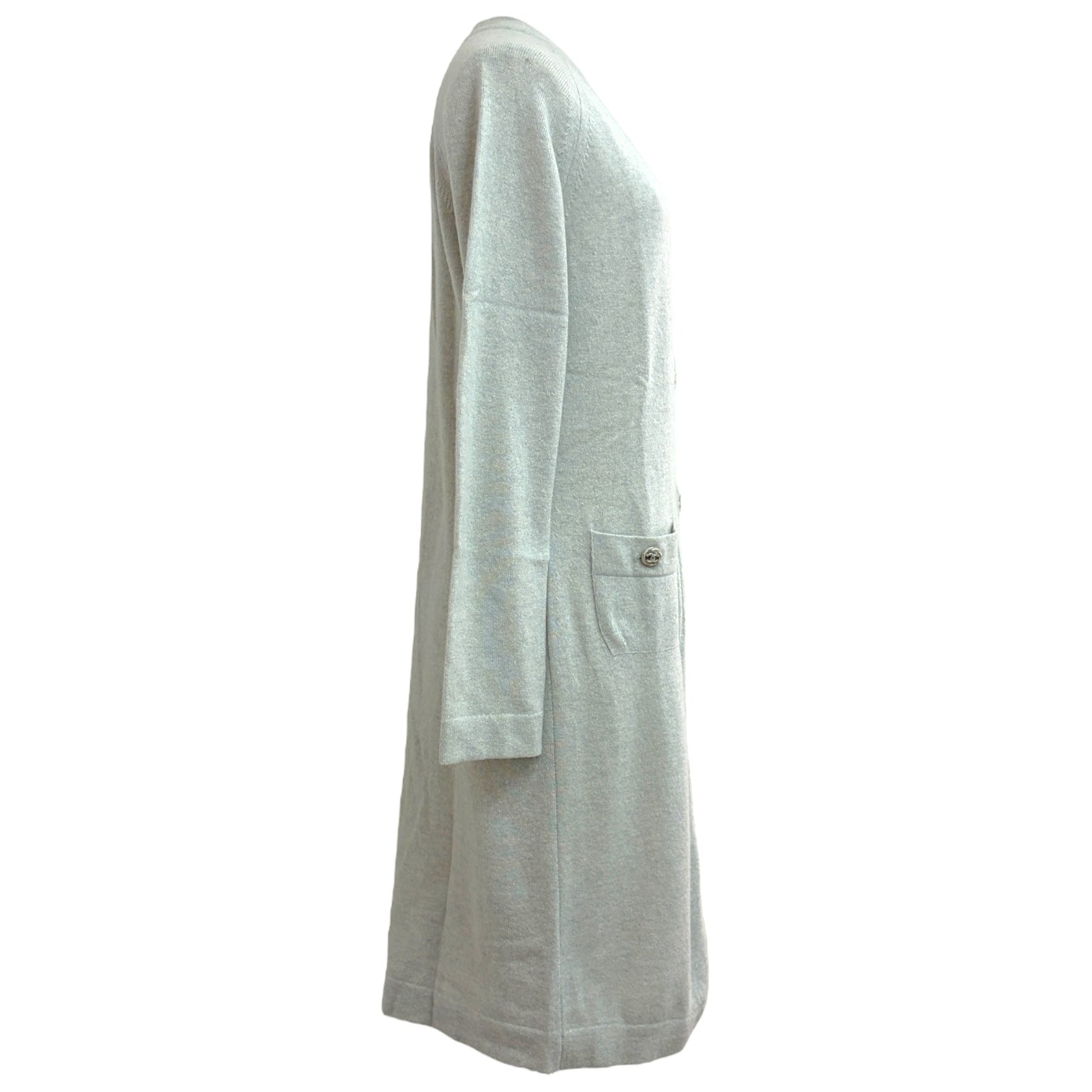 This Chanel light grey cardigan embodies understated sophistication with its luxuriously soft cashmere composition and elongated silhouette. Featuring signature CC logo buttons and front patch pockets, the design combines comfort and refinement in true Chanel fashion. Perfect for layering over casual or elegant ensembles, this piece offers timeless Parisian ease with a modern relaxed fit.