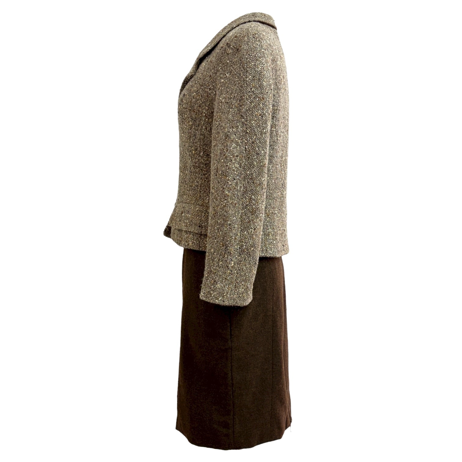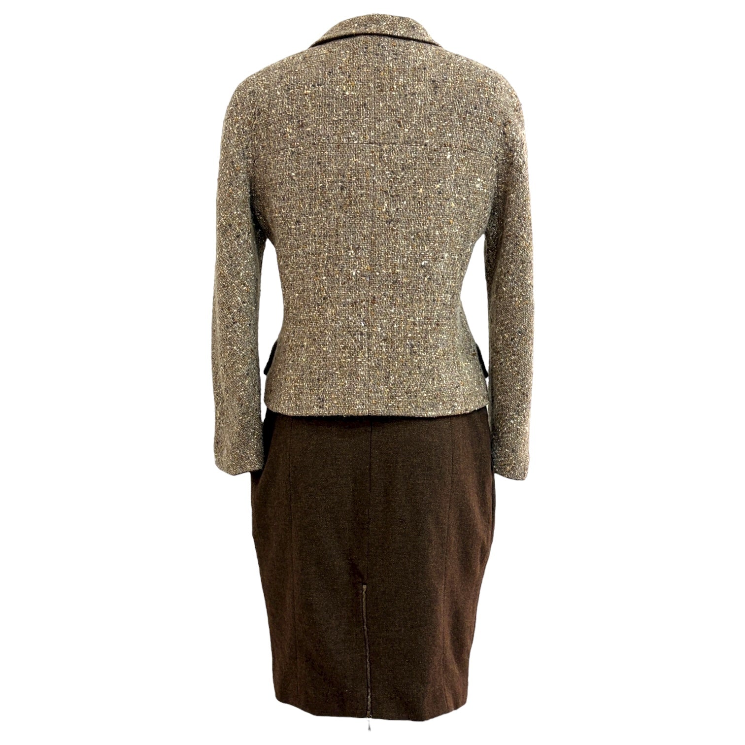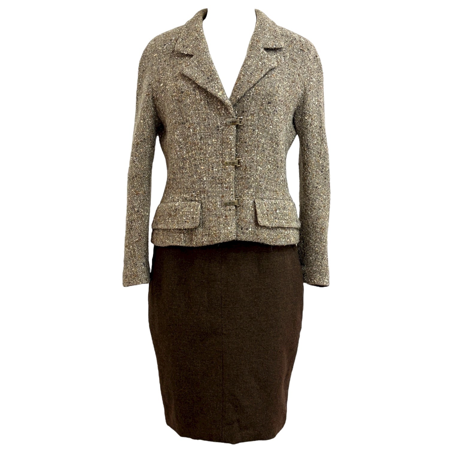 A refined Chanel jacket and skirt set crafted from luxurious brown wool tweed. The fitted jacket showcases notched lapels, flap pockets, and signature Chanel clasp closures, while the coordinating pencil skirt completes the timeless silhouette. An elegant expression of classic Chanel tailoring—perfect for sophisticated daywear or polished evening occasions.