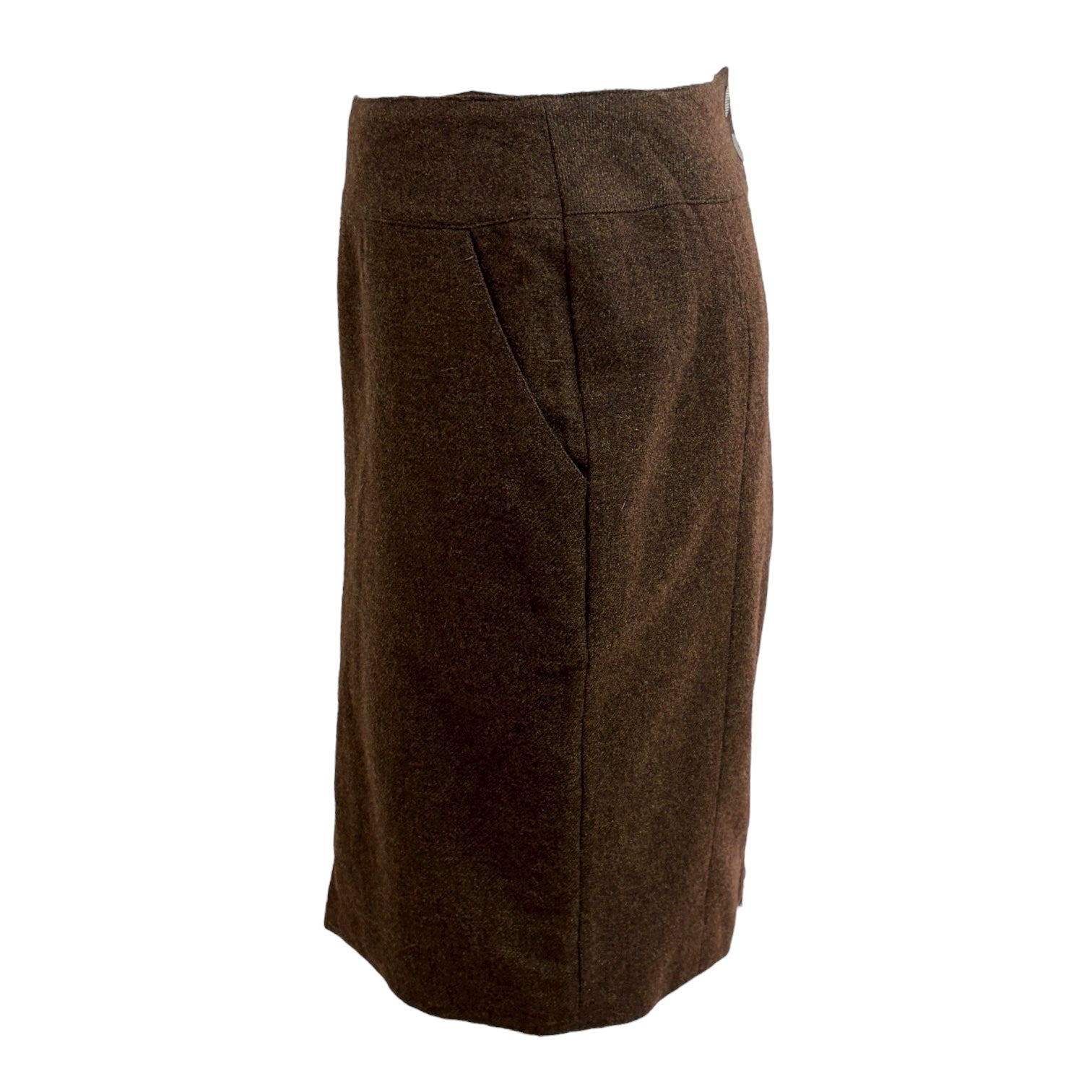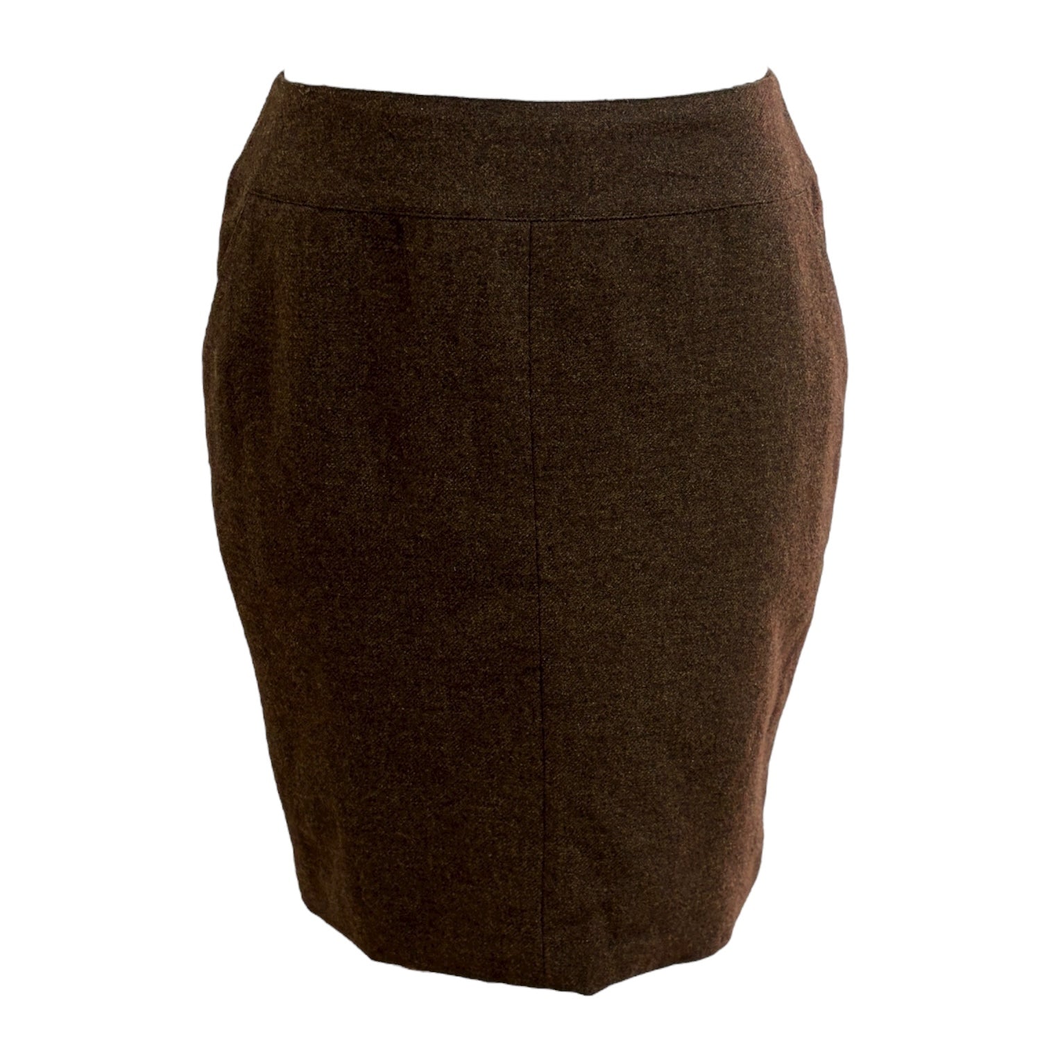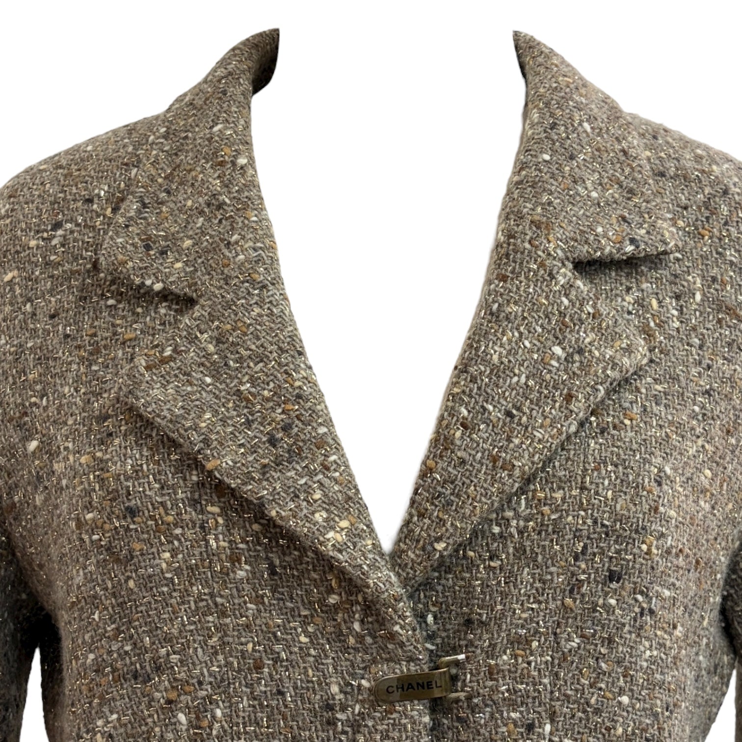 A refined Chanel jacket and skirt set crafted from luxurious brown wool tweed. The fitted jacket showcases notched lapels, flap pockets, and signature Chanel clasp closures, while the coordinating pencil skirt completes the timeless silhouette. An elegant expression of classic Chanel tailoring—perfect for sophisticated daywear or polished evening occasions.