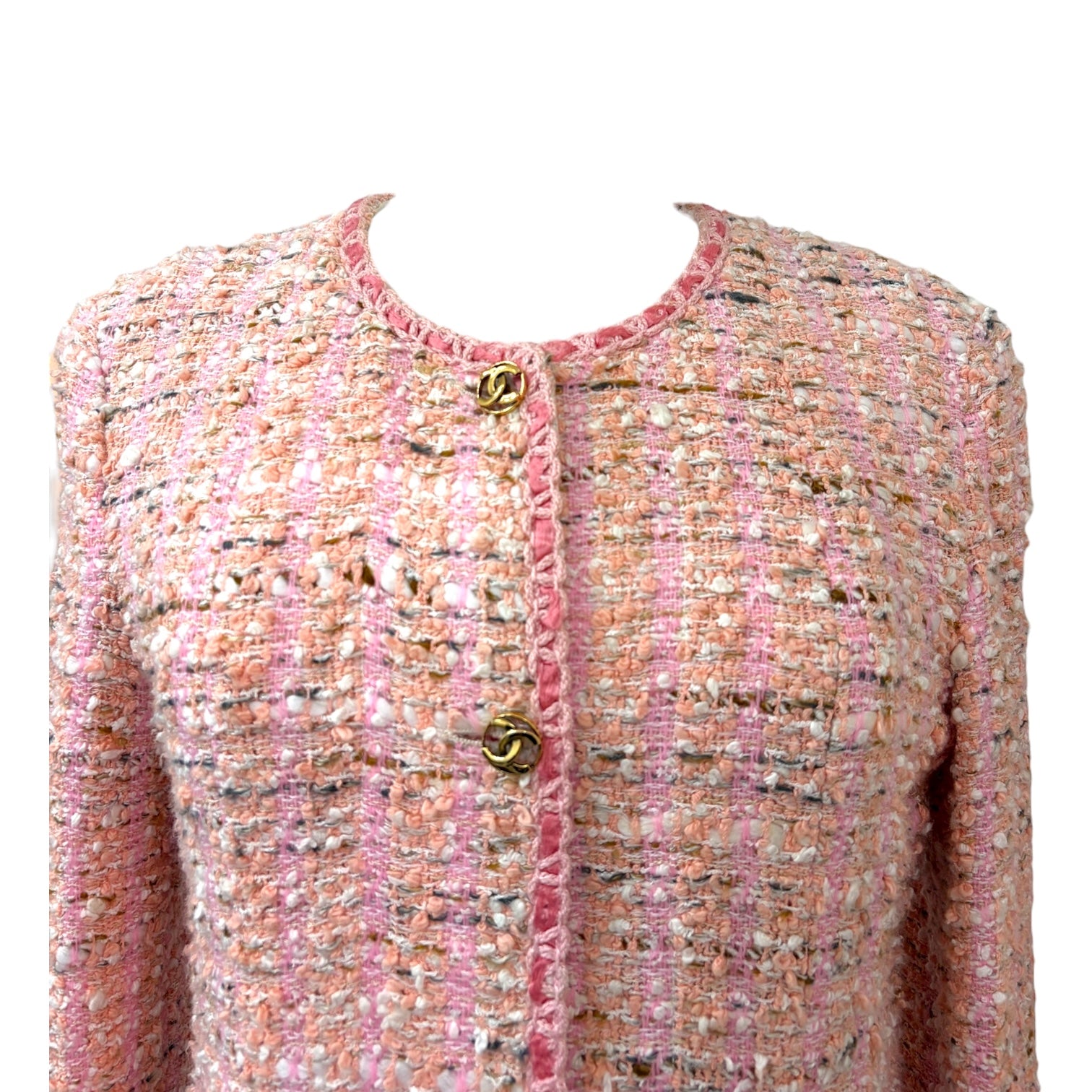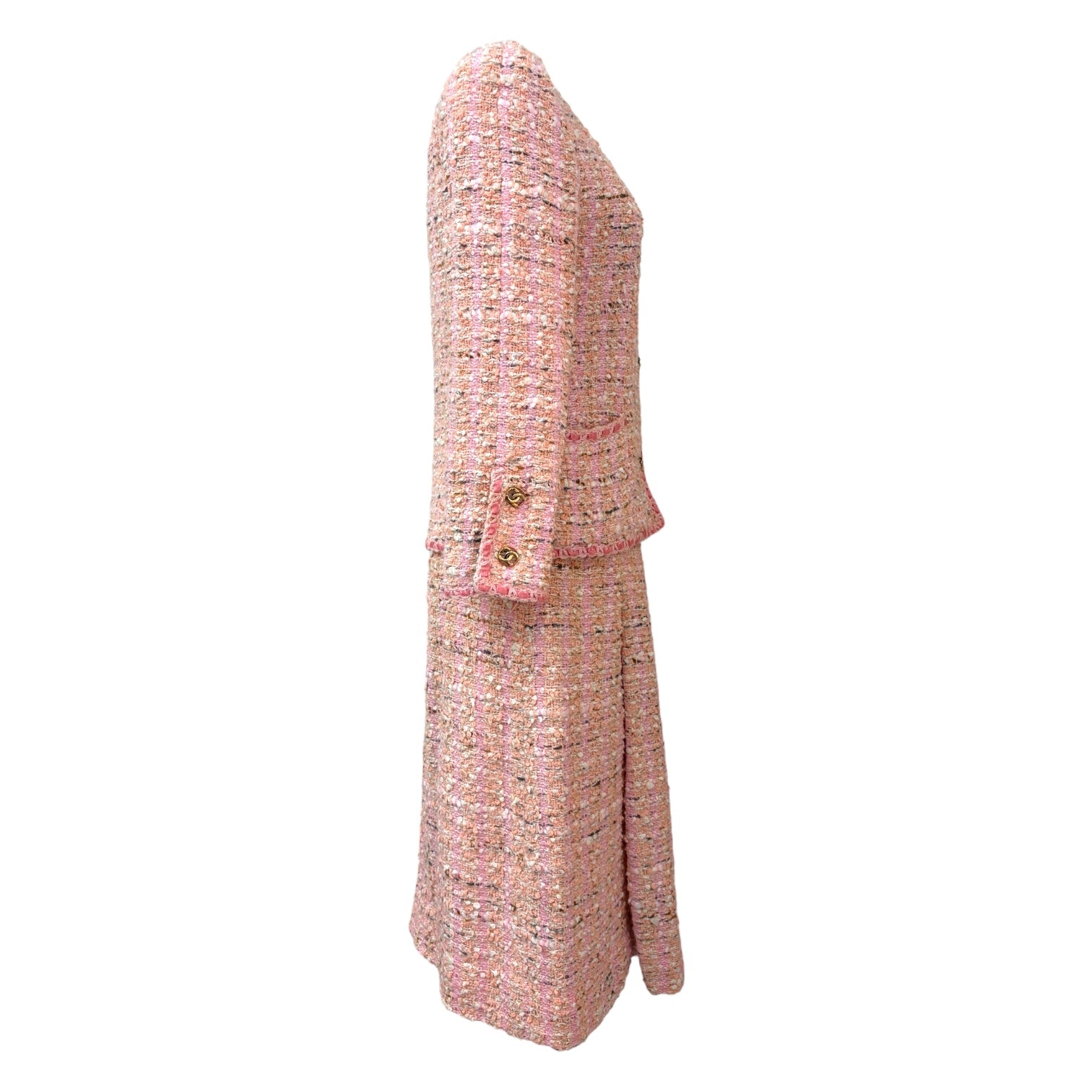 Elegant Chanel two-piece set in signature pink multicolor tweed, featuring a classic collarless jacket with gold-tone CC buttons and matching pencil skirt. Trimmed with pink woven detailing for a refined finish, this ensemble embodies timeless Chanel sophistication and feminine allure—perfect for both daytime elegance and evening chic.