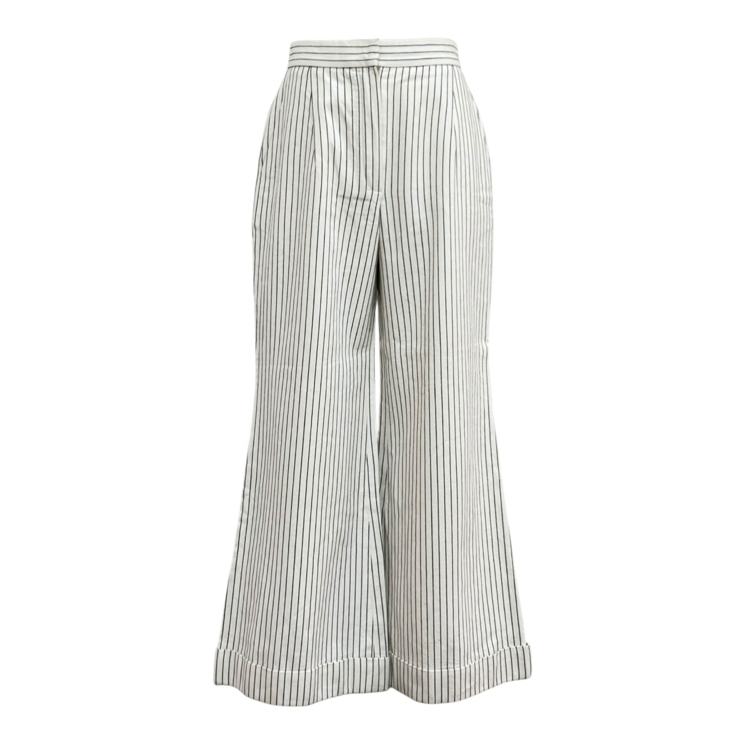 These Chanel pants embody effortless Parisian sophistication with their crisp white base and fine black pinstripe detailing. Crafted from a lightweight, structured fabric, they feature a high-rise waist, pleated front, and wide-leg silhouette with turned-up cuffs for a tailored finish. Perfect for pairing with a silk blouse or classic tweed jacket for an elegant daytime look.