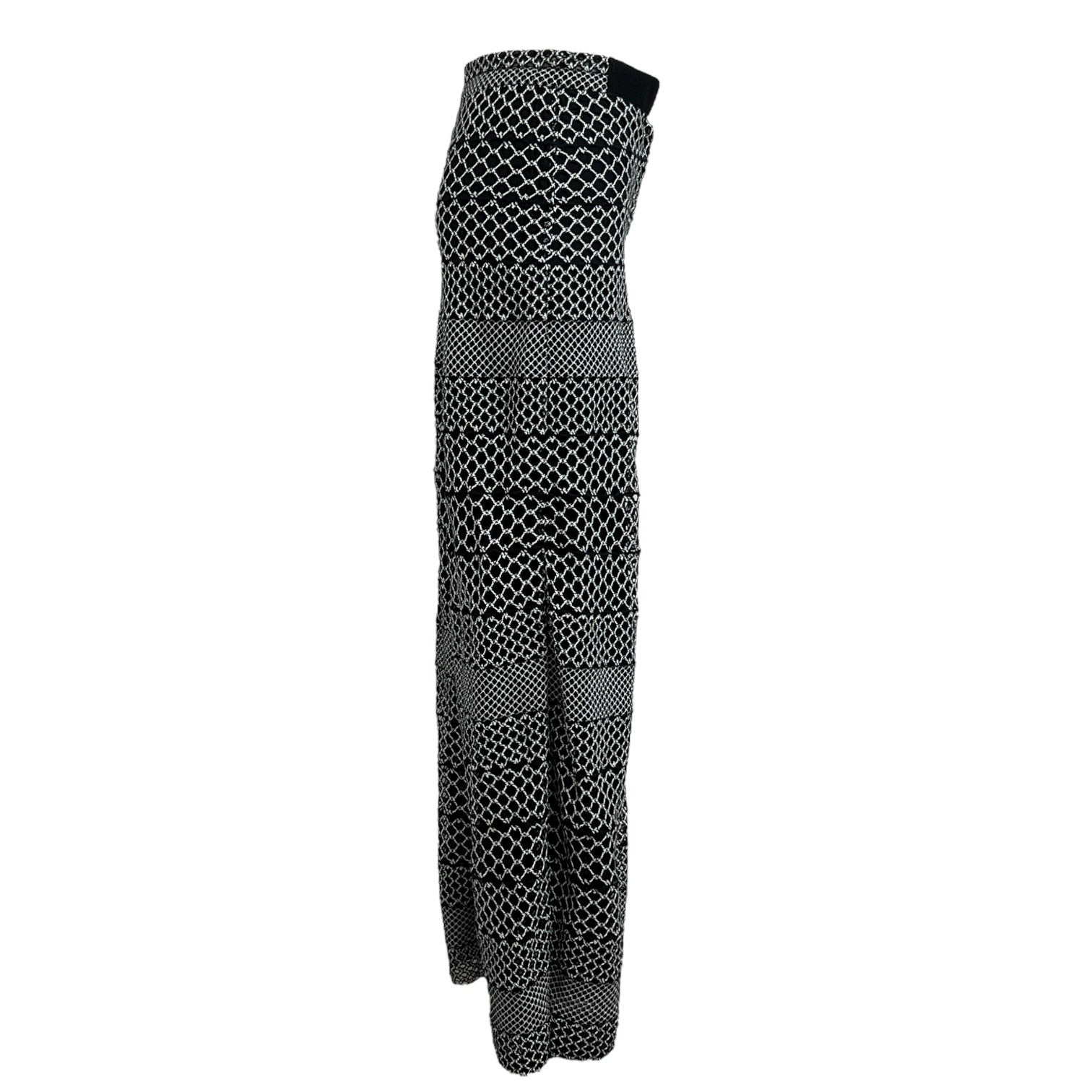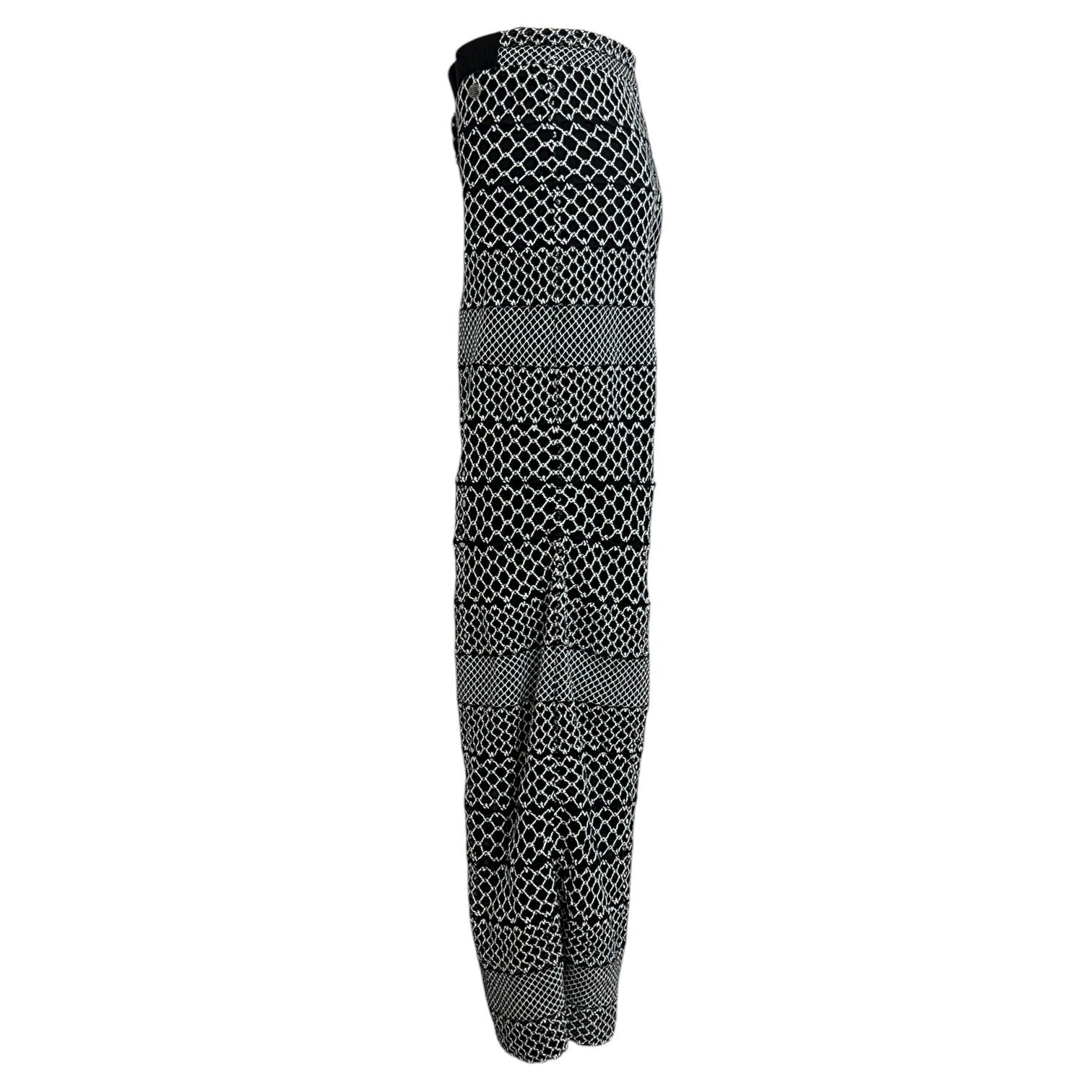 These Chanel wide-leg pants feature a sophisticated black and white geometric knit pattern, offering a timeless yet contemporary look. Crafted from 100% cotton, the design provides both structure and breathability, ensuring all-day comfort. The high-waisted silhouette and fluid drape create a flattering fit, perfect for both casual elegance and elevated daywear.