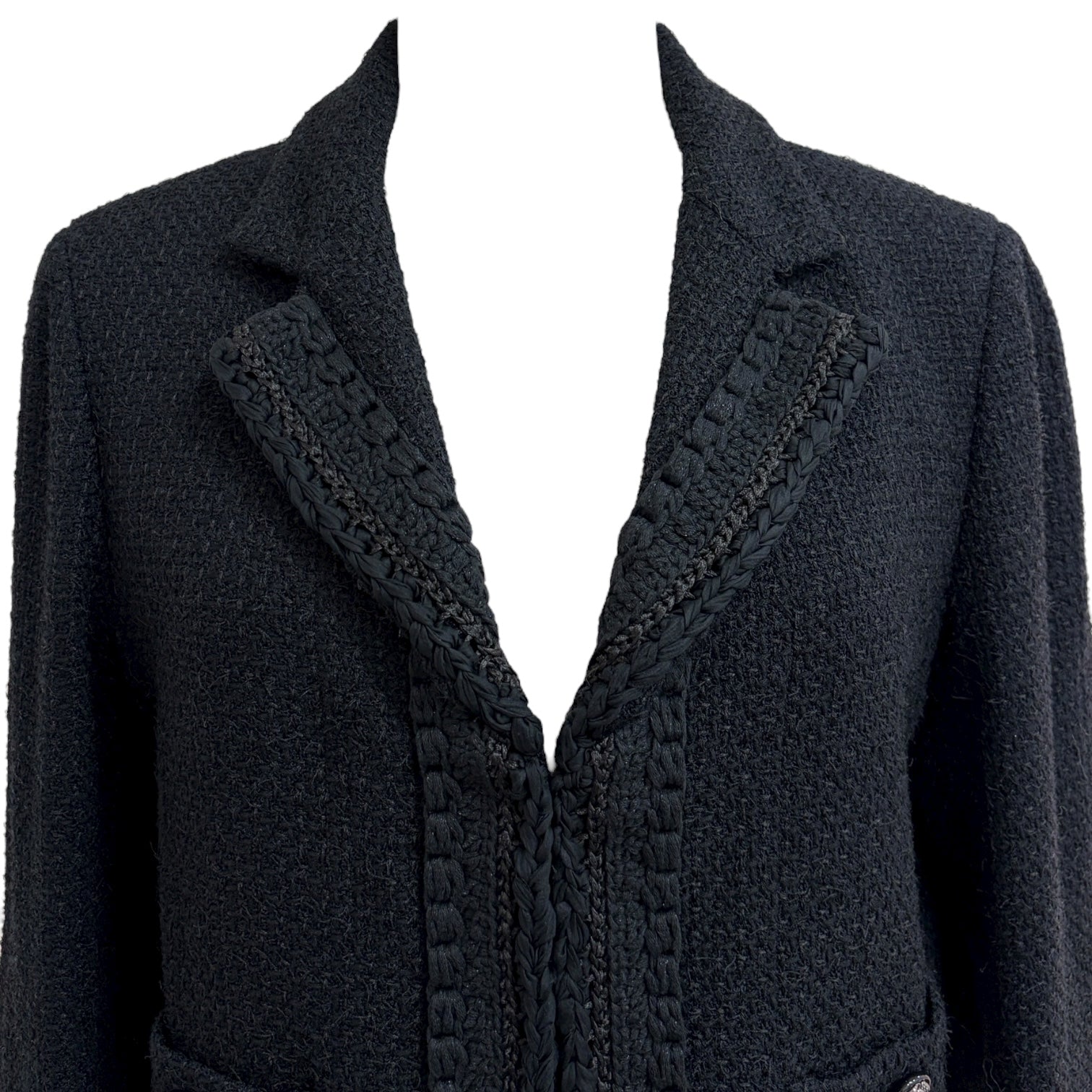 A timeless Chanel cropped jacket crafted from classic black tweed, showcasing the maison’s refined craftsmanship. The design features signature braided trim detailing along the lapels and front, adorned with silver-tone logo-engraved buttons on the cuffs and pockets for an elegant finish. The structured silhouette and slightly cropped length exude modern sophistication while maintaining Chanel’s signature Parisian elegance.