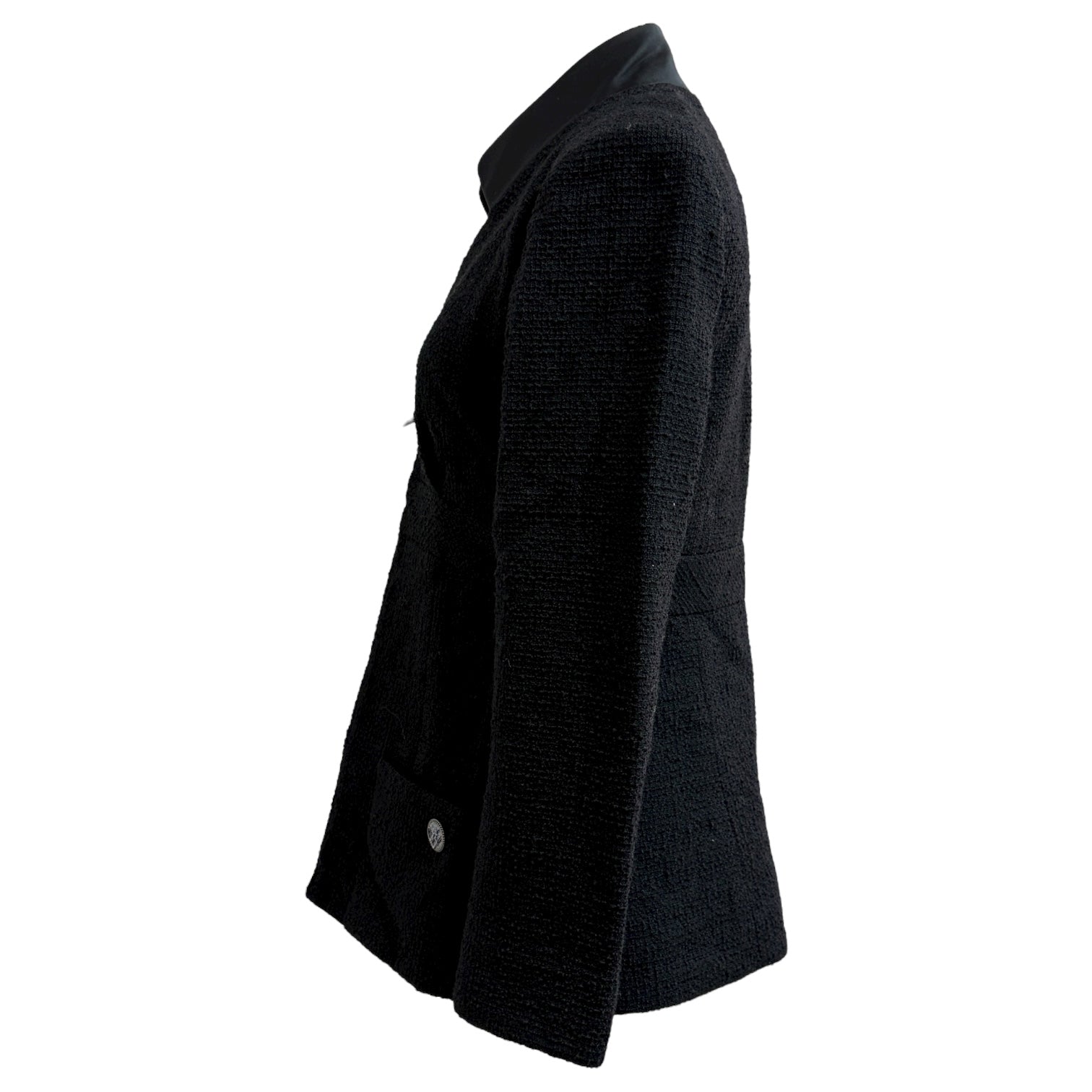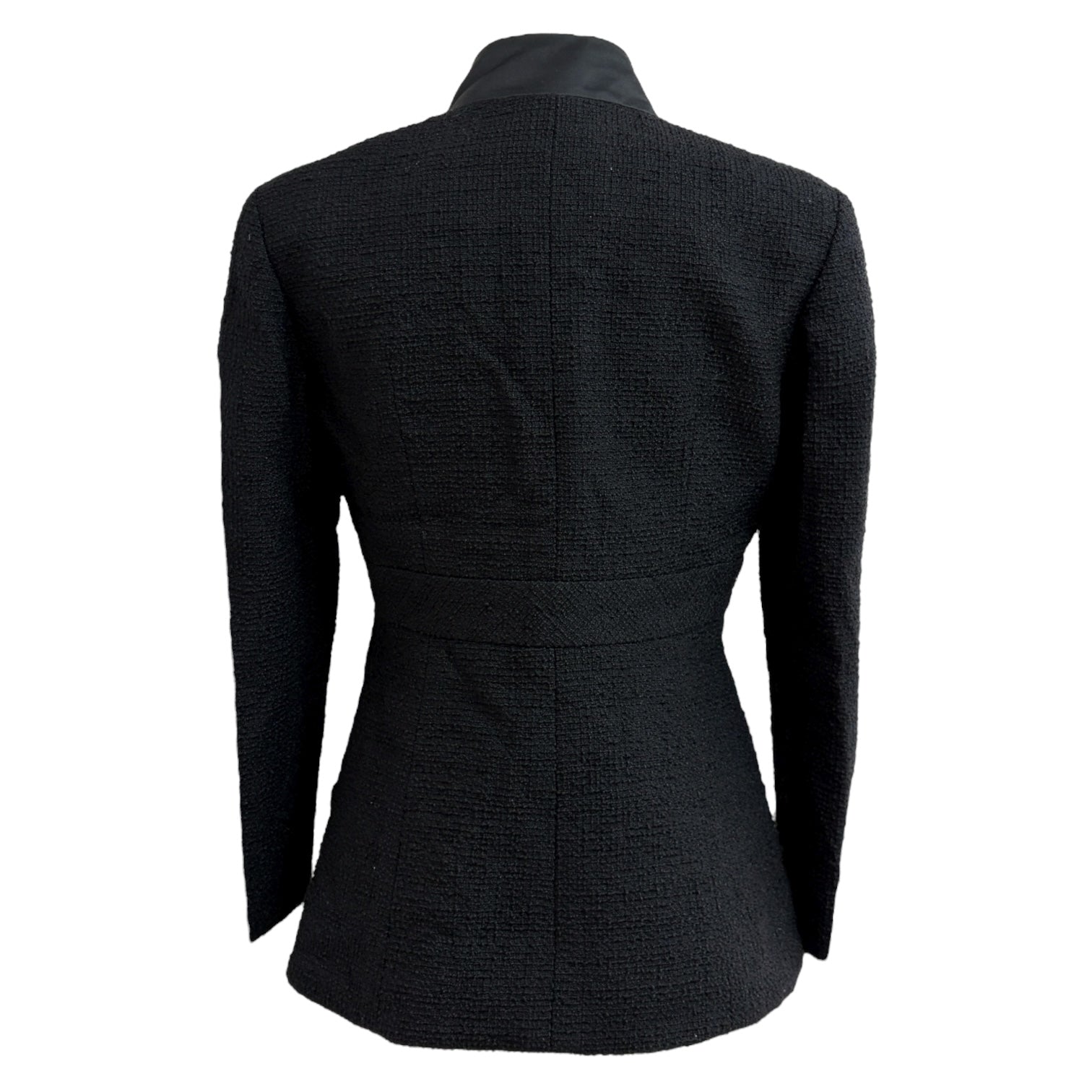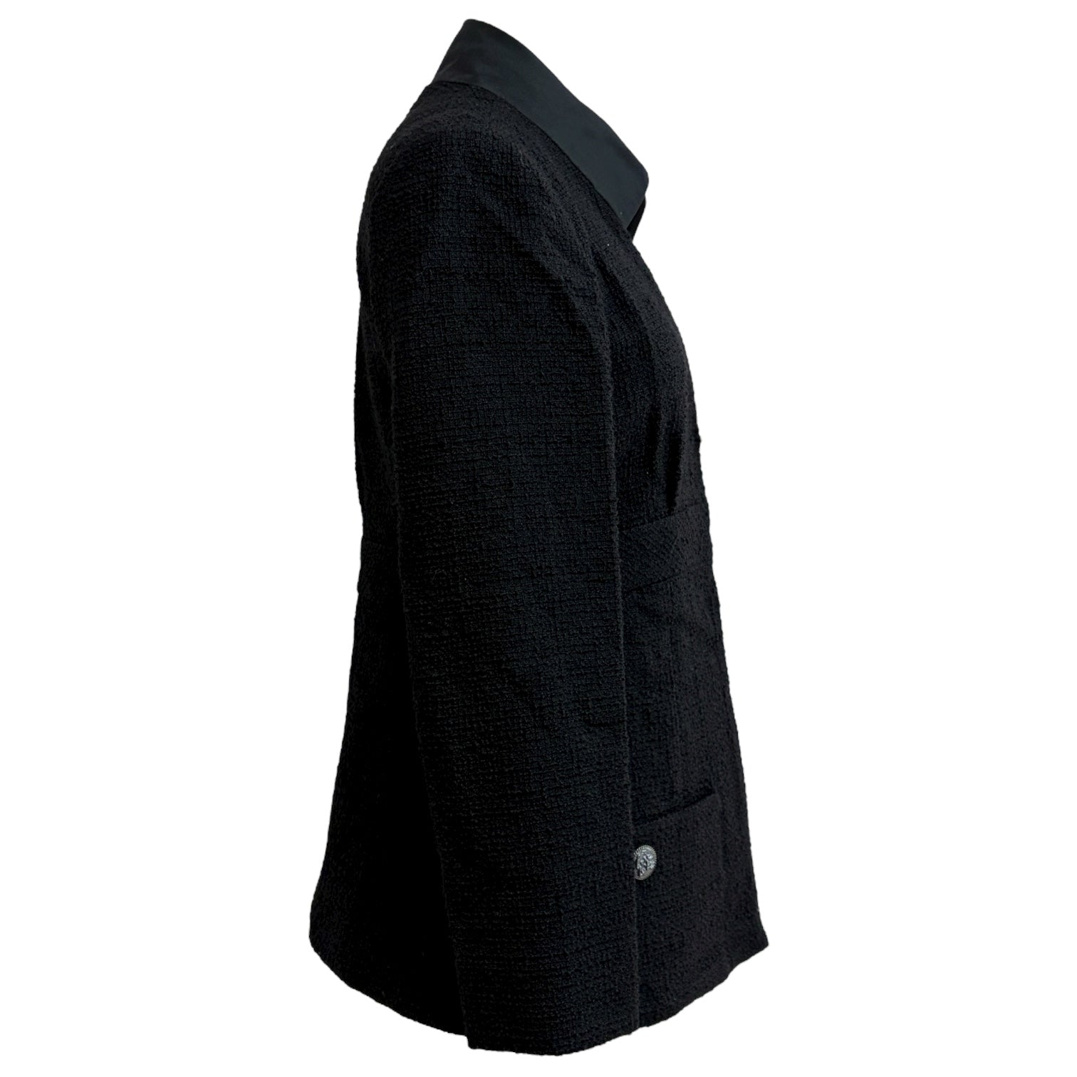 A sleek reimagining of the classic Chanel silhouette, this black tweed jacket features a sculpted waistline and modern zip-front closure for a contemporary edge. The neckline is elegantly finished with a black satin trim, adding a refined contrast to the textured tweed. Iconic CC-engraved silver-tone buttons adorn the front pockets, embodying timeless Chanel sophistication.
