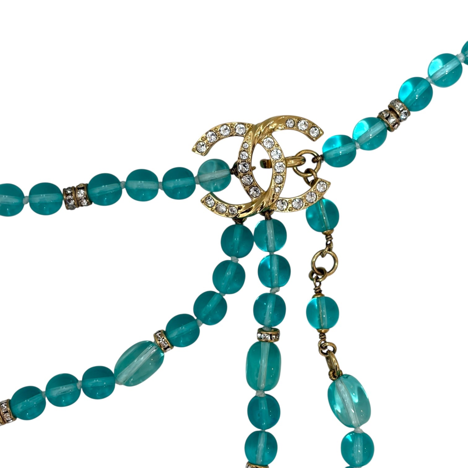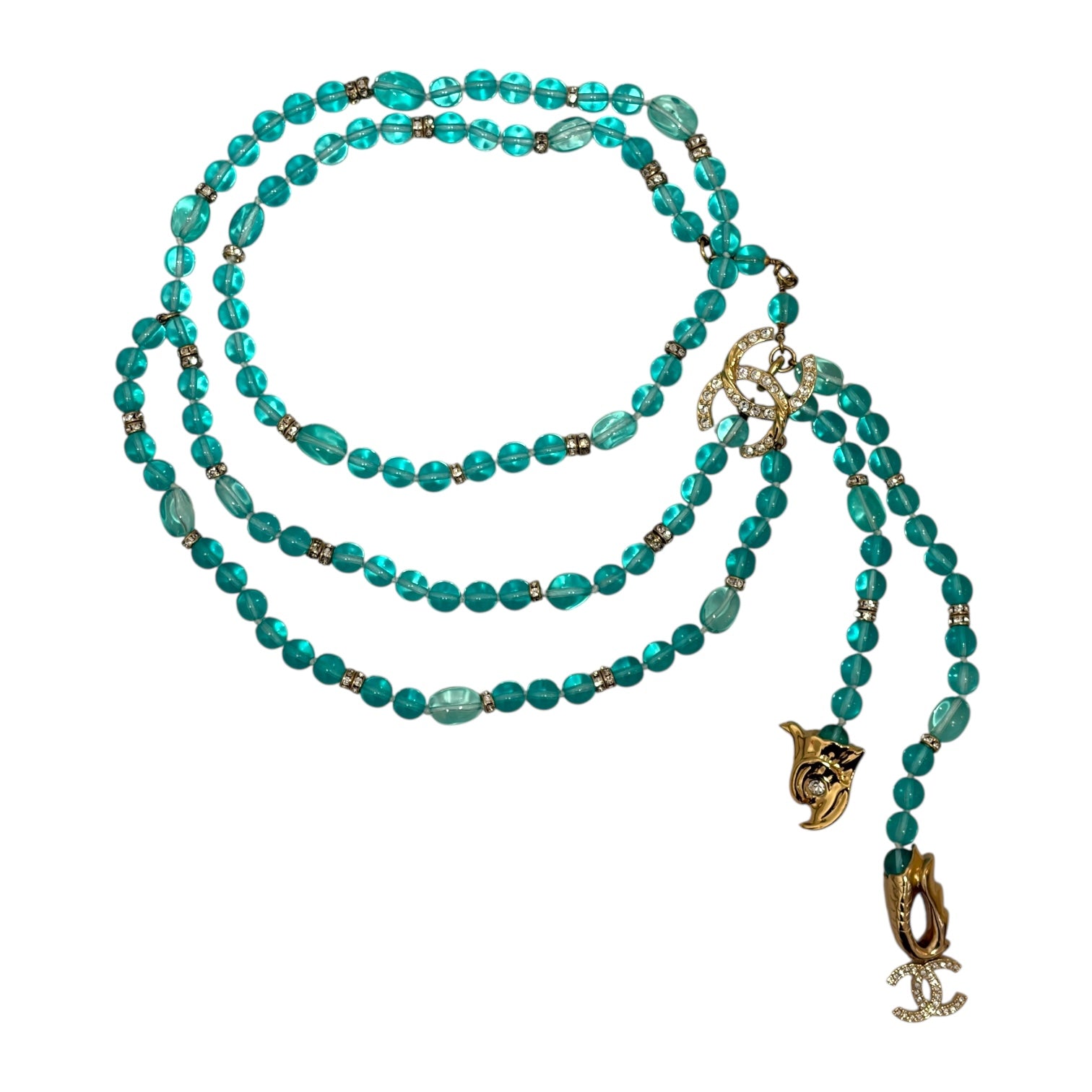 A stunning statement piece from Chanel, this turquoise beaded belt exudes elegance and versatility. Crafted with luminous glass beads and accented with gold-tone hardware, it features the iconic interlocking CC logo adorned with crystals. The cascading beaded tassels add movement and allure, making it perfect for accentuating the waist or styling as a statement necklace.