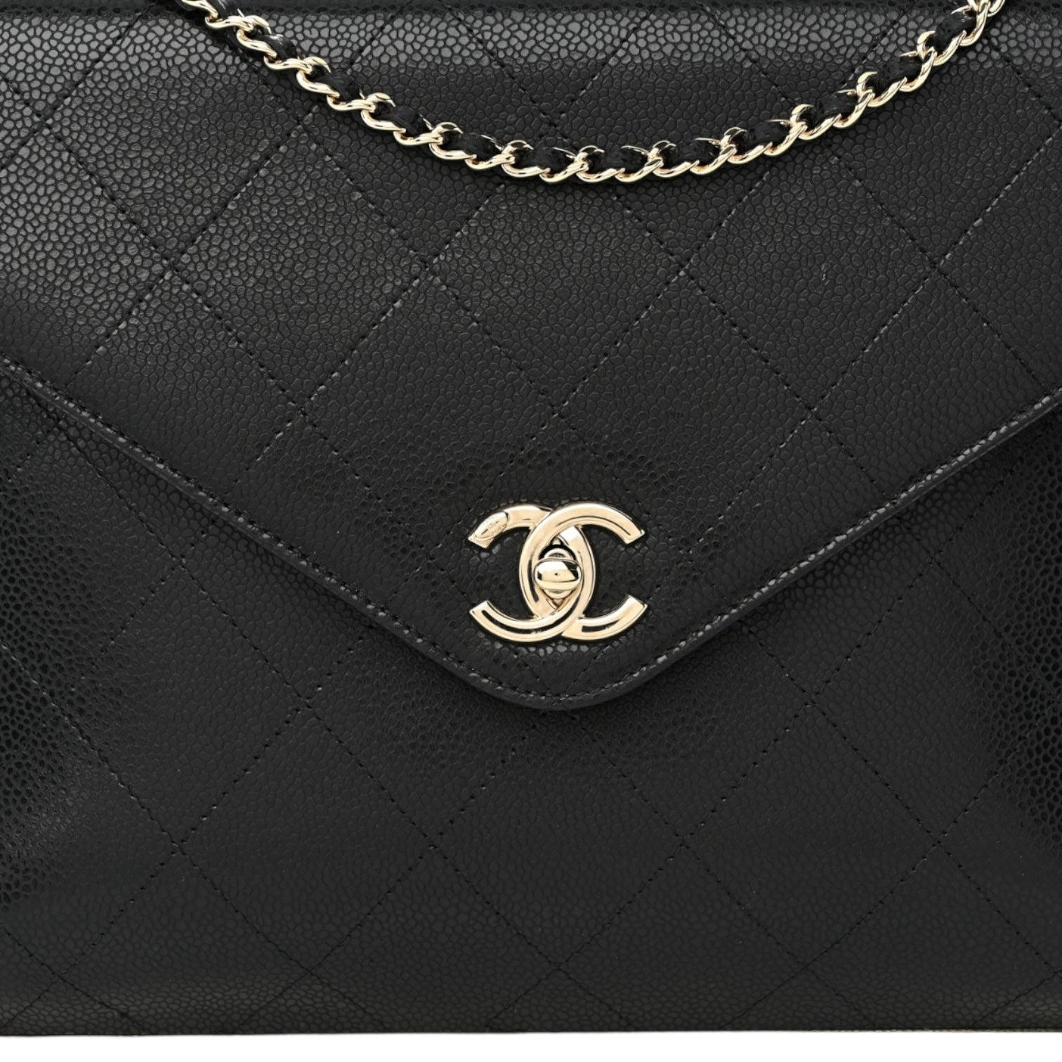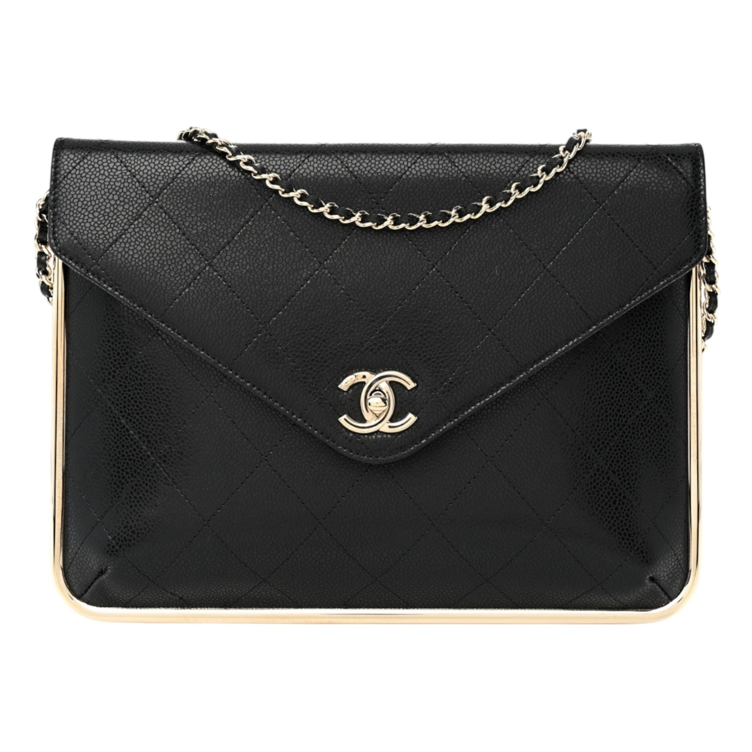 Sleek and sophisticated, this Chanel Envelope Clutch Wallet On Chain is crafted from durable black grained calfskin leather, known for its subtle texture and resistance to wear. Its structured envelope silhouette is finished with diamond quilting and framed by smooth leather piping for a refined edge.