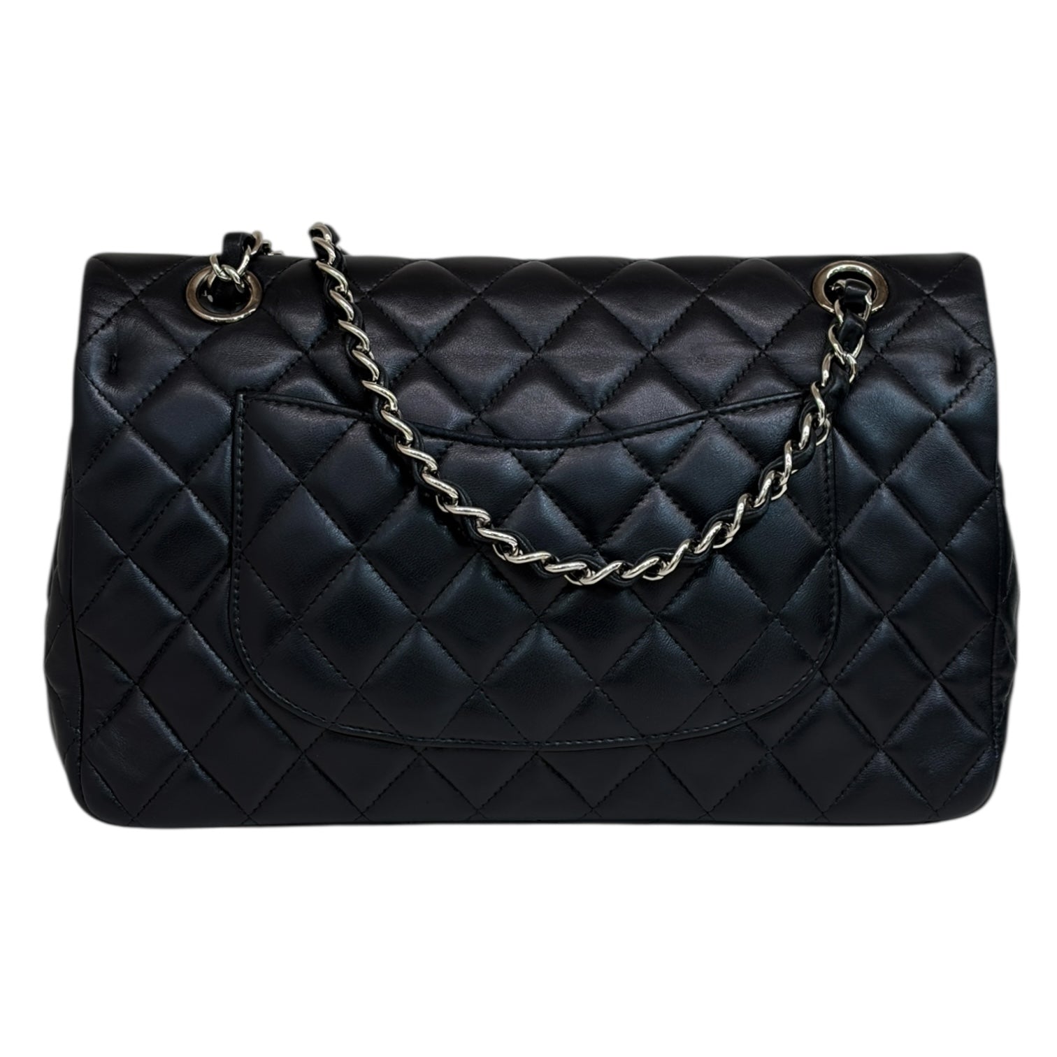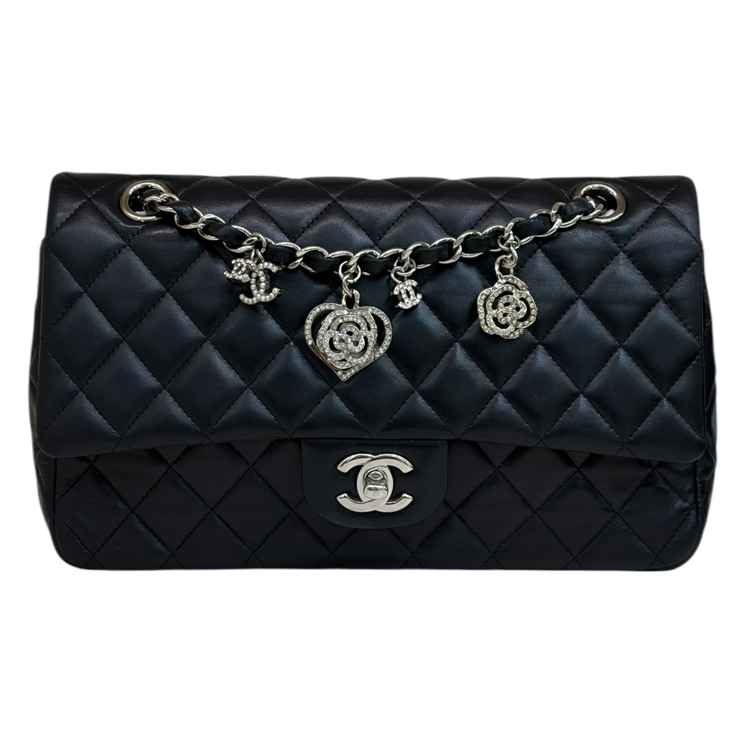 A romantic twist on a classic, this Chanel Medium Flap Bag is crafted from supple black quilted lambskin and adorned with sparkling Valentine’s crystal charms — including hearts, camellias, and the iconic CC logo — draped elegantly across the front chain. Finished with silver-tone hardware and the signature CC turn-lock closure, this piece captures timeless Chanel elegance with a playful, feminine edge. Perfect for adding a touch of glamour to any day or evening look.