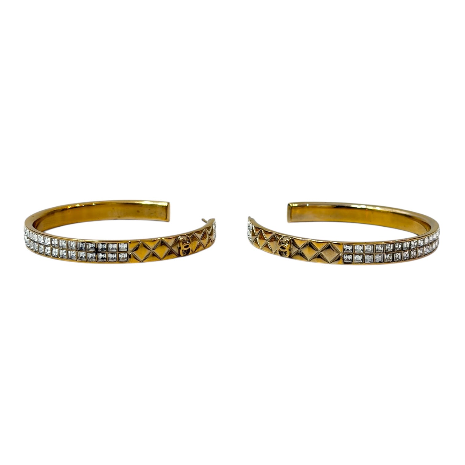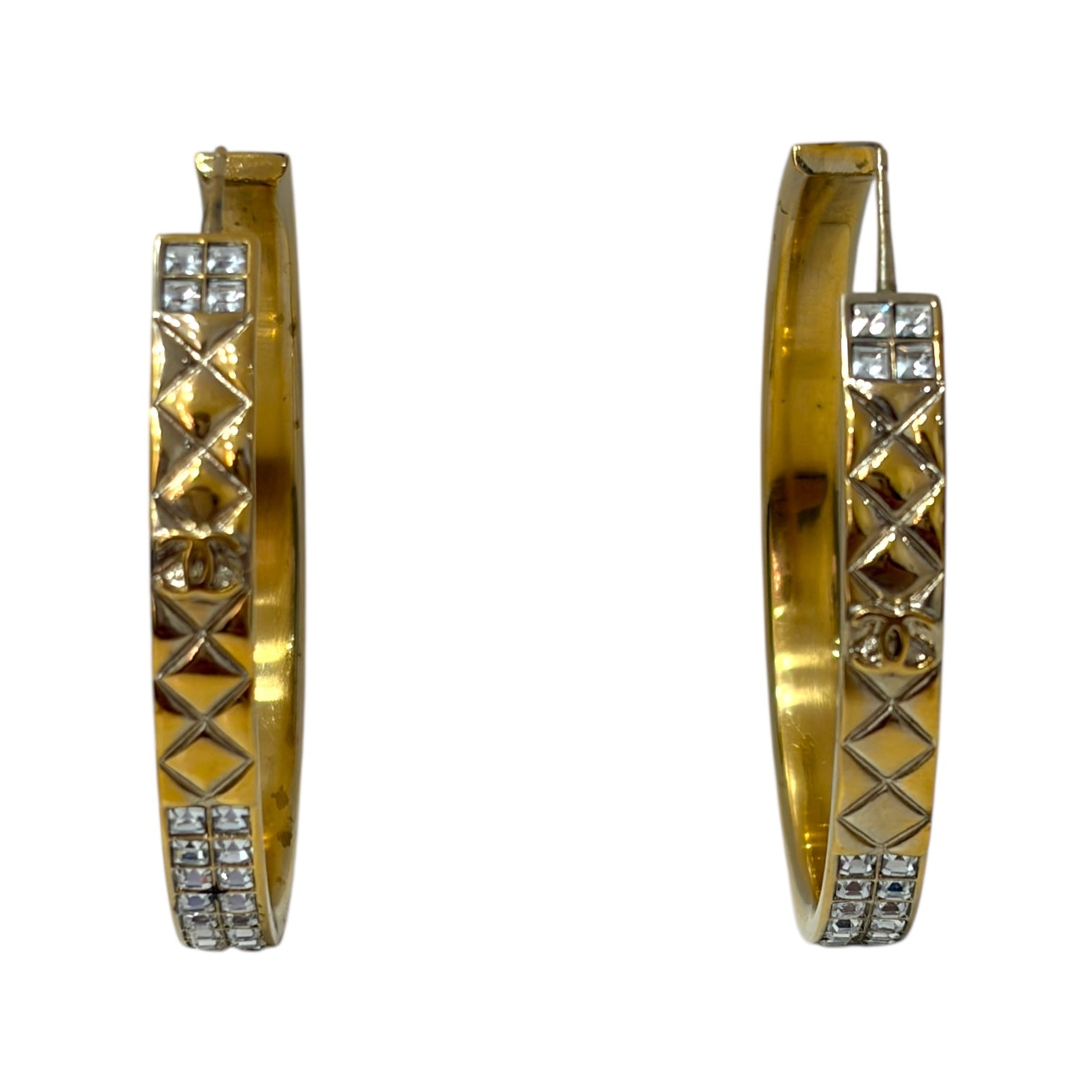These exquisite Chanel hoop earrings feature the brand’s signature quilted pattern, crafted in luxurious gold-tone metal. Each earring is adorned with sparkling clear crystals along the edges, adding refined brilliance and sophistication. The design perfectly balances Chanel’s timeless elegance with a touch of glamour — ideal for elevating both day and evening looks.