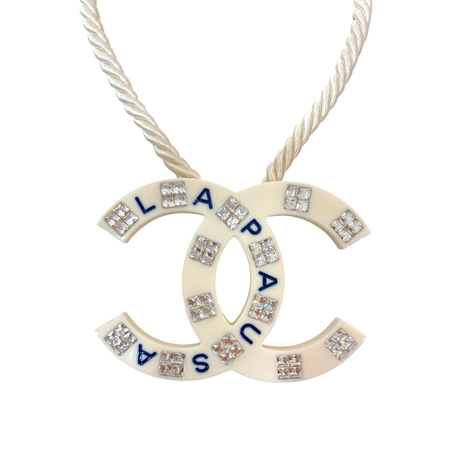 A standout Chanel Paris-Salzburg collection necklace, featuring an oversized ivory resin CC logo pendant adorned with blue “PARIS – SALZBURG” lettering and clear crystal embellishments. The pendant is suspended from a twisted ivory rope chain with gold-tone hardware, blending classic Chanel elegance with a bold statement aesthetic. This limited-edition piece pays homage to the Maison’s Paris–Salzburg Métiers d’Art collection, celebrated for its fusion of heritage craftsmanship and modern glamour — a true collector’s treasure.
