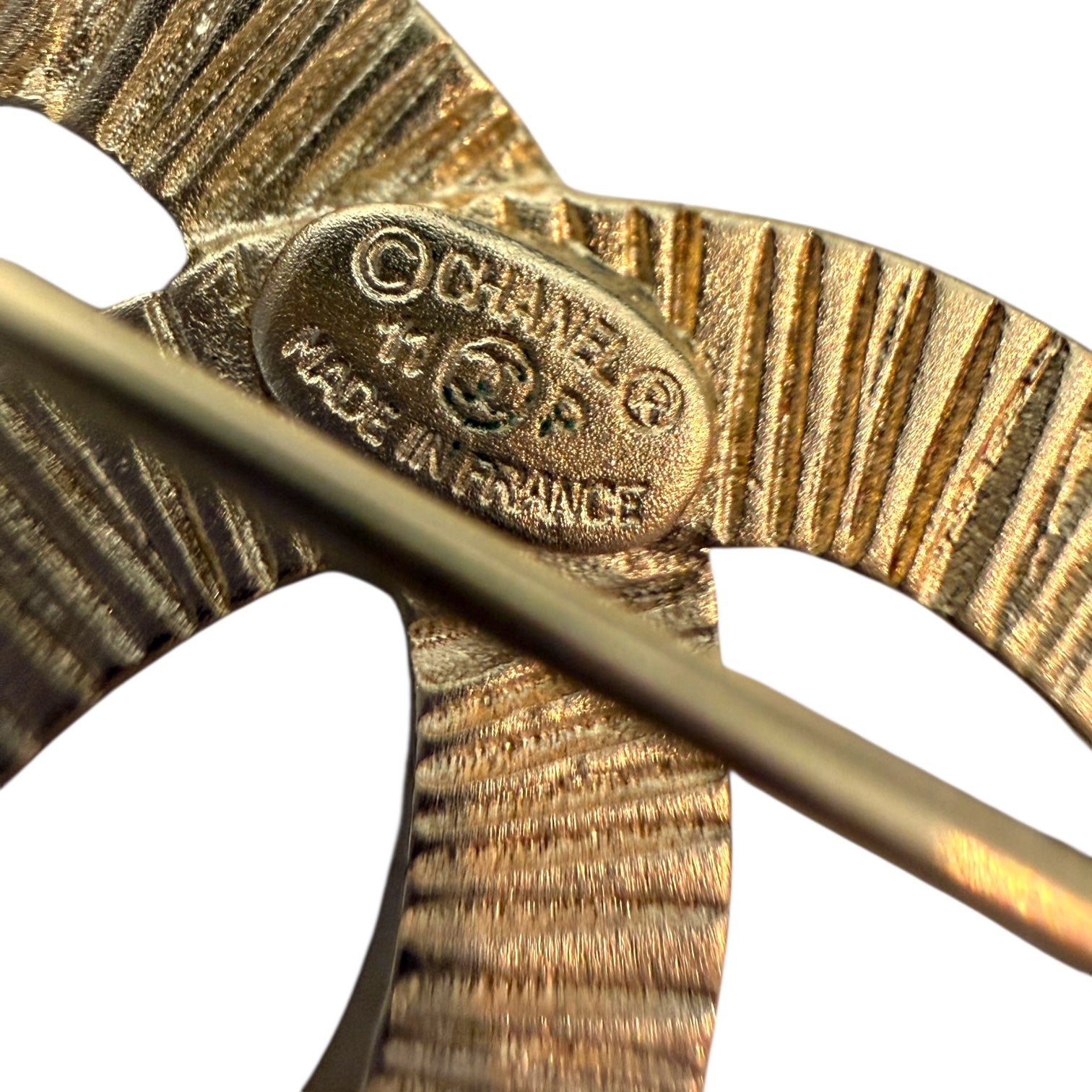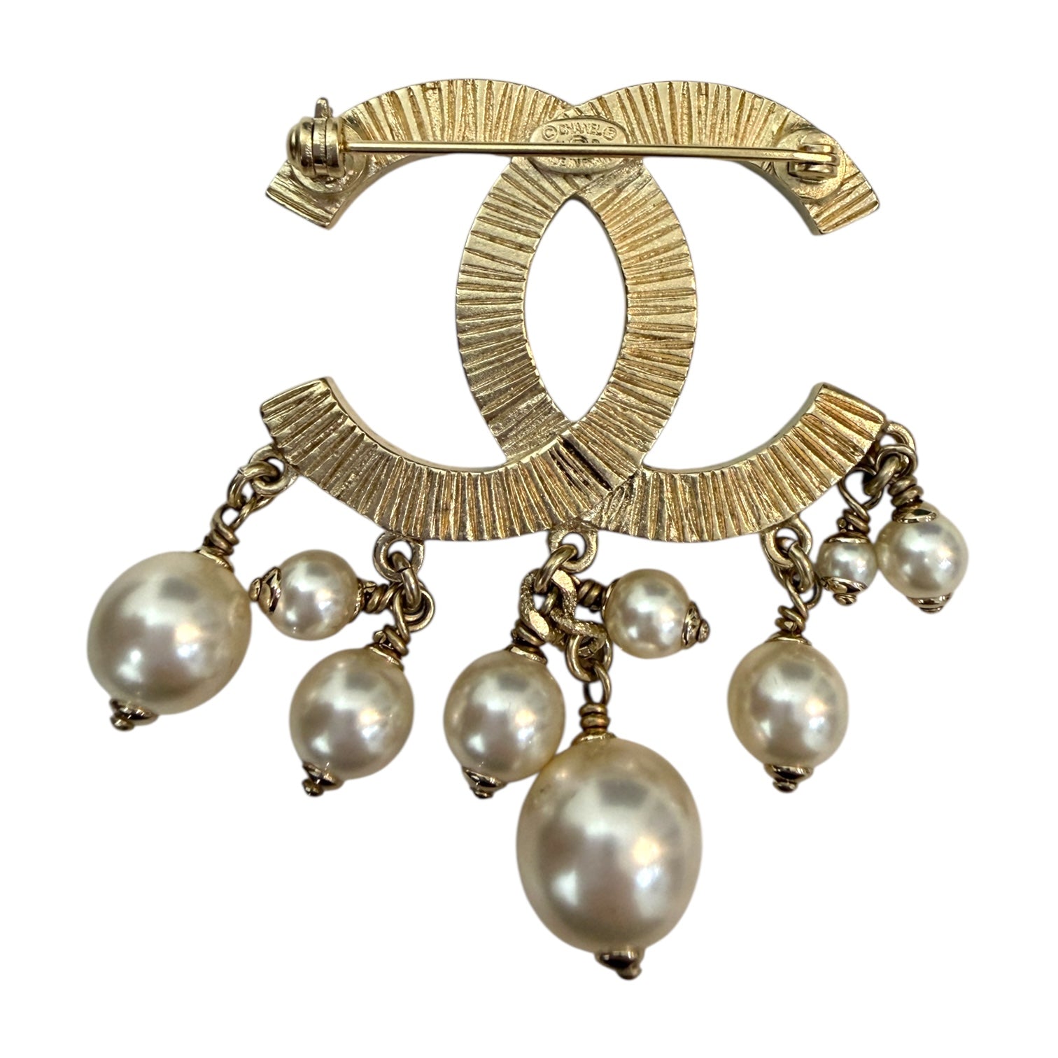 This elegant Chanel brooch features the signature CC logo in a beautifully textured gold-tone finish, adorned with cascading faux pearl drops of varying sizes. The intricate craftsmanship and movement of the pearls give it a timeless, feminine allure. A classic statement piece, perfect for elevating jackets, blazers, or dresses with Chanel’s unmistakable sophistication and vintage charm.