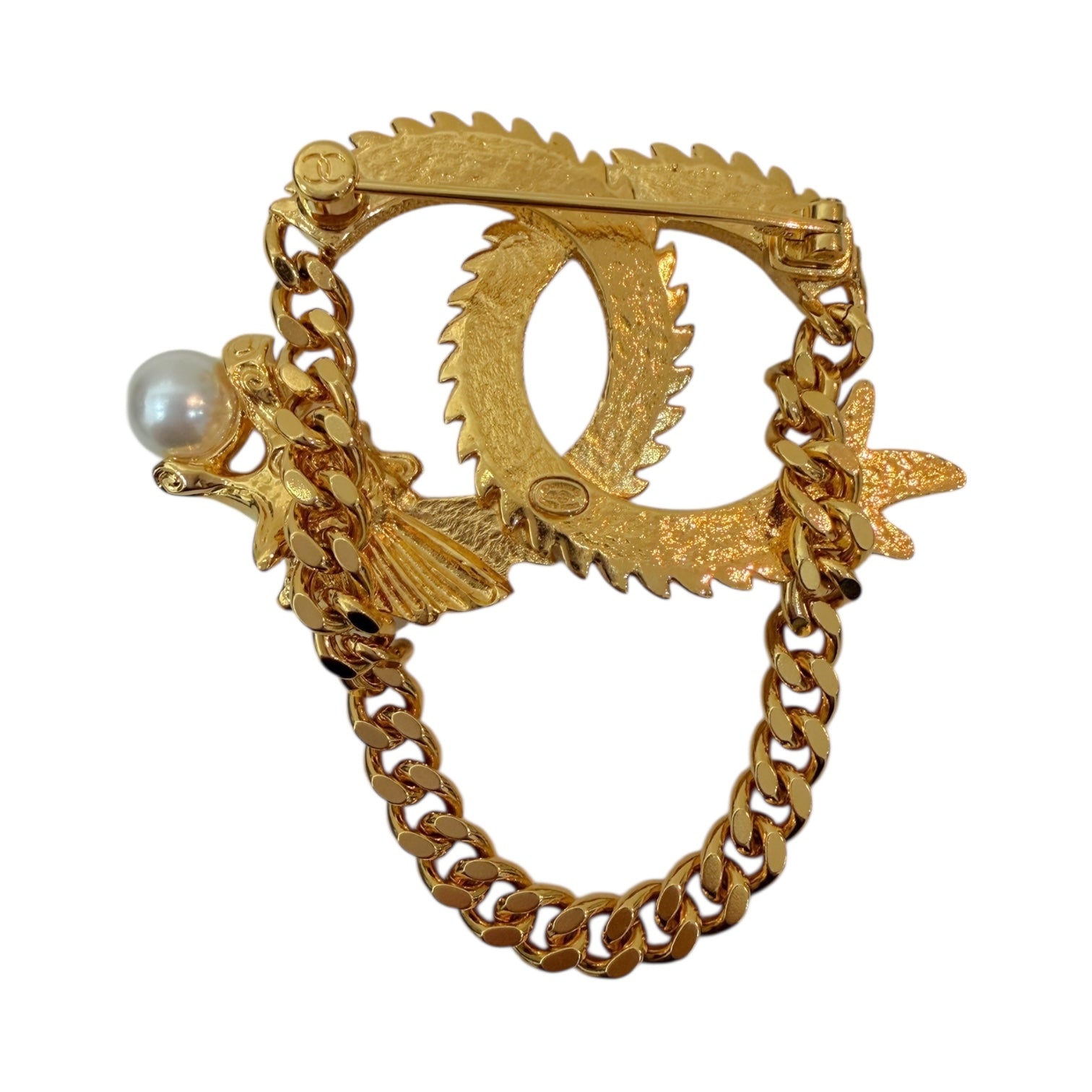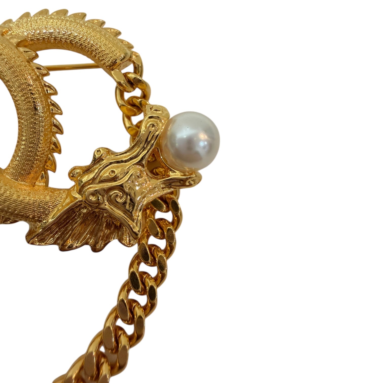 A rare and symbolic Chanel Lunar New Year brooch, crafted in antique gold-tone metal and featuring a majestic dragon motif encircling the iconic interlocking CC logo. The dragon holds a luminous faux pearl, representing prosperity and power, while a draped chain accent adds signature Chanel edge and sophistication. Inspired by the mythical symbolism of the Lunar New Year, this brooch celebrates strength, elegance, and renewal — a true collector’s piece blending Chanel’s timeless craftsmanship with cultural artistry.