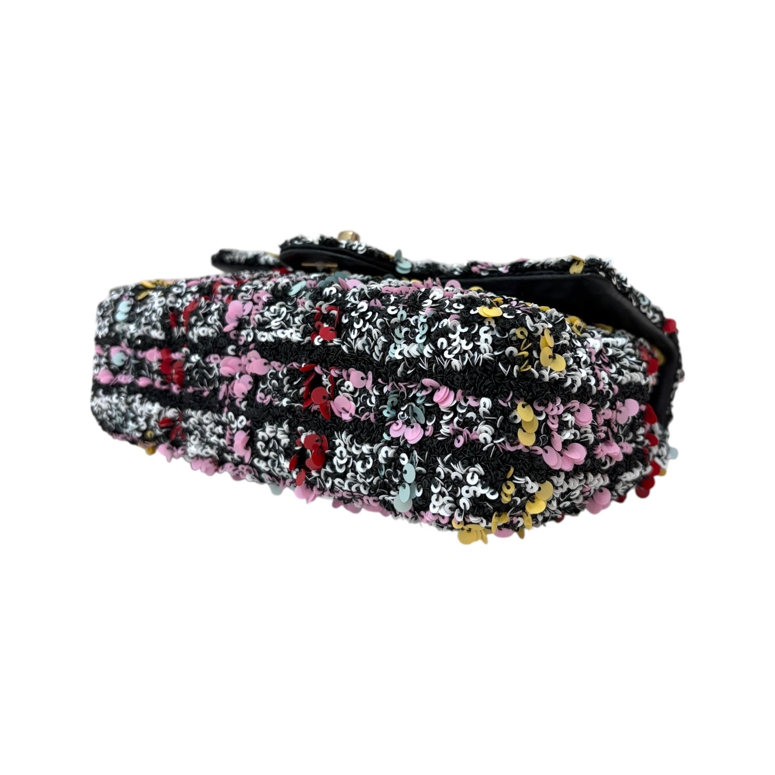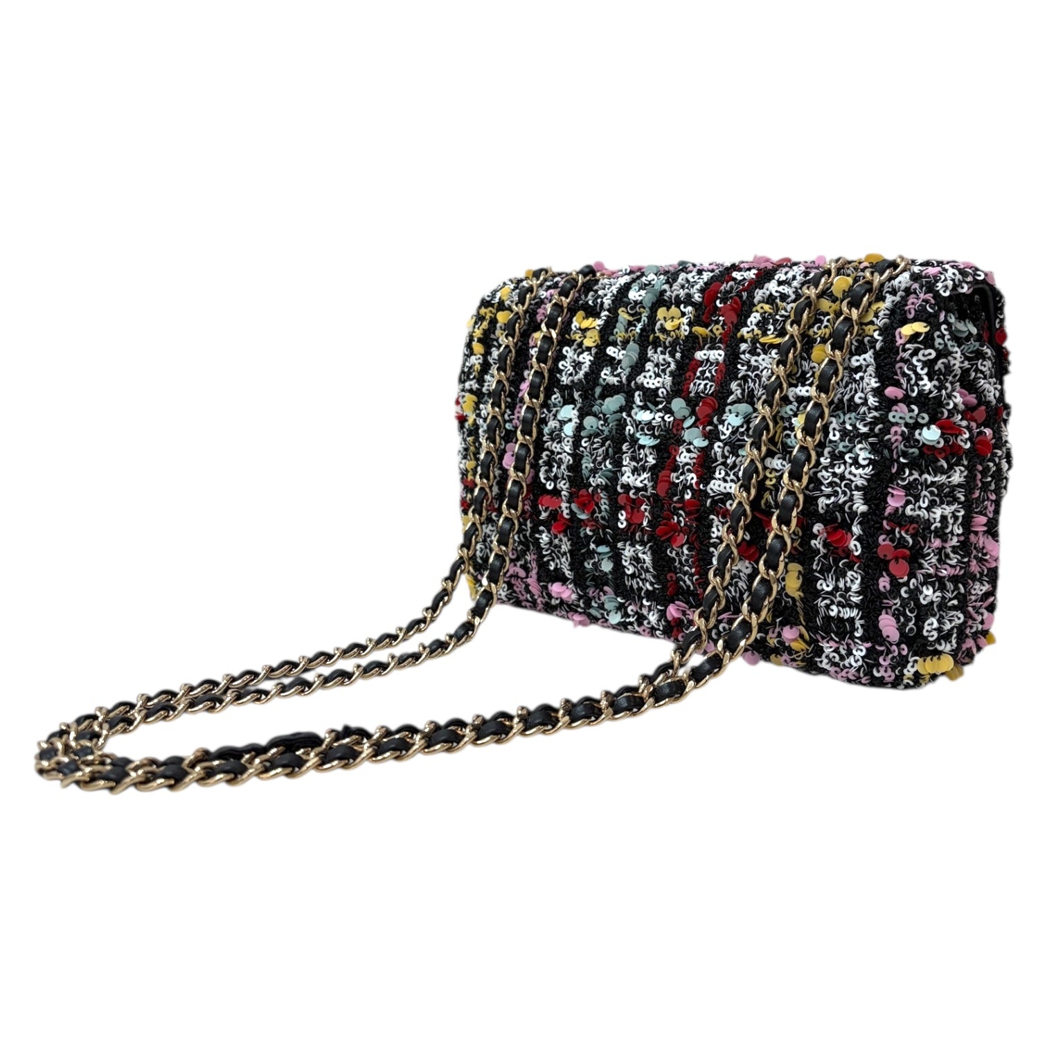This striking Chanel Small Flap Bag dazzles with its intricate multicoloured sequin embroidery, arranged in a textured grid pattern of black, red, yellow, pink, and aqua tones. Finished with the signature CC turn-lock closure and a gold-tone chain strap interwoven with leather, this piece blends timeless Chanel elegance with playful vibrancy. A rare, eye-catching design that adds instant glamour to both day and evening looks.