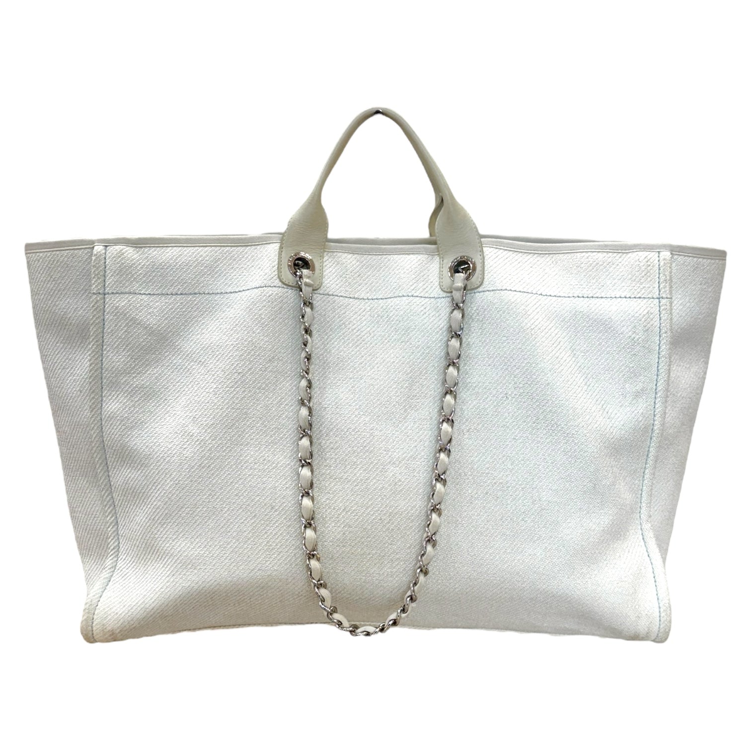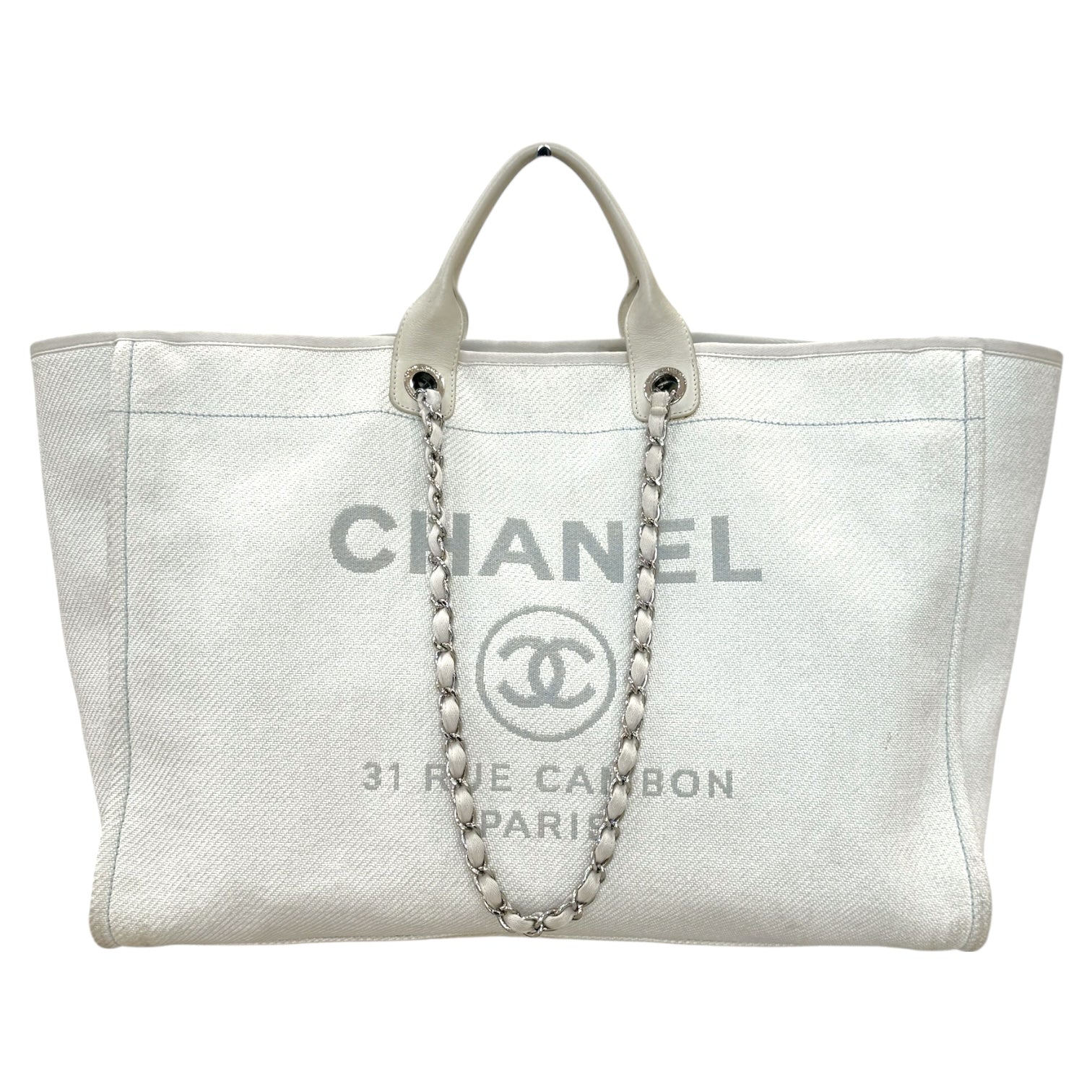 A modern classic from Chanel’s leisure-inspired collection, the Large Deauville Tote combines casual sophistication with everyday practicality. Crafted from durable white canvas with grey “CHANEL 31 Rue Cambon Paris” embroidery, this spacious tote embodies relaxed luxury and effortless style.