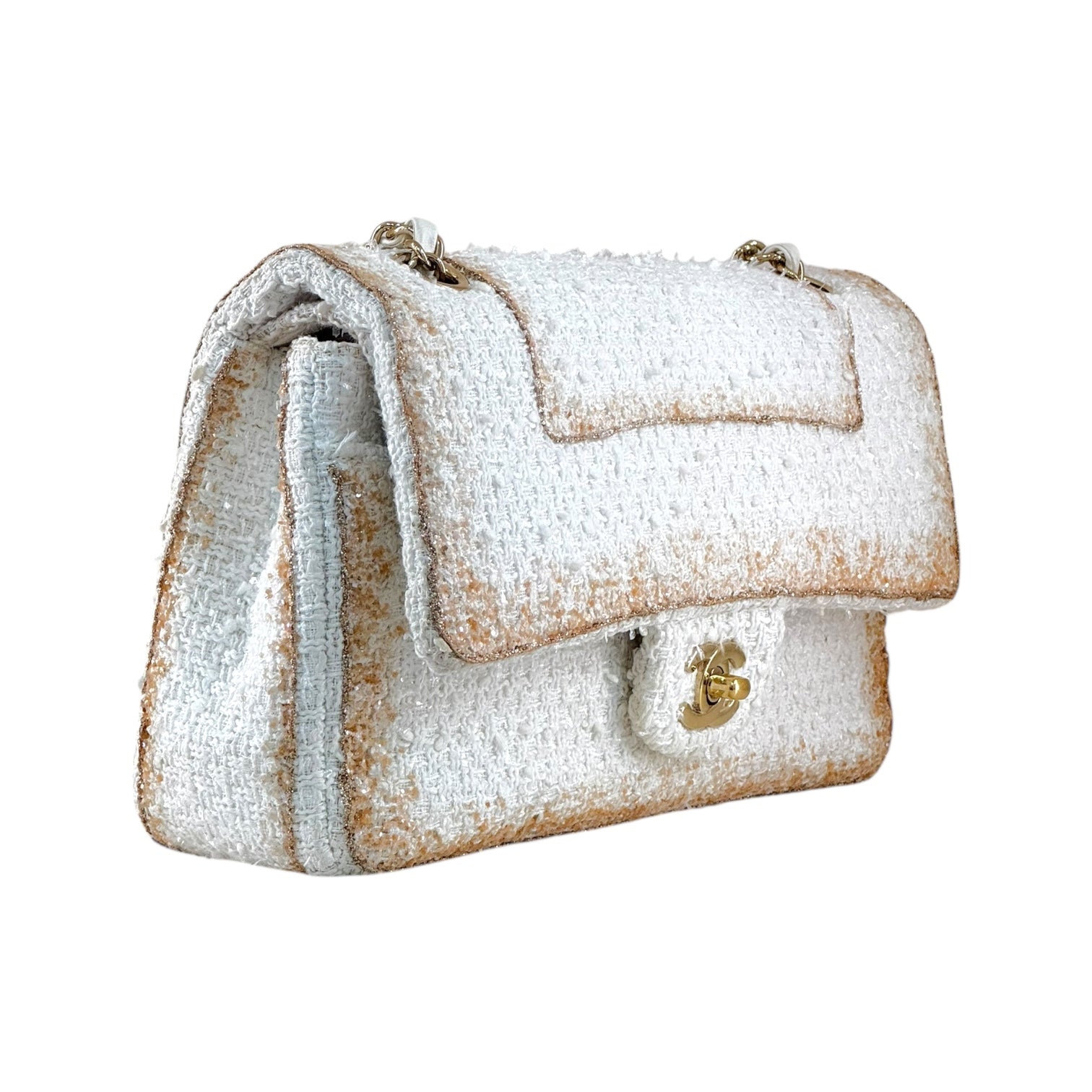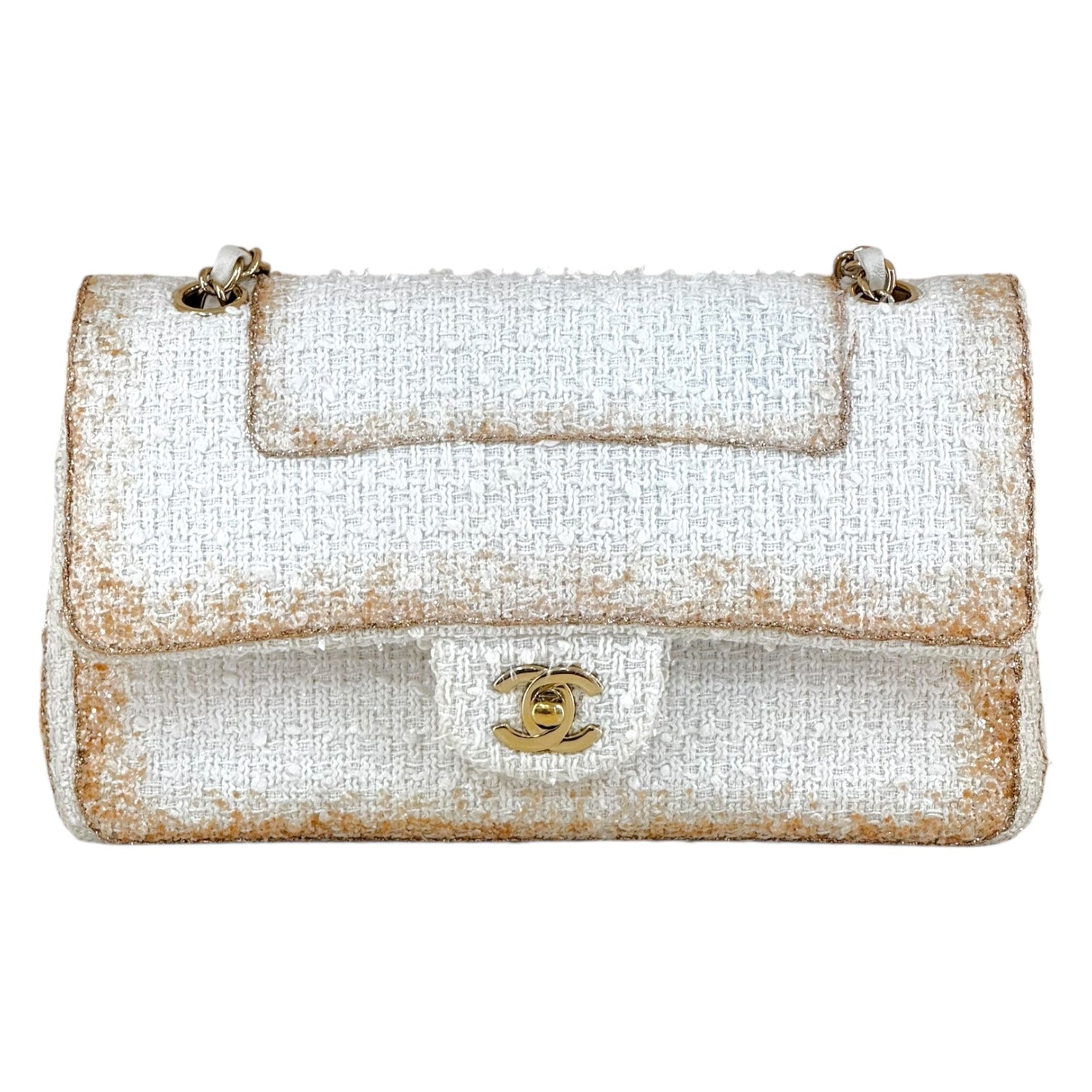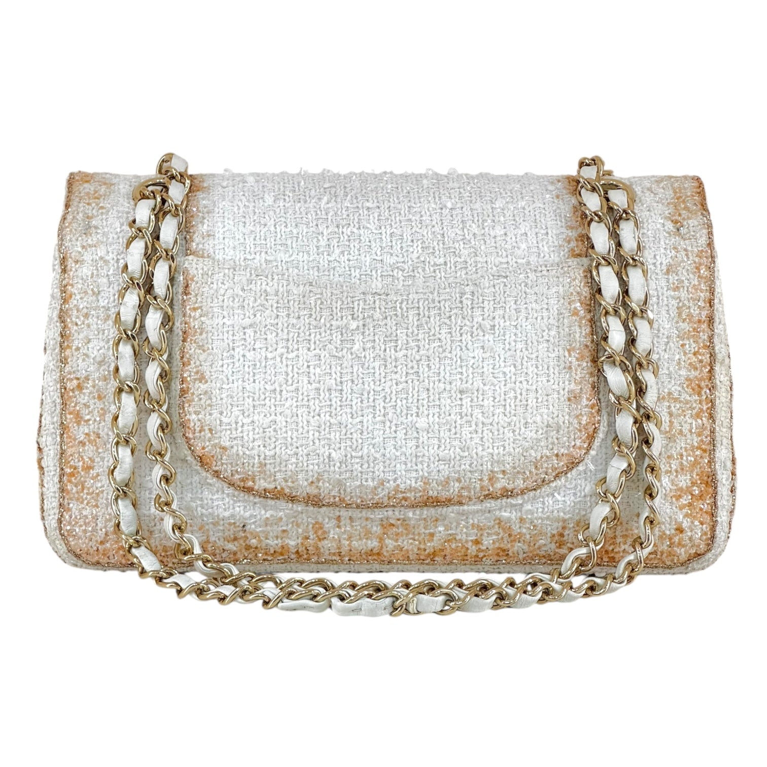 This exquisite Chanel Double Flap Bag captures the maison’s timeless elegance with a modern, ethereal twist. Crafted from white tweed, it features delicate gold glitter trimming that shimmers subtly along the edges, adding a touch of glamour to its classic silhouette.