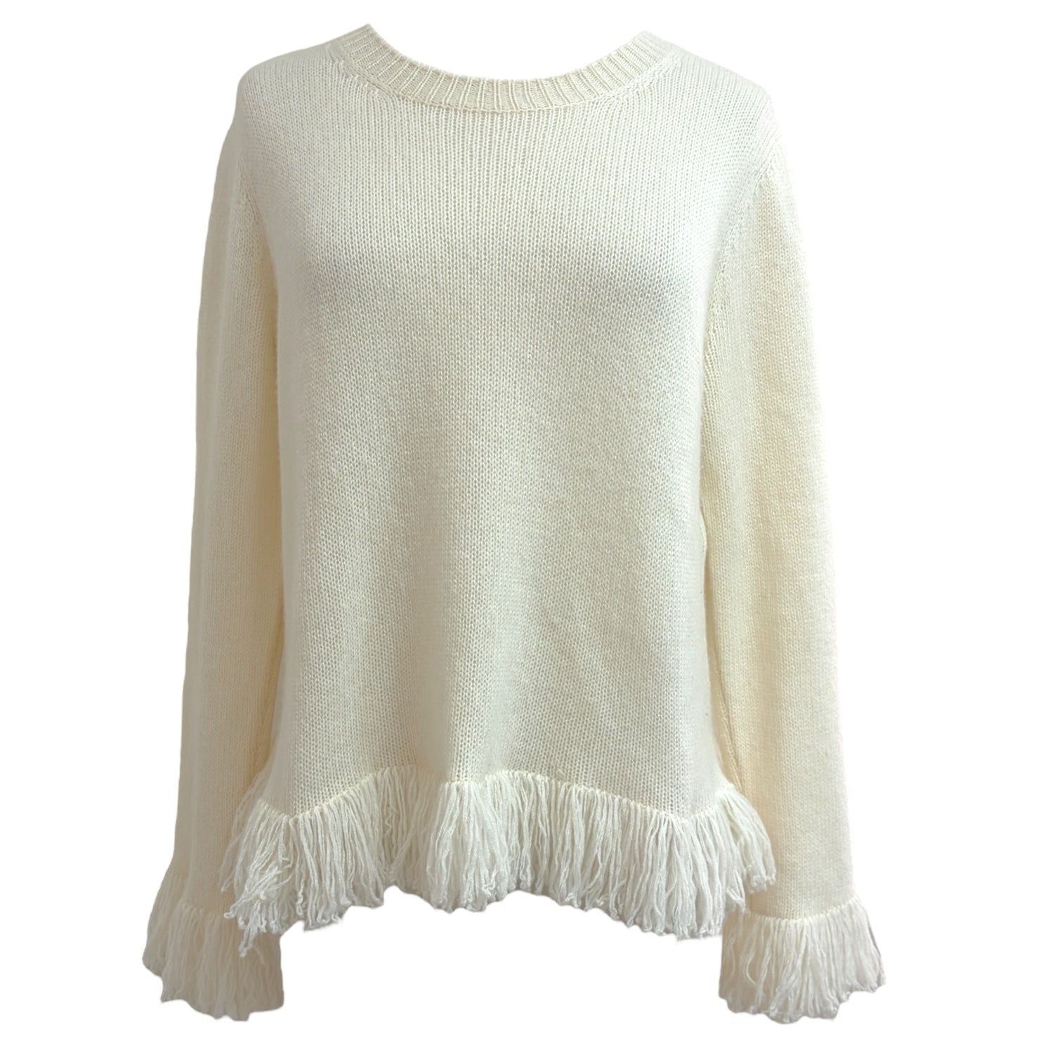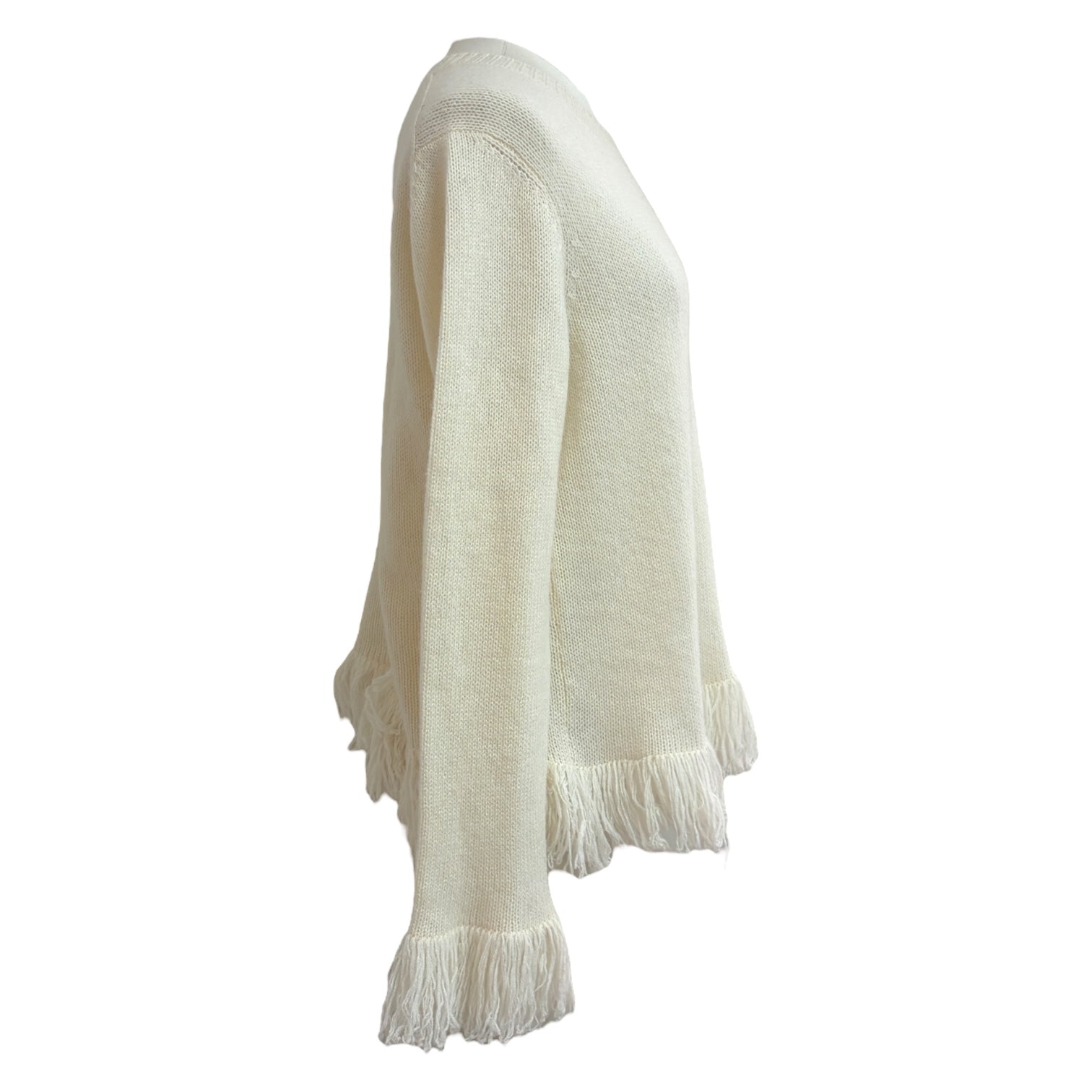 Luxurious Christian Dior sweater crafted from ultra-soft cashmere in an elegant cream tone. Designed with a relaxed fit and refined fringe detailing along the cuffs and hem, this piece embodies understated sophistication and timeless Parisian chic. Perfect for elevating both casual and dressy ensembles with a touch of effortless Dior elegance.