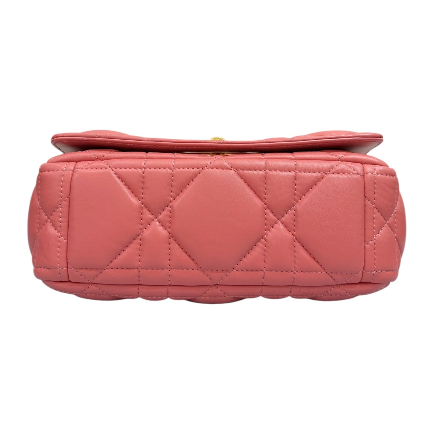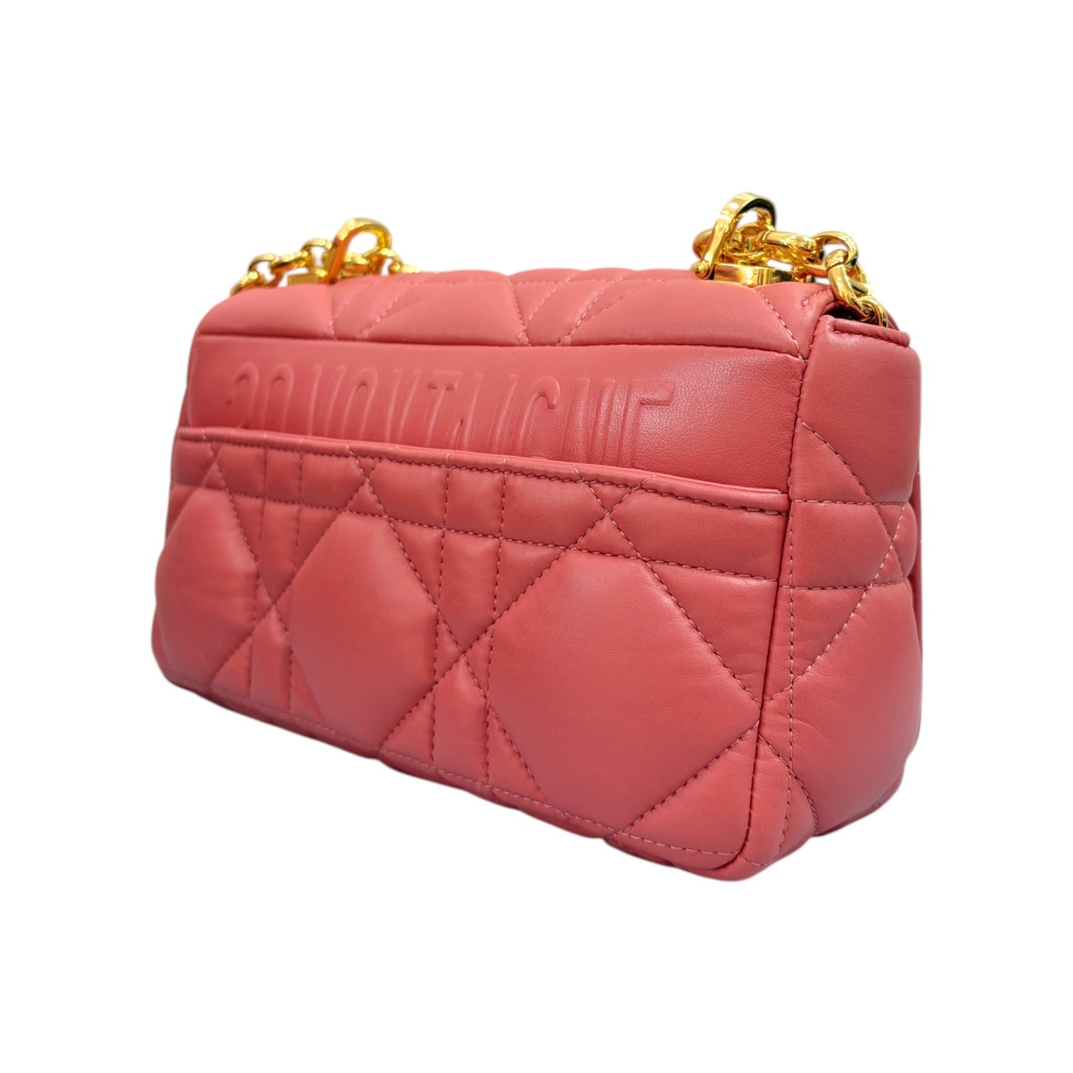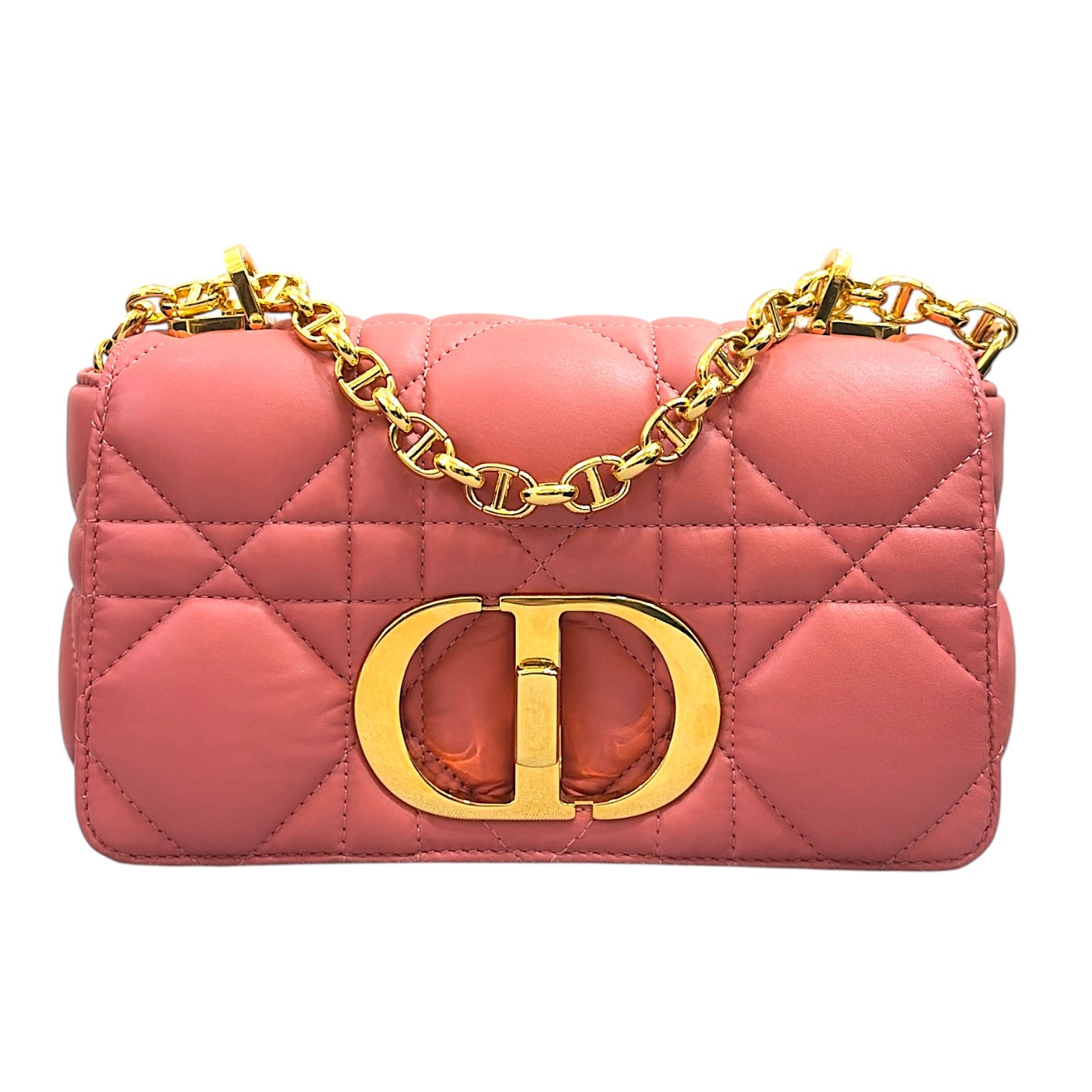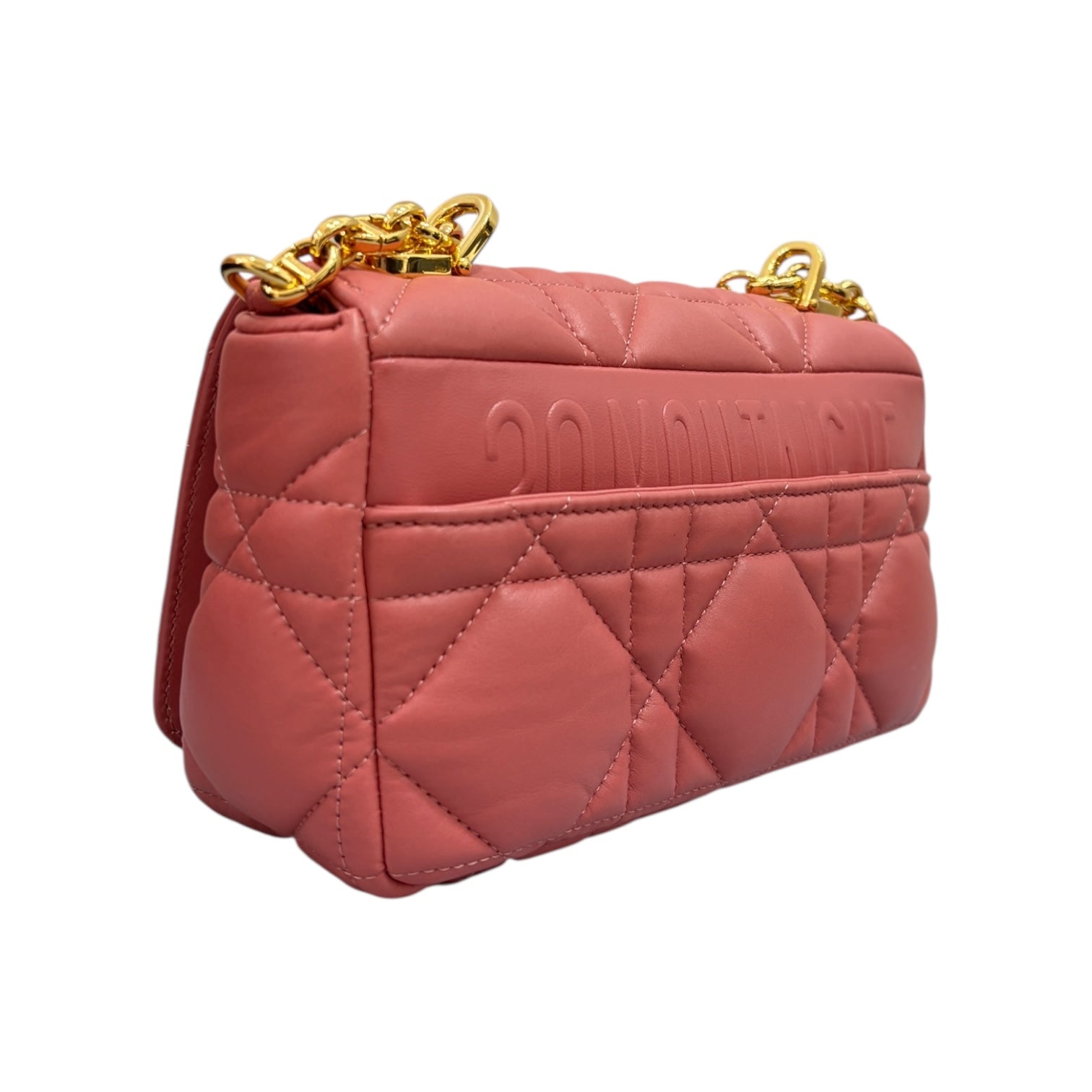 A beautifully feminine Christian Dior Small Caro Bag crafted from soft pink lambskin leather with the iconic Cannage quilted pattern. The bag features the signature CD clasp in gold-tone metal, inspired by the seal of Dior perfume bottles, and a sliding chain strap that can be worn on the shoulder or crossbody. The flap design opens to a compact yet functional interior with smooth leather lining and multiple compartments, offering both luxury and practicality. A timeless piece that embodies Dior’s modern elegance and Parisian charm.