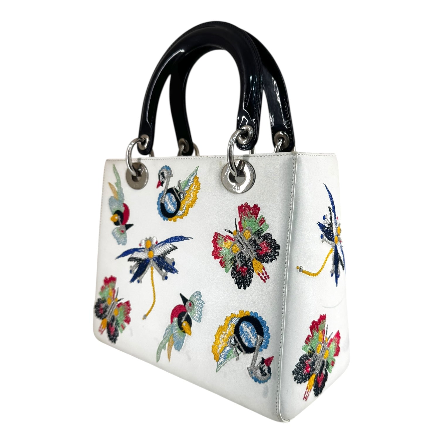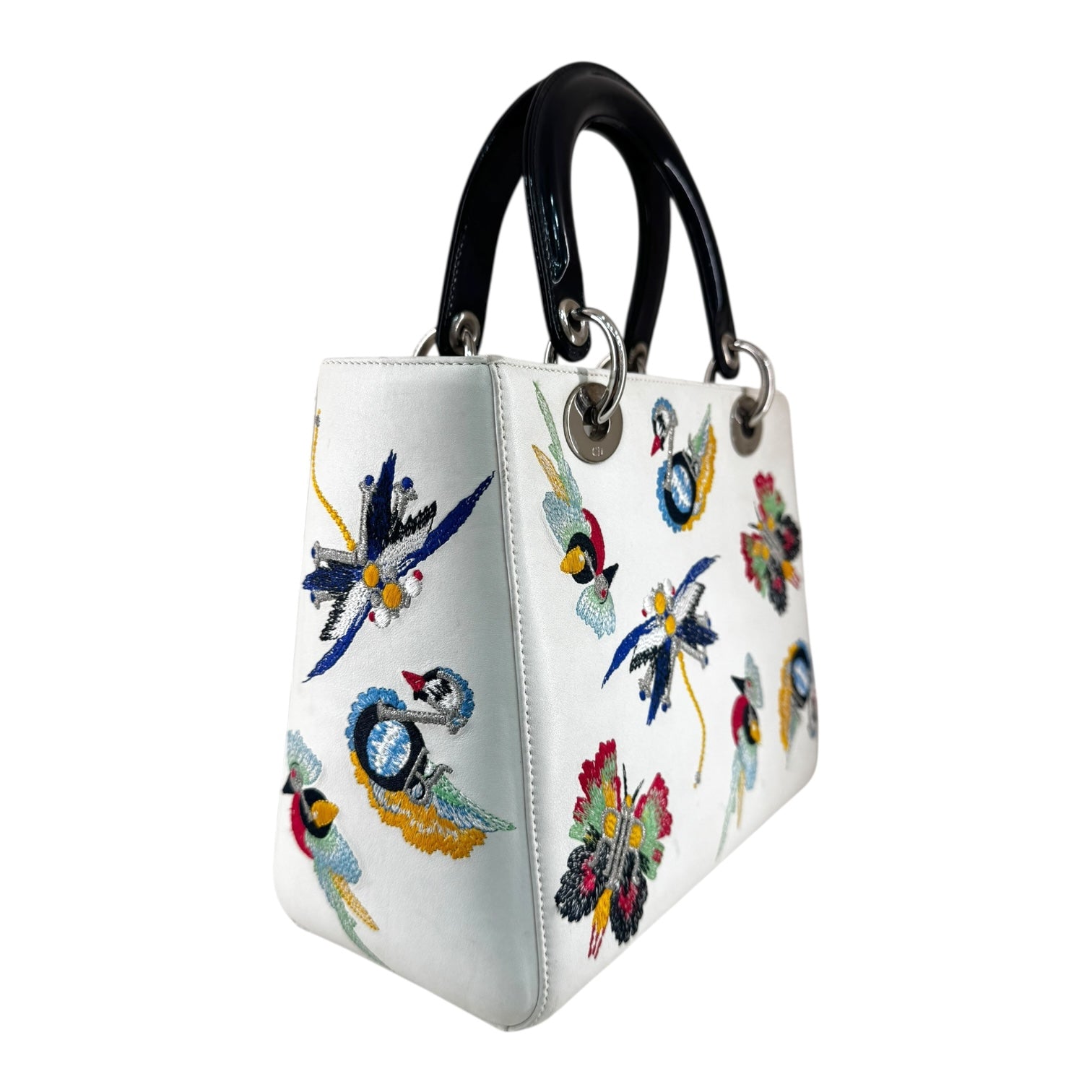 A stunning reinterpretation of the iconic Lady Dior, this medium bag is crafted from smooth white calfskin leather, exquisitely embroidered with multicolour floral and dragonfly motifs that celebrate Dior’s couture artistry. Each embroidered detail adds texture and vibrancy, making this piece a true work of wearable art.