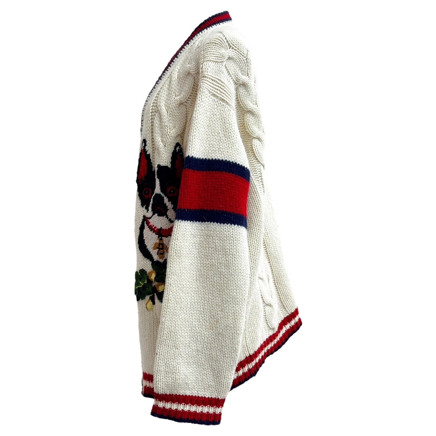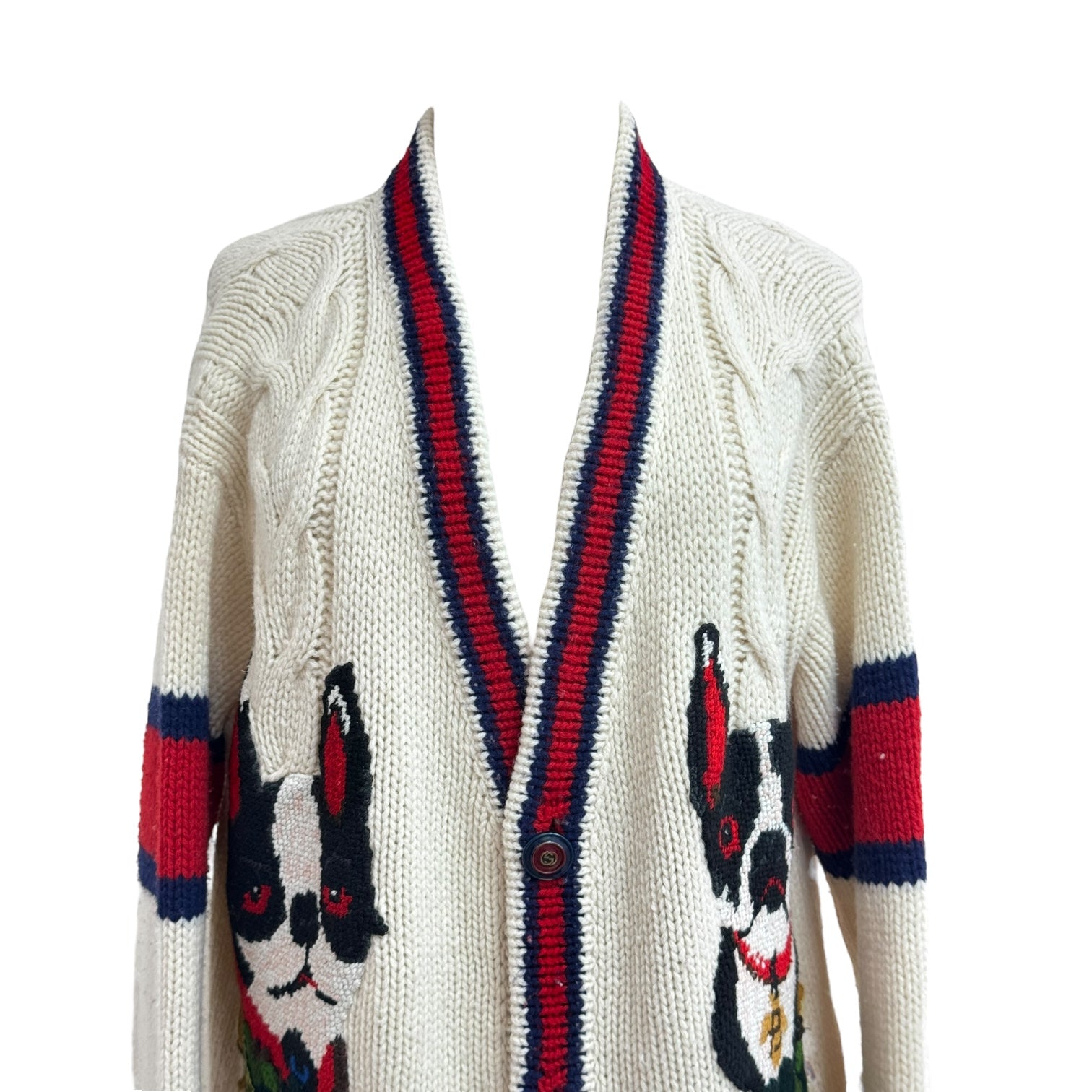Playful Gucci wool cardigan in ivory cable knit, detailed with the house’s signature red and navy Web stripes along the sleeves, hem, and placket. Featuring bold embroidered dog motifs with floral accents on the front, this relaxed-fit knit combines Gucci’s heritage craftsmanship with whimsical, contemporary detailing. A standout layering piece that adds both charm and luxury to any wardrobe.