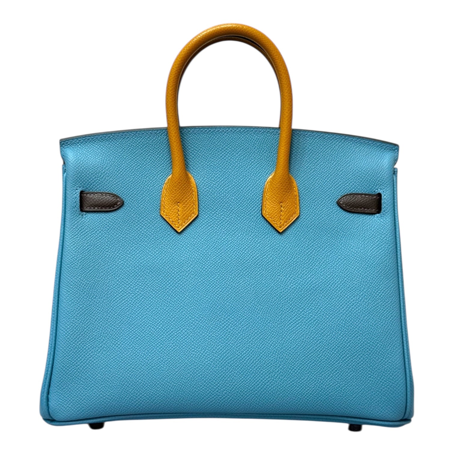 A rare and striking rendition of the iconic Hermès Birkin, this Birkin 25 is exquisitely crafted in a tricolor combination of Blue Jean, Écorce, and Sesame Epsom leather, offering a refined yet contemporary palette. The structured silhouette is accentuated by the crisp texture of Epsom leather — durable, lightweight, and beautifully resistant to wear.