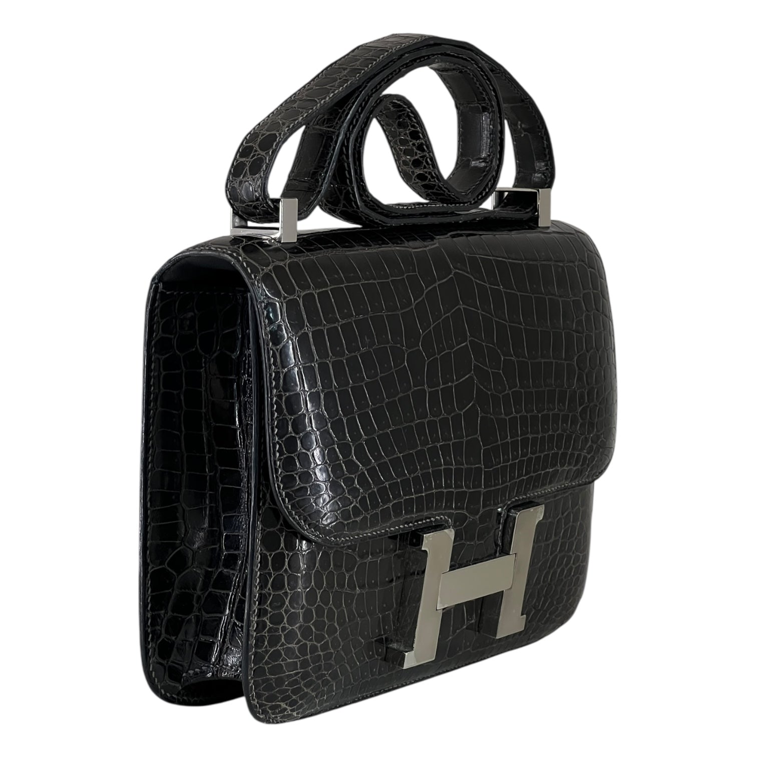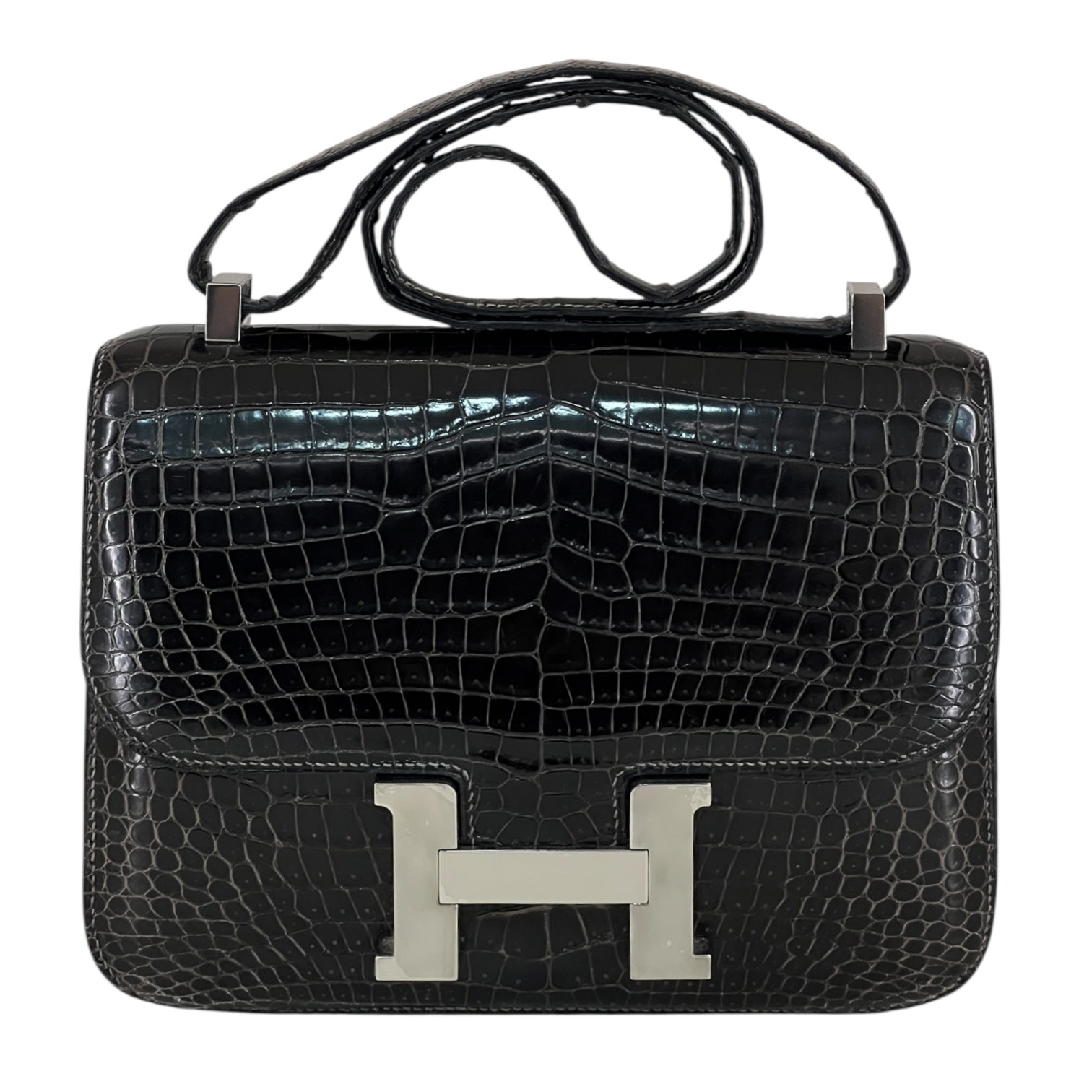 An icon of timeless elegance, this Hermès Constance 24 is rendered in shiny black crocodile leather, showcasing the brand’s mastery of exotic craftsmanship. The sleek silhouette is accentuated by the signature ‘H’ clasp in polished palladium, striking a perfect balance between sophistication and modern minimalism.