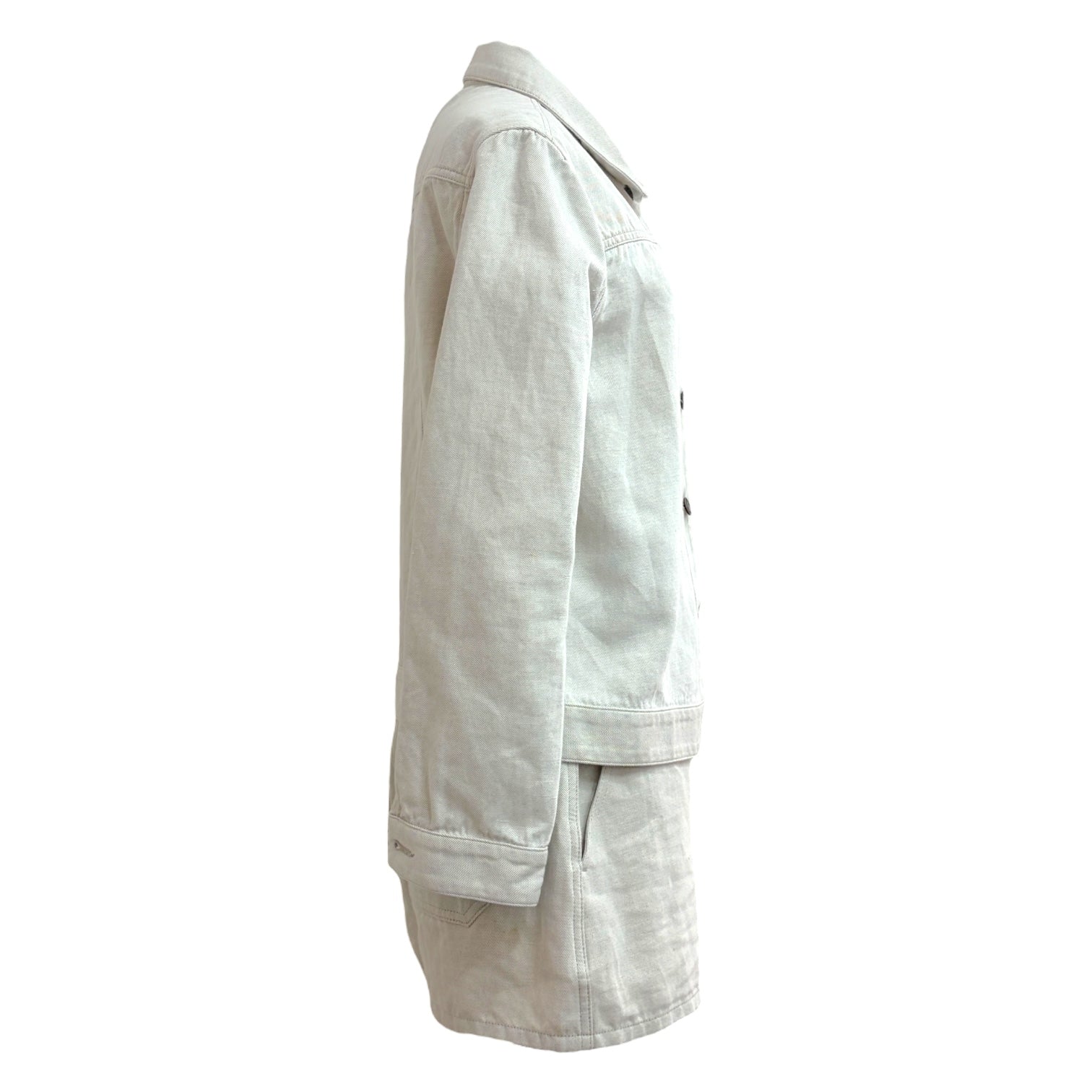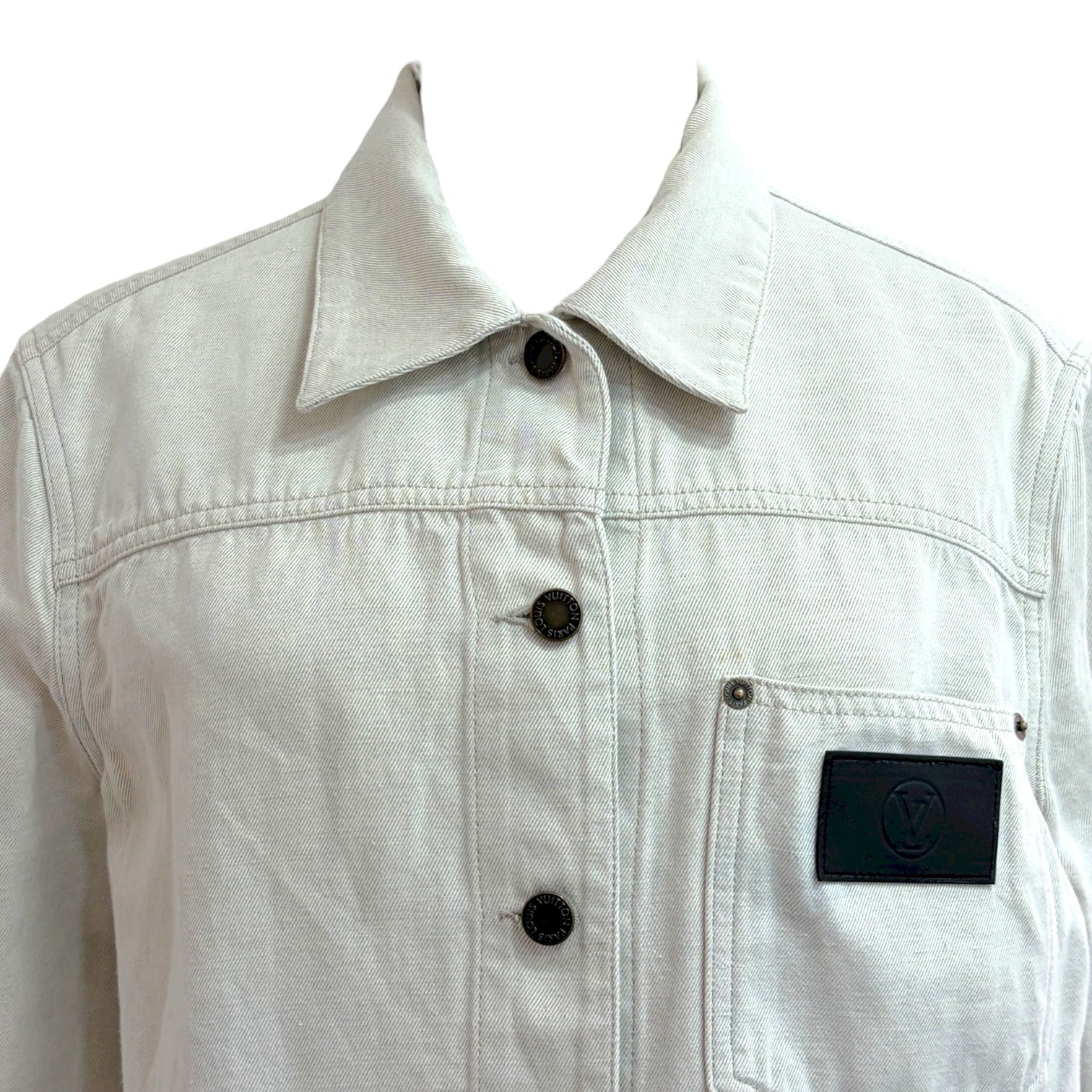 sEffortlessly stylish Louis Vuitton co-ord set featuring a light beige denim jacket paired with matching shorts. Crafted from premium cotton with a structured silhouette, the jacket showcases a front button closure, chest pocket adorned with the iconic LV logo patch, and tonal stitching throughout. The coordinating shorts complete the look with a relaxed fit for modern everyday chic. A timeless fusion of casual sophistication and luxury craftsmanship.