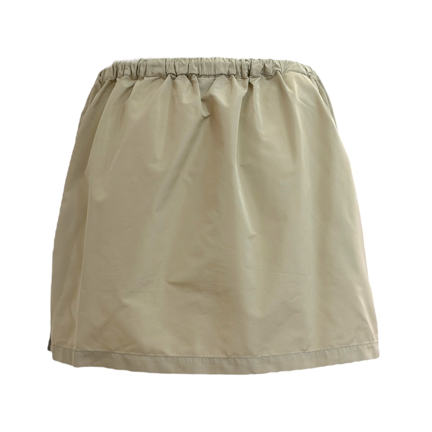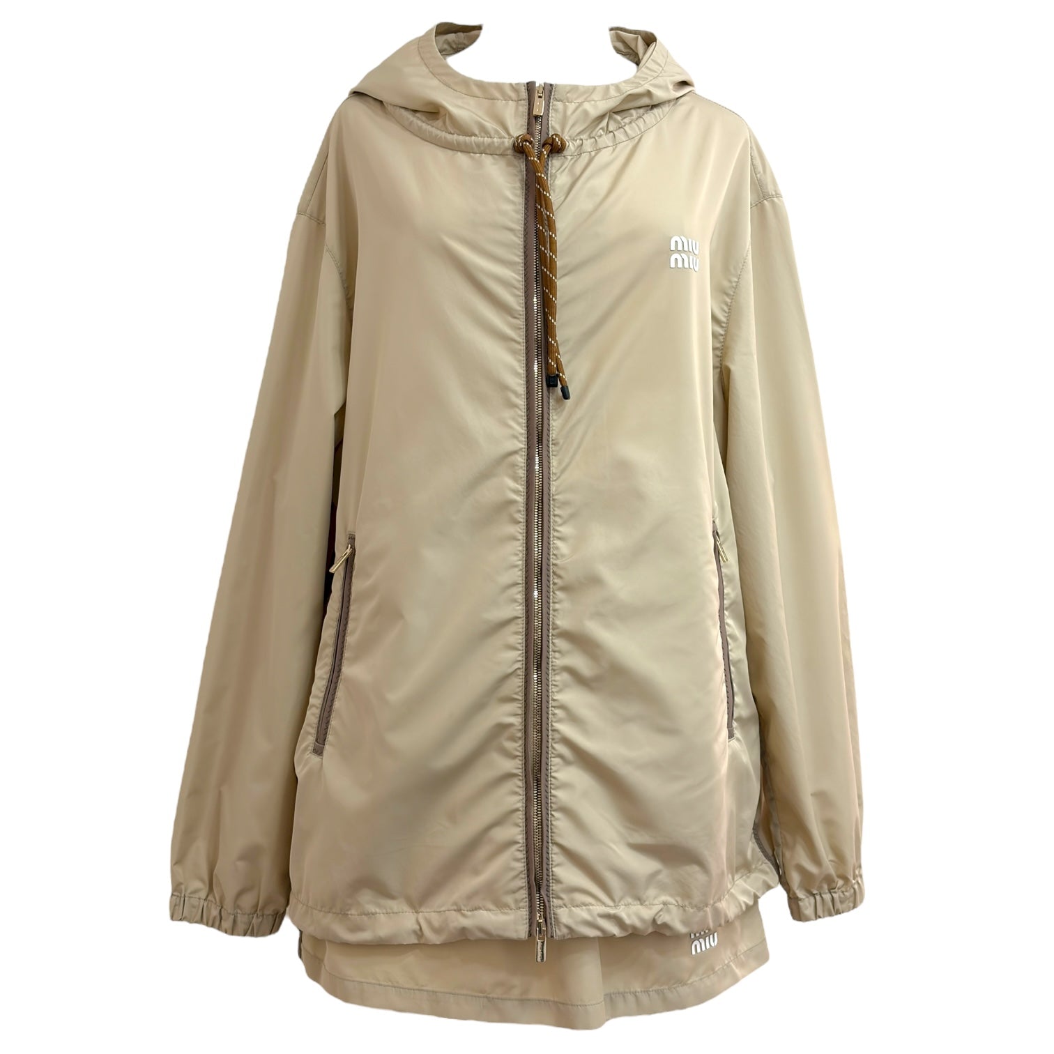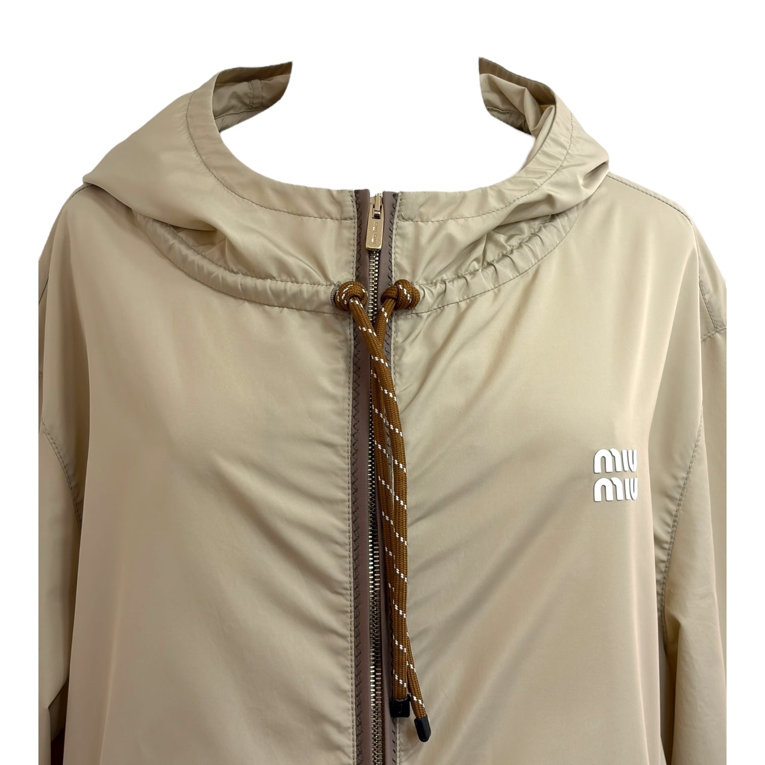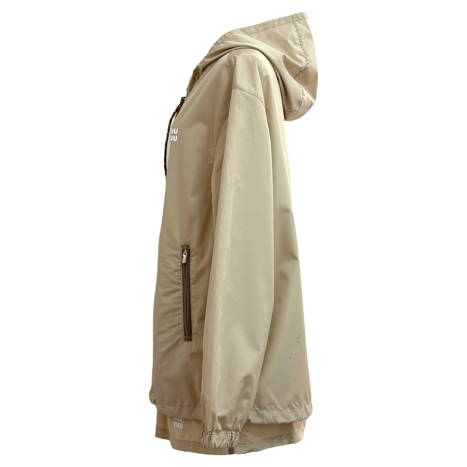 This Miu Miu beige hooded windbreaker set perfectly blends sporty utility with refined femininity. Crafted from lightweight nylon, the jacket features a full front zip closure, adjustable drawstring hood, and elasticated cuffs for a comfortable, structured fit. The signature Miu Miu logo subtly accents the chest and hem for a touch of understated luxury. Paired with a matching skirt, this coordinated set embodies the brand’s youthful and contemporary aesthetic—ideal for effortless, chic off-duty styling.